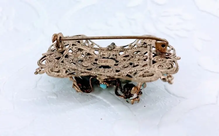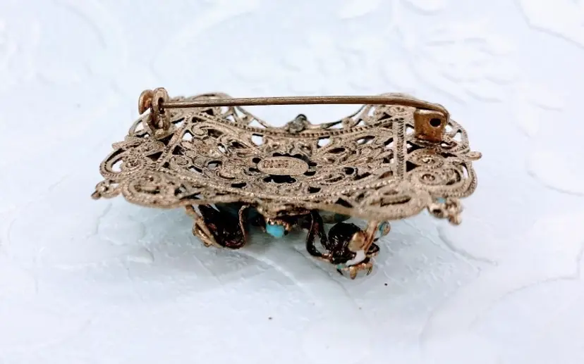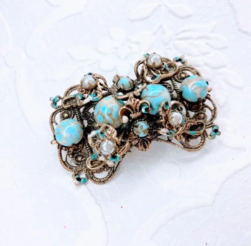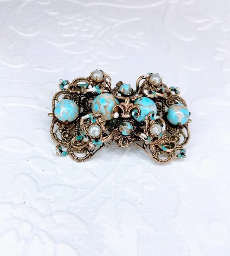 Intricate gold toned filigree with prong set Hubbell stone turquoise cabachons and faux pearls. Accents of blue, black, and white enamel on some of the filigree.