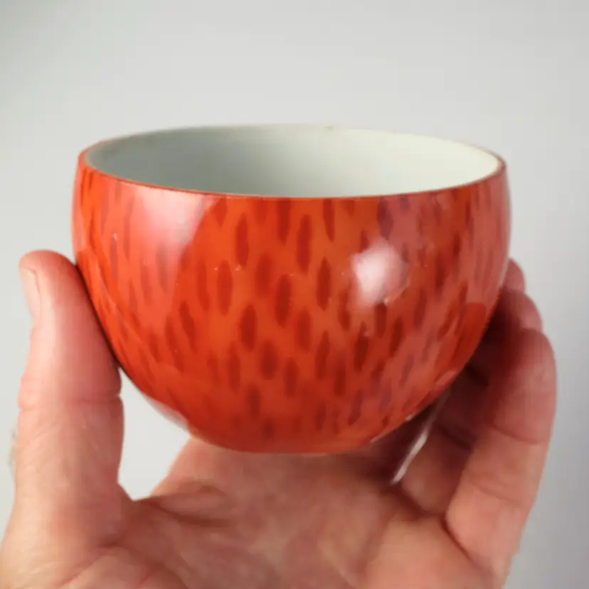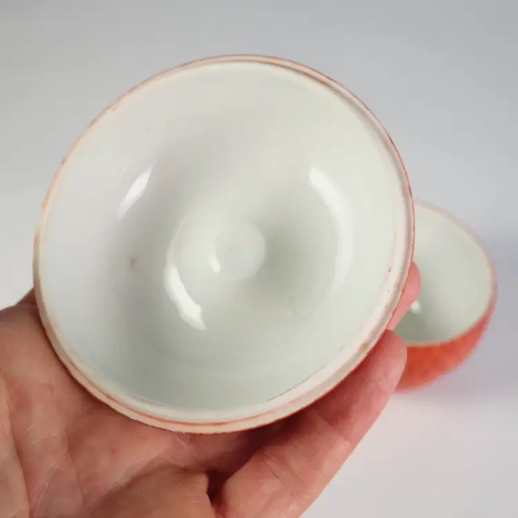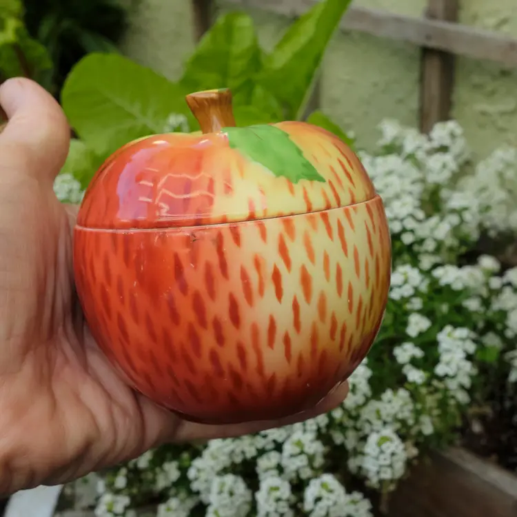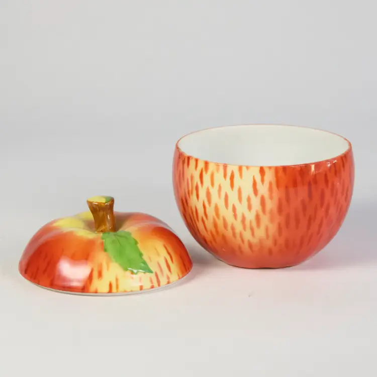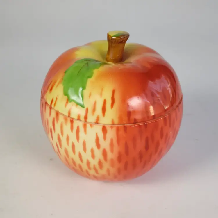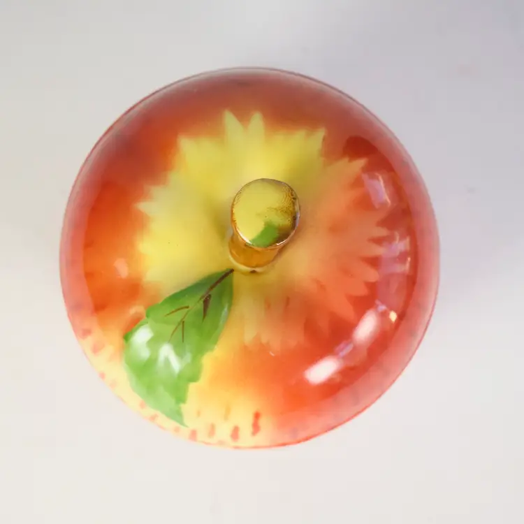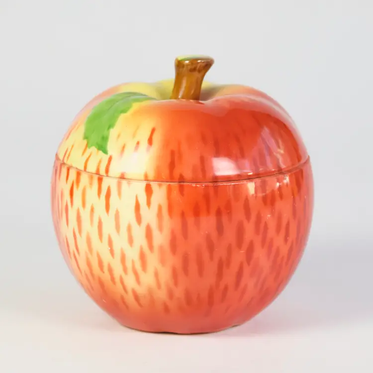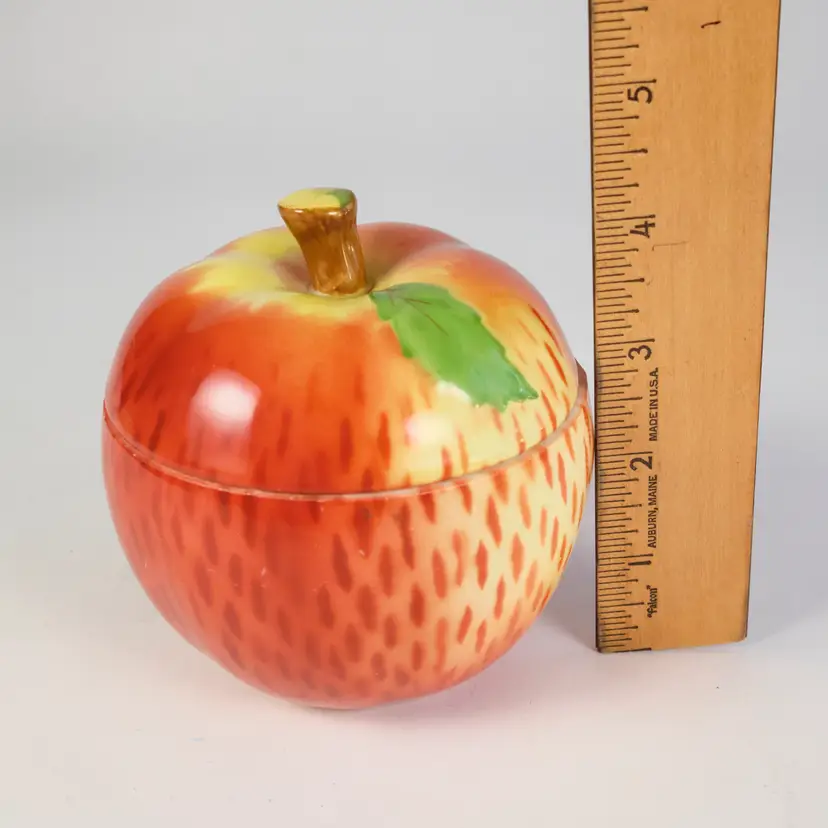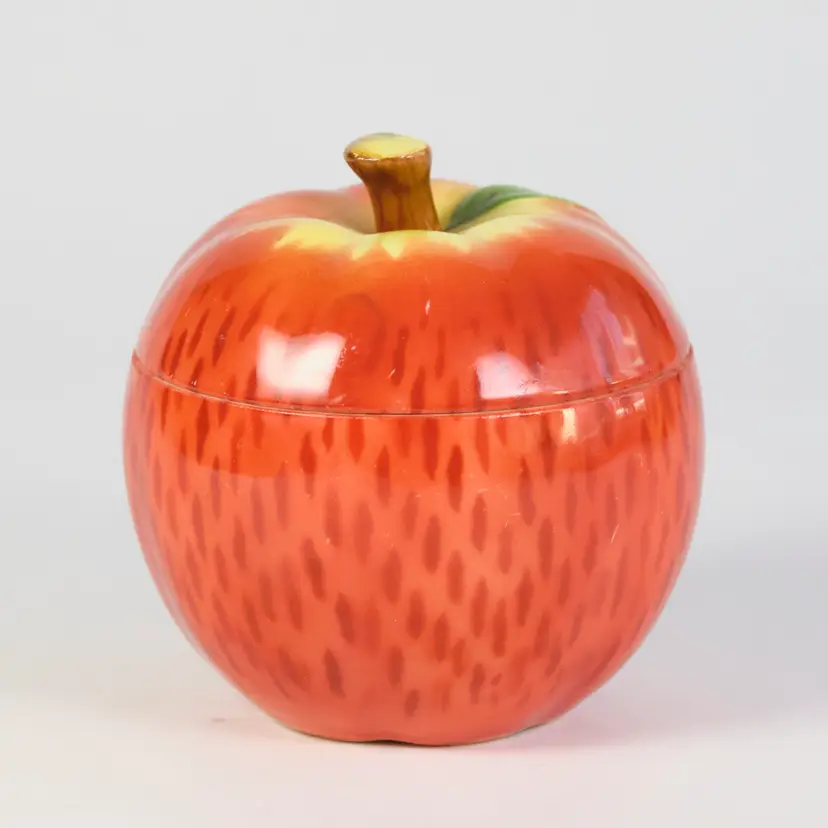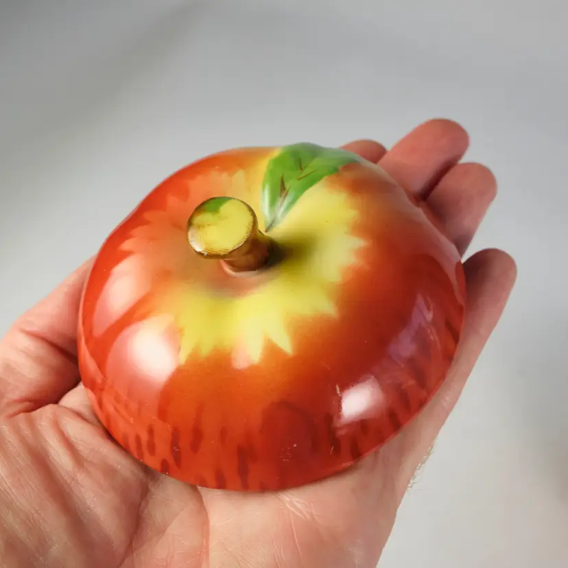 A vintage porcelain jam jar in the shape of a stylized apple with hand painted details in bright red and yellow. The jar is topped with an apple stem finial and leaf.
