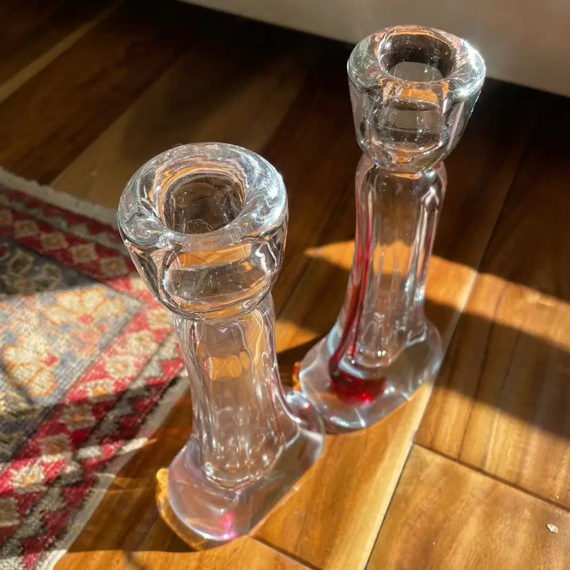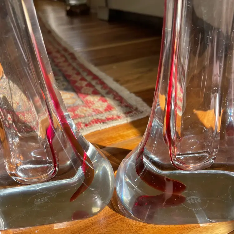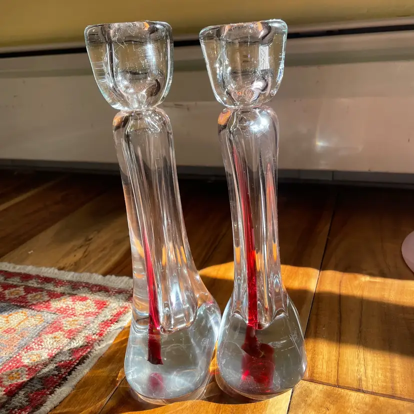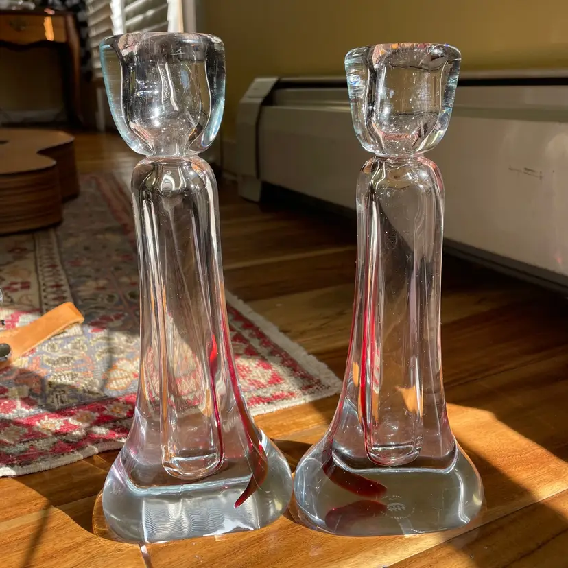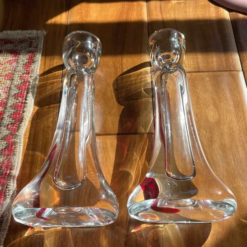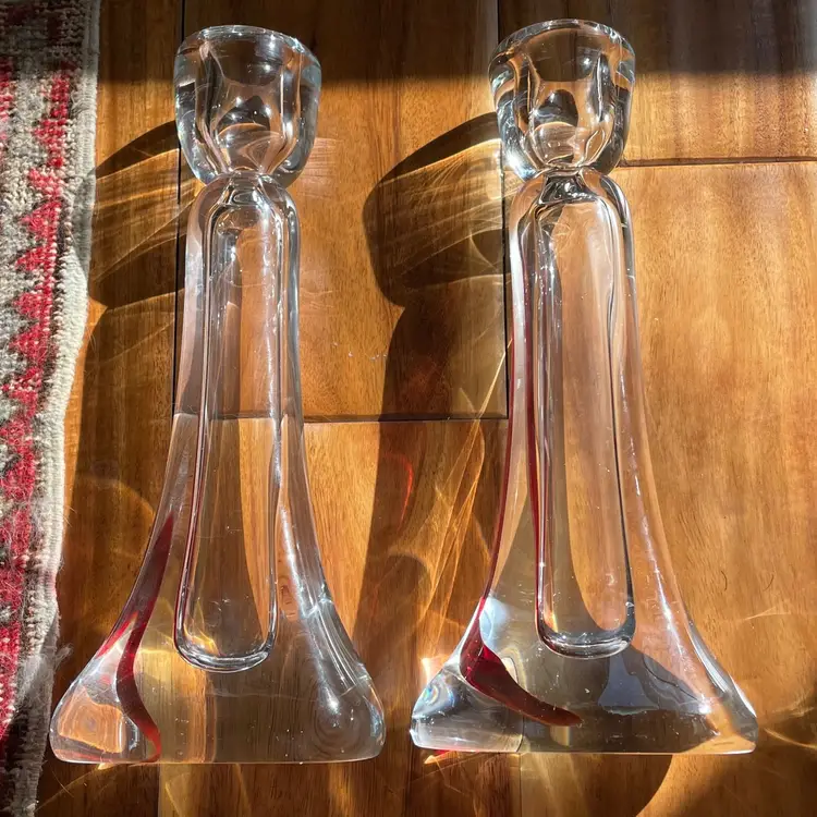 Add a touch of elegance to your home decor with this stunning pair of vintage Chribska candle holders, handmade in Czech Republic by Chribska (please see photo three for bottom stamp. It reads: Made in Czech Republic, 1414, Hand Made.). This pair is a one of a kind piece with no replicas. It is an abstract style with a single drop of red in heavy clear glass. Each candle holder stands 9.5 inches tall and measures 4 inches wide at the widest point at the base. They are in excellent vintage condition with no chips or cracks, with very minimal signs of use. Price is for the pair.