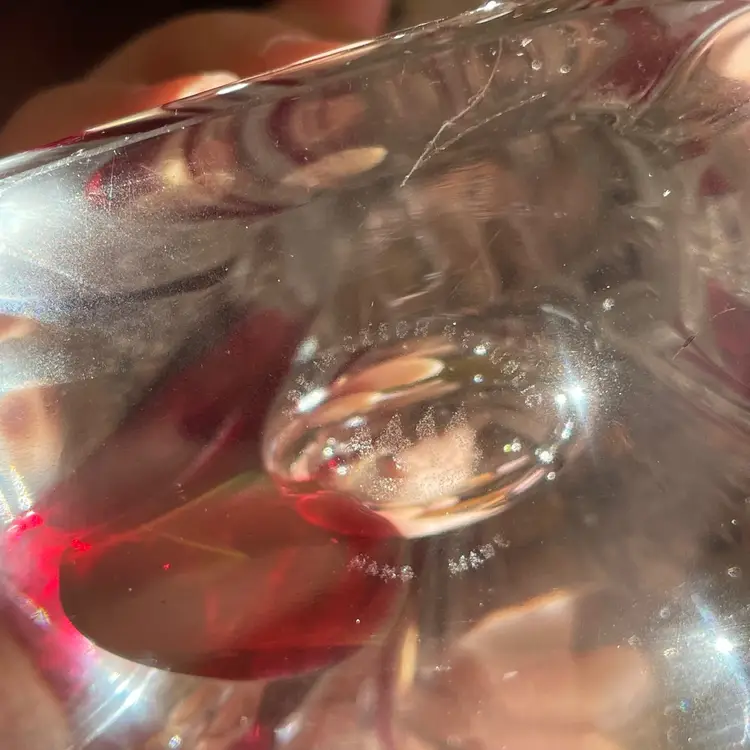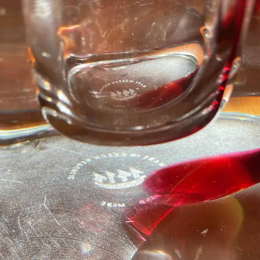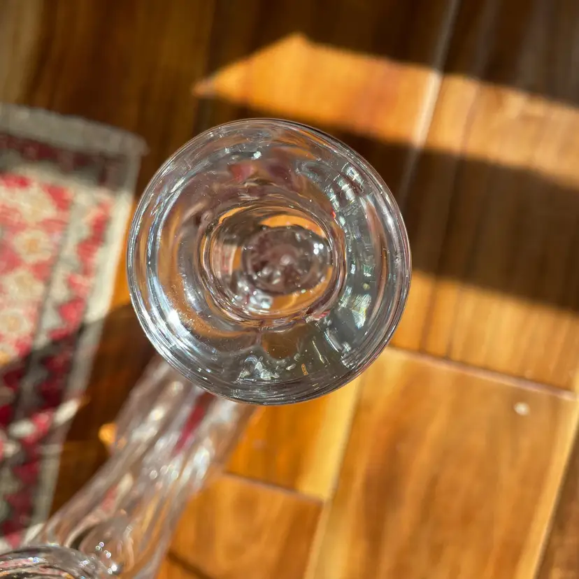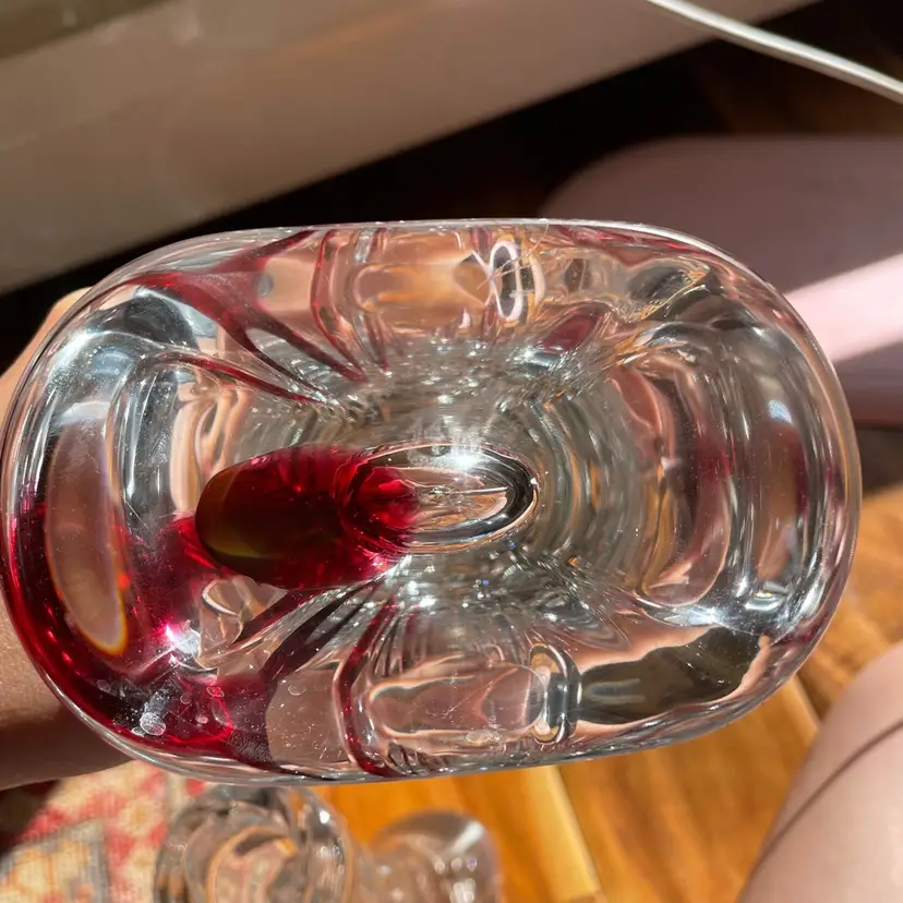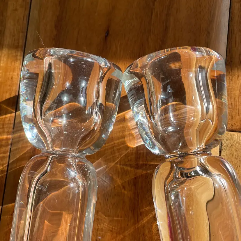 Add a touch of elegance to your home decor with this stunning pair of vintage Chribska candle holders, handmade in Czech Republic by Chribska (please see photo three for bottom stamp. It reads: Made in Czech Republic, 1414, Hand Made.). This pair is a one of a kind piece with no replicas. It is an abstract style with a single drop of red in heavy clear glass. Each candle holder stands 9.5 inches tall and measures 4 inches wide at the widest point at the base. They are in excellent vintage condition with no chips or cracks, with very minimal signs of use. Price is for the pair.