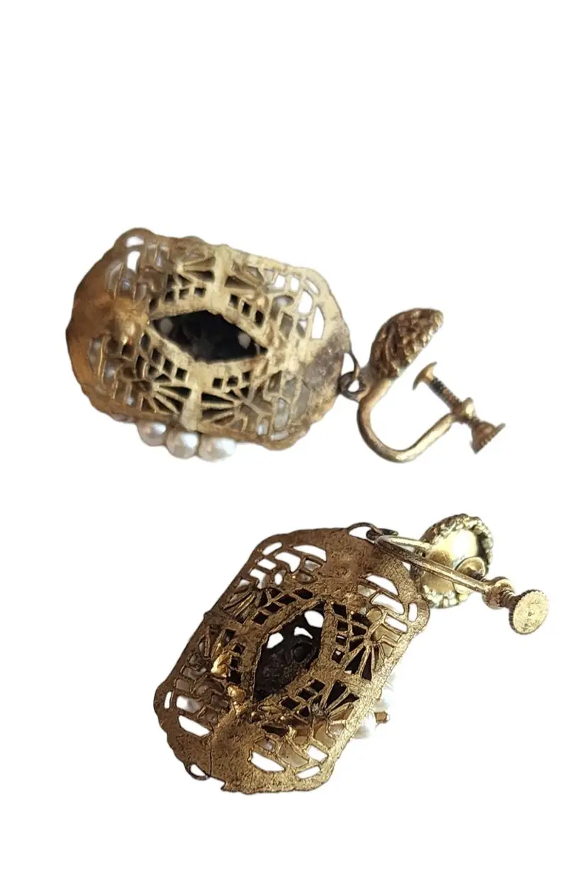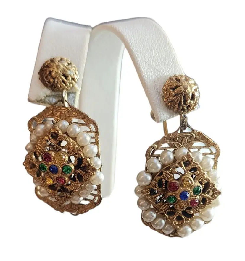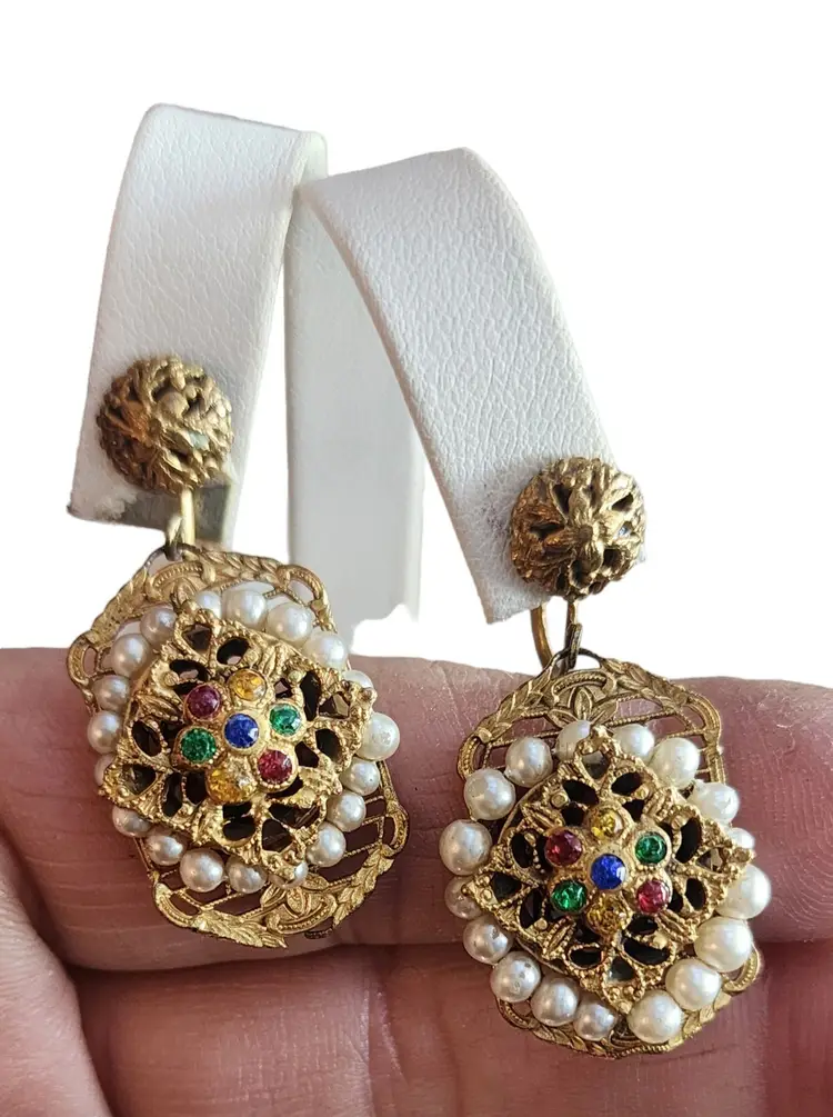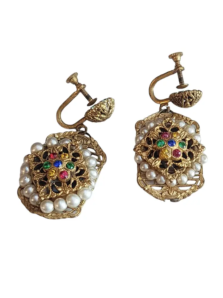 Vintage Czech Rhinestone Pearl & Filigree Screw Back Earrings (A4083)