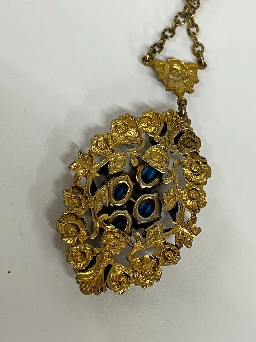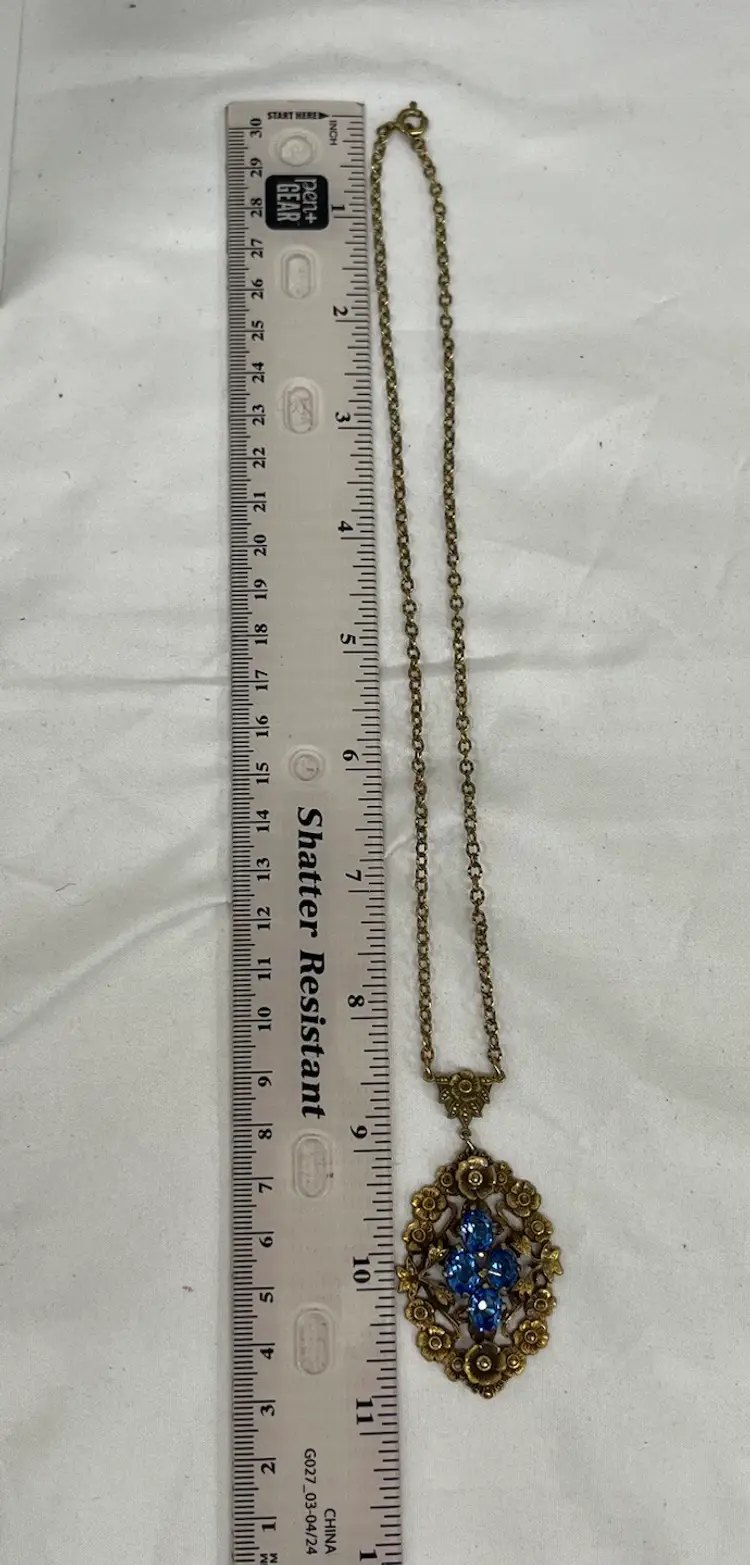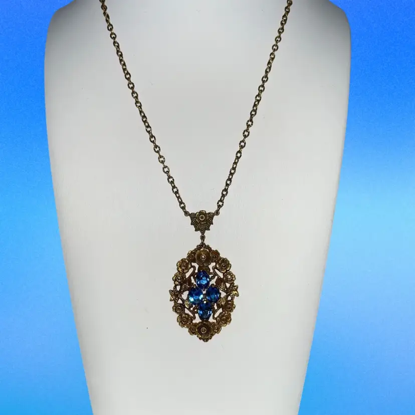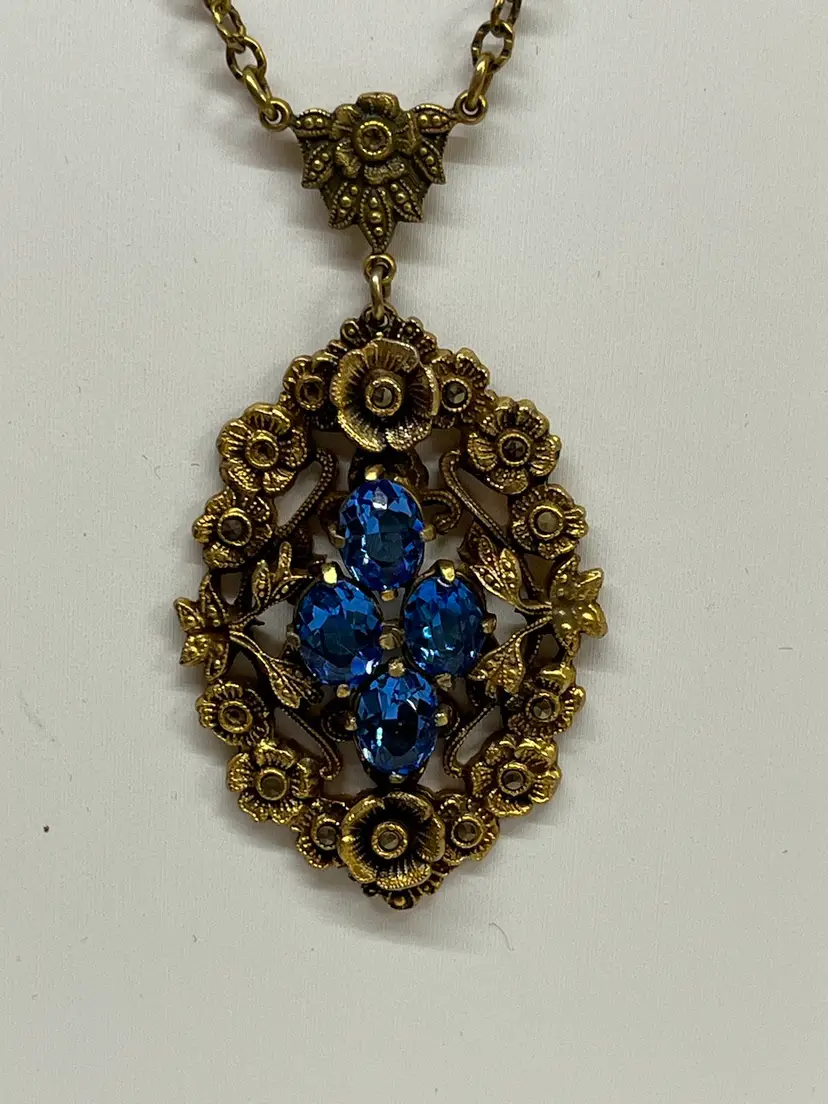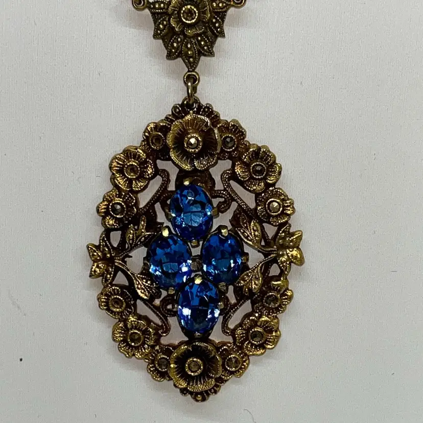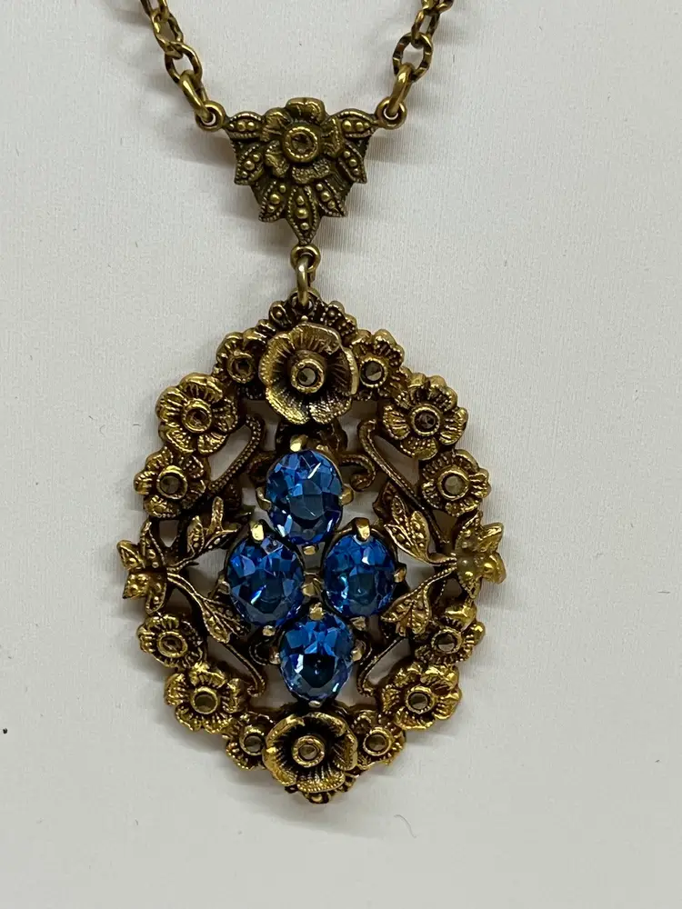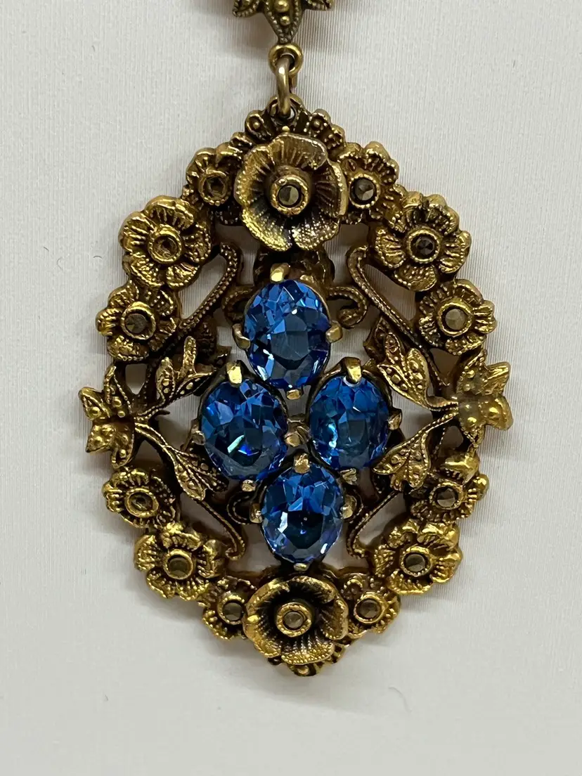 This gorgeous necklace is marked Czechoslovakia and features blue glass and what appears to be marcasite - there are a few marcasite stones missing. I have seen similar ones starting at $75.