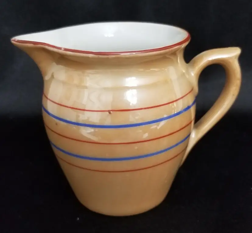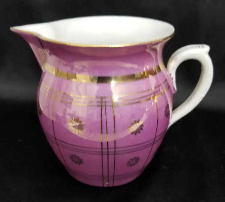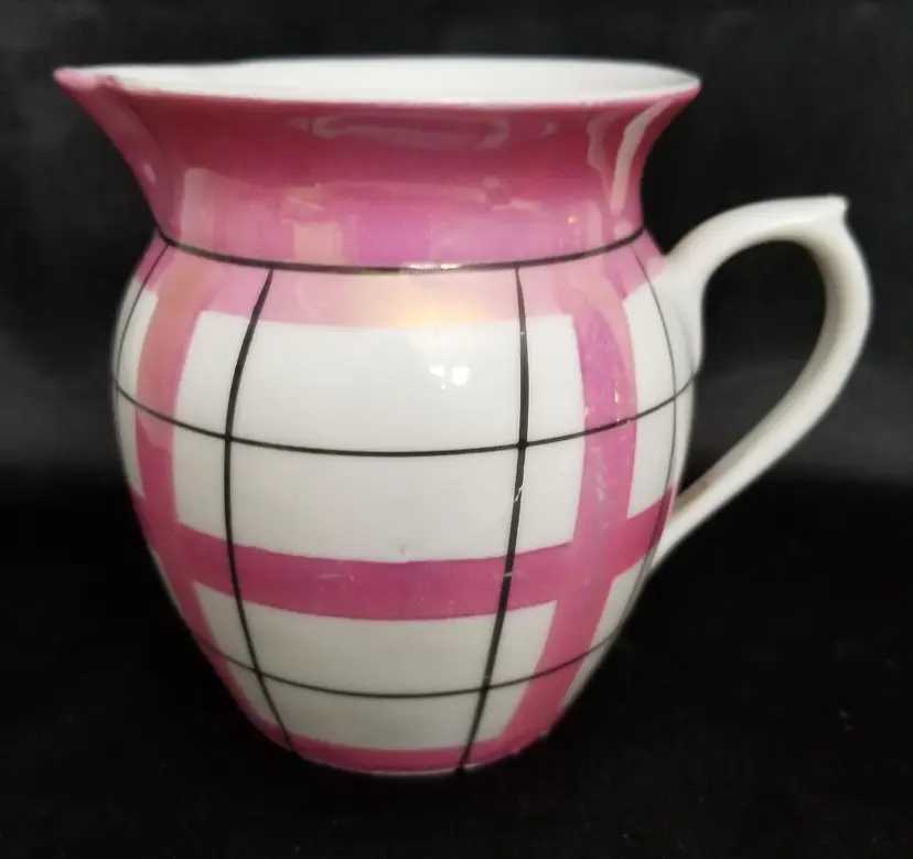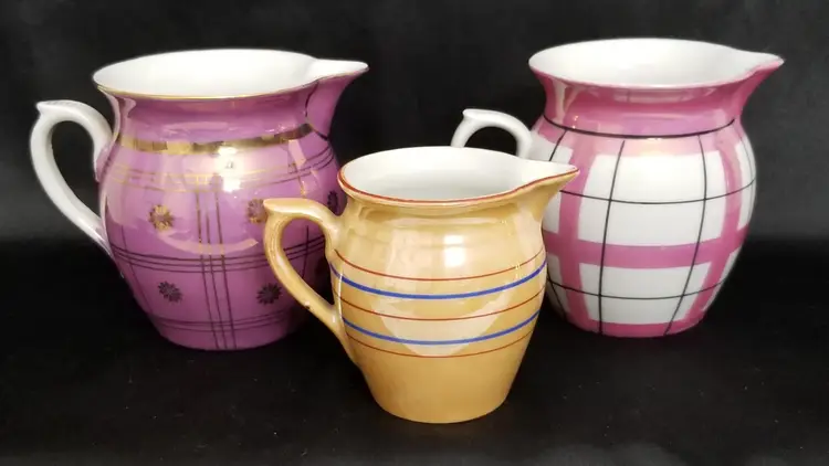 Vintage Czechoslovakian Luster Finish Porcelain Cream Pitchers, Set of 3. Both of the pink pitchers are 3 3/4" tall and show only slight wear. The copper stripe one is 3" tall and the bottom is marked 1/8 L, so I assume this was part of a measuring set, but no one will know that when it is one your shelf! It has a few flea bites around the top edge. No chips, cracks or repairs. Please view the pictures and feel free to ask questions. Thank you for visiting my shop.