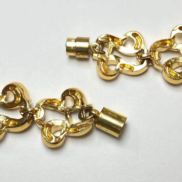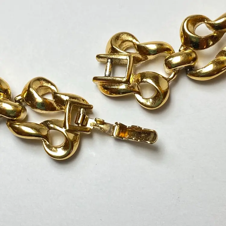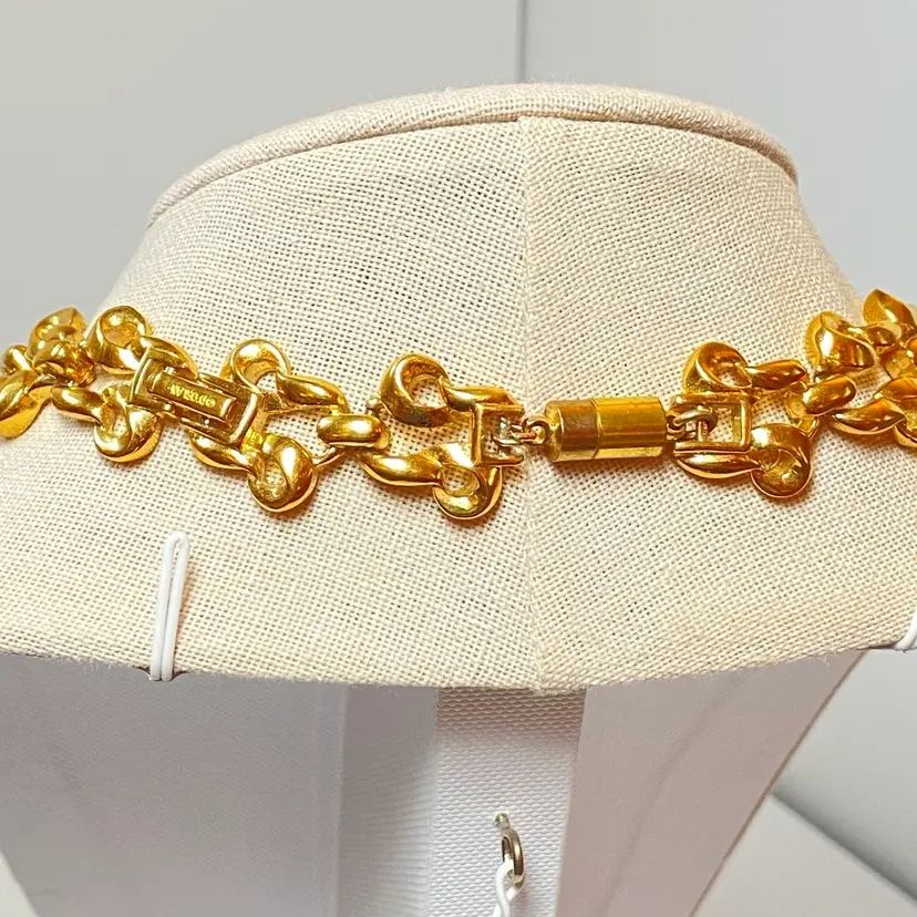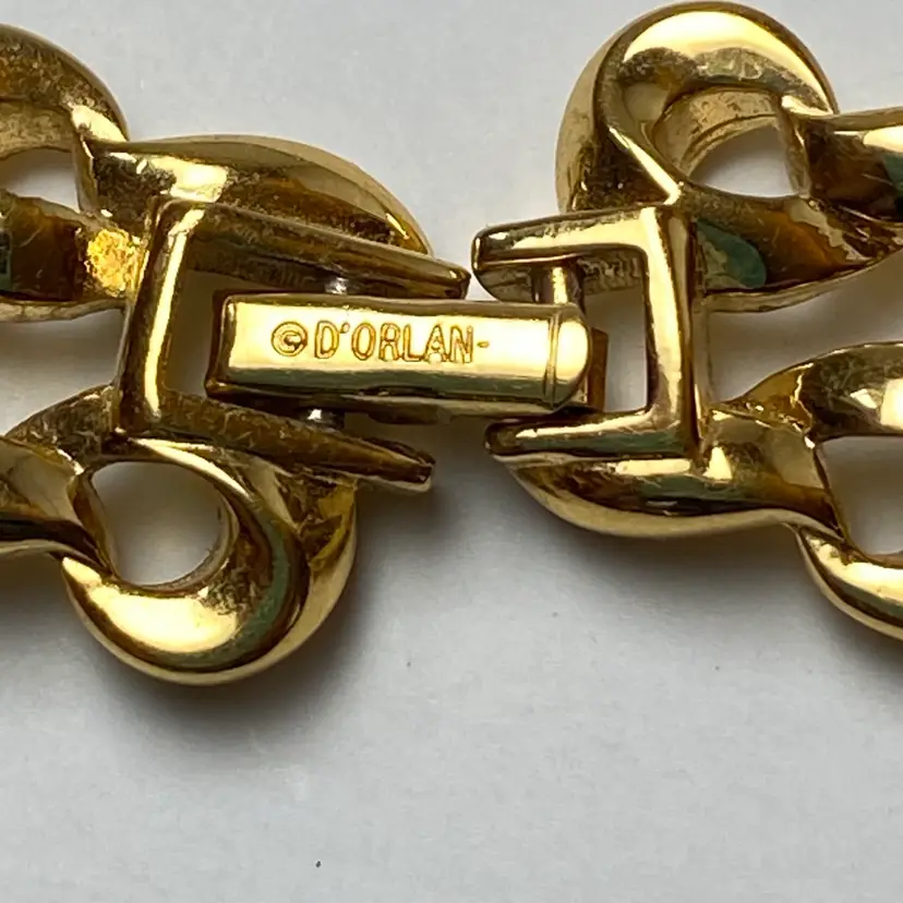 Add a touch of retro glamour to your look with this stunning vintage D'Orlan necklace. The interwoven chain link design is crafted from a shiny gold tone metal and measures 18 inches in length, making it the perfect statement piece. The fold over clasp and magnetic closure ensures easy wear. This necklace is signed by D'Orlan and is perfect for those who love bohemian, travel and places, and fashion and costumes themes. Whether you're dressing up for a special event or just adding some sparkle to your everyday outfit, this necklace is sure to turn heads.