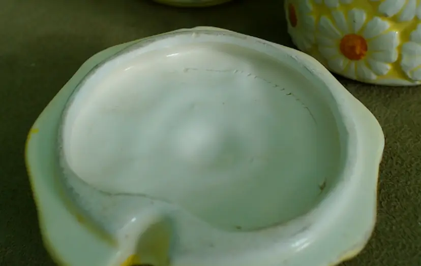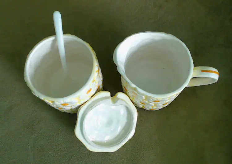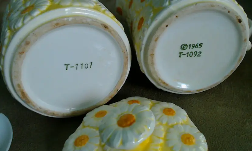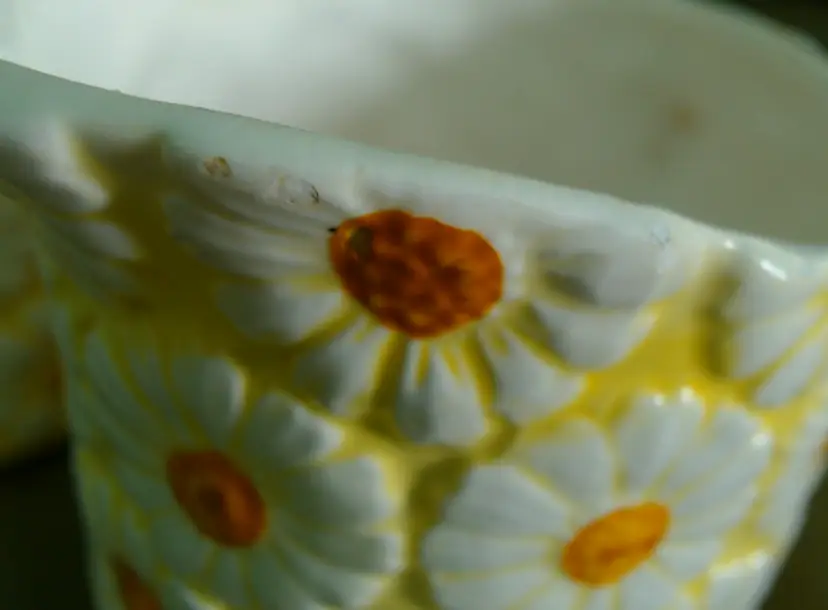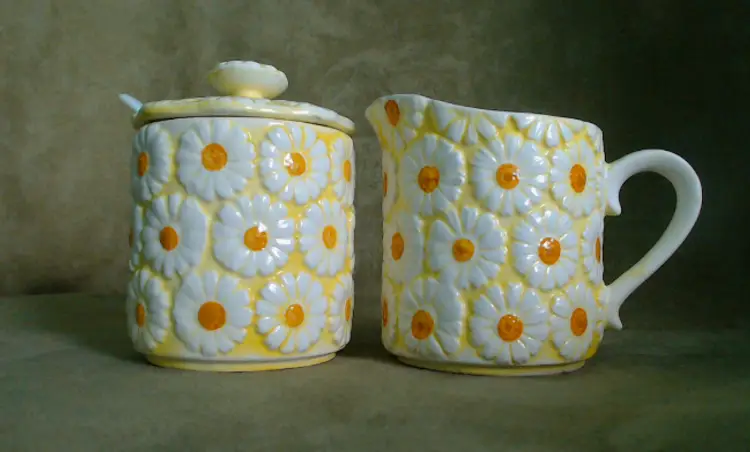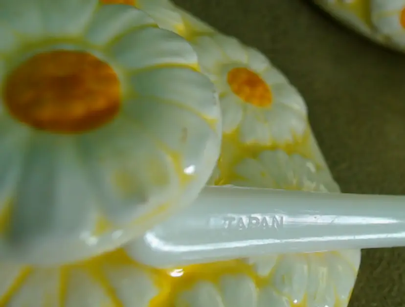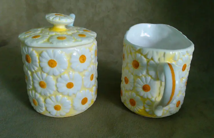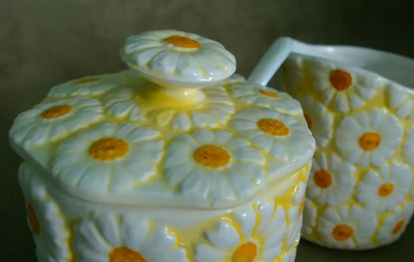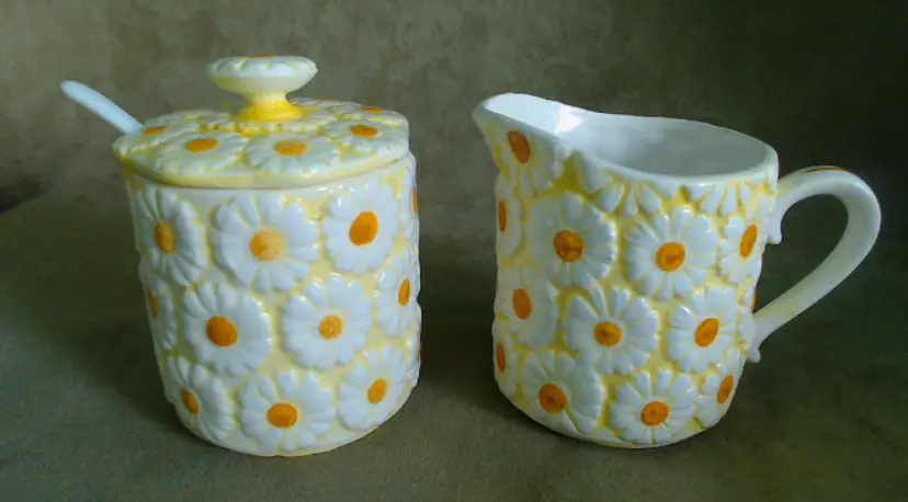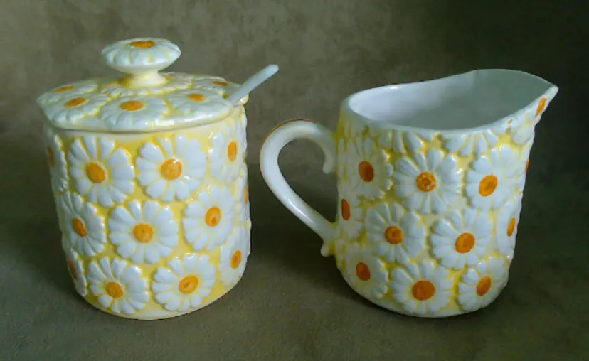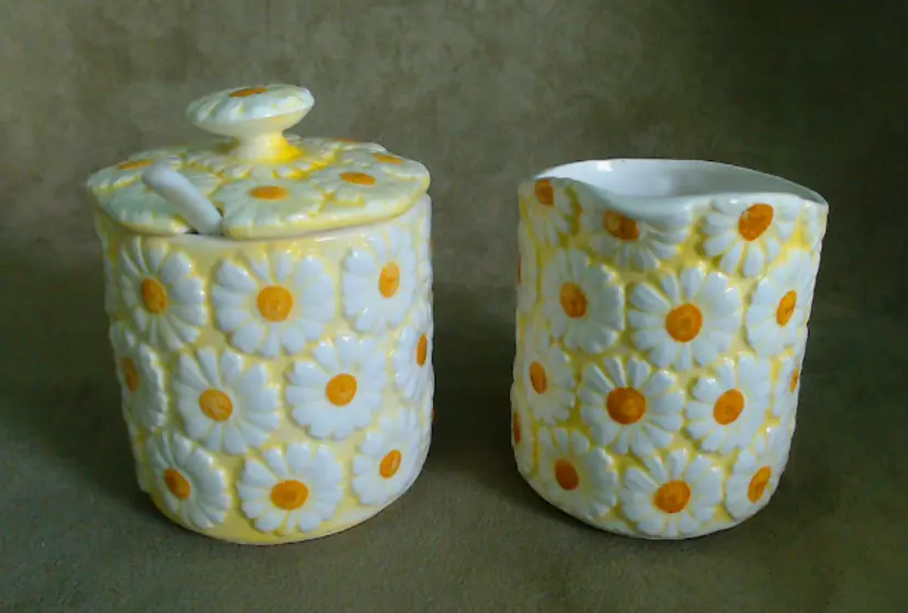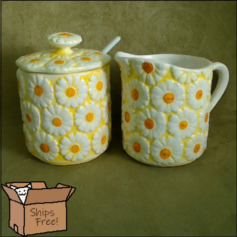 This is a vintage pair of pretty flowered dishes for your table! Made in Japan during the 1960s, for Brinn's, these daisy darlings were part of a whole kitchen line. This pair includes the creamer, and a matching lidded pot. The little pot was probably originally intended for jam, but as they were found together, I'm betting it makes a perfectly fine sugar dish too! Condition: This pair is in Good shape! While there are no major injuries, there are quite a few tiny nibbles to the glaze on the flower petals, especially near the base of the creamer. The glaze is the thinnest on these ridges, and I think they were rubbed often, between daily use and washing! I also spotted a glaze pop on the top of the jar lid, as well as one small chip on the underside of the lid. This pair is well loved, but it certainly has a lot more to give! Oh, and as a pleasant surprise, the pot even has the original plastic spoon. I don't know if elves scurry off with them, but those little spoons always go missing! Size: The creamer measures about 2¾" across, is 4½" across when including the spout and handle, and sits just over 3" high. The pot measures 2¾" across, is just under 3" tall, and is nearly 4" tall when including the lid.