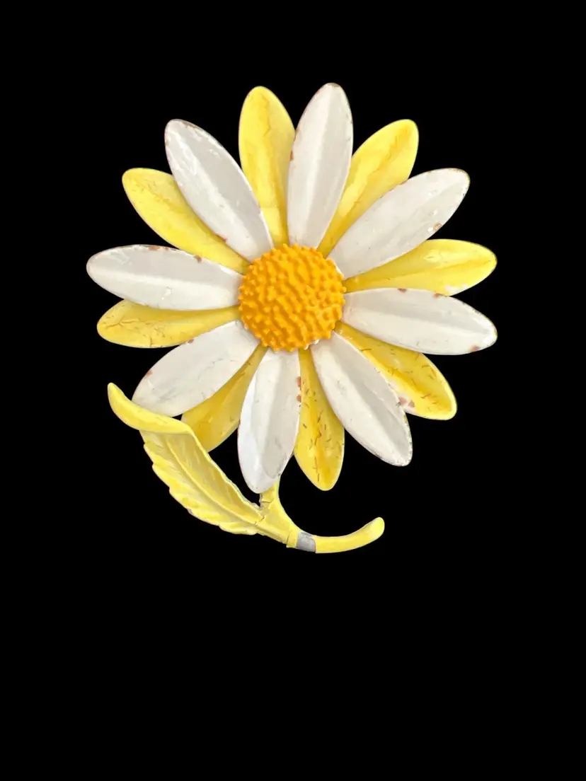 Vintage Daisy Flower Yellow & White Enamel Stem Leaf Textured Center Brooch