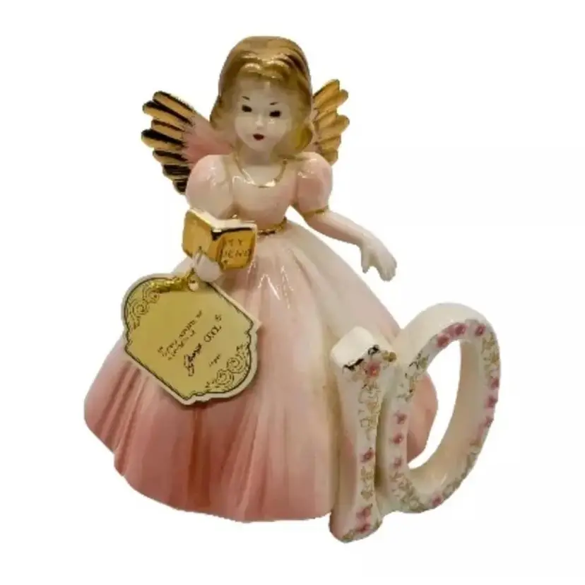 Celebrate a special girl's 10th birthday with this beautiful vintage Josef Originals Birthday Angel figurine. Hand-painted with intricate details, this porcelain piece features a colorful design that will brighten up any room. Perfect for collectors or as a gift for a loved one, this original figurine is part of the Growing Up Girls collection and features a glazed finish.