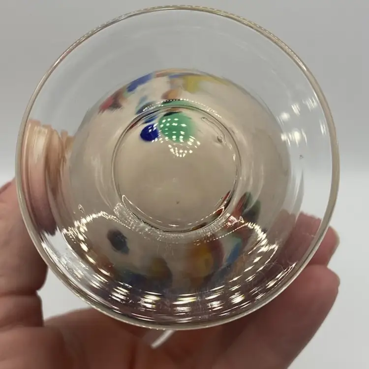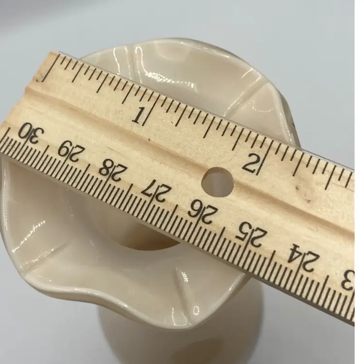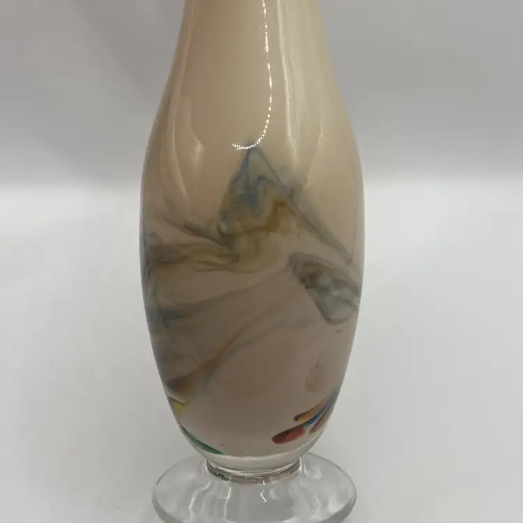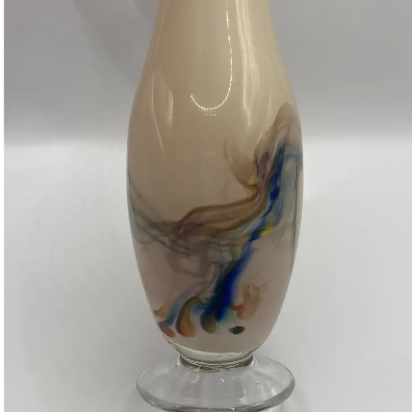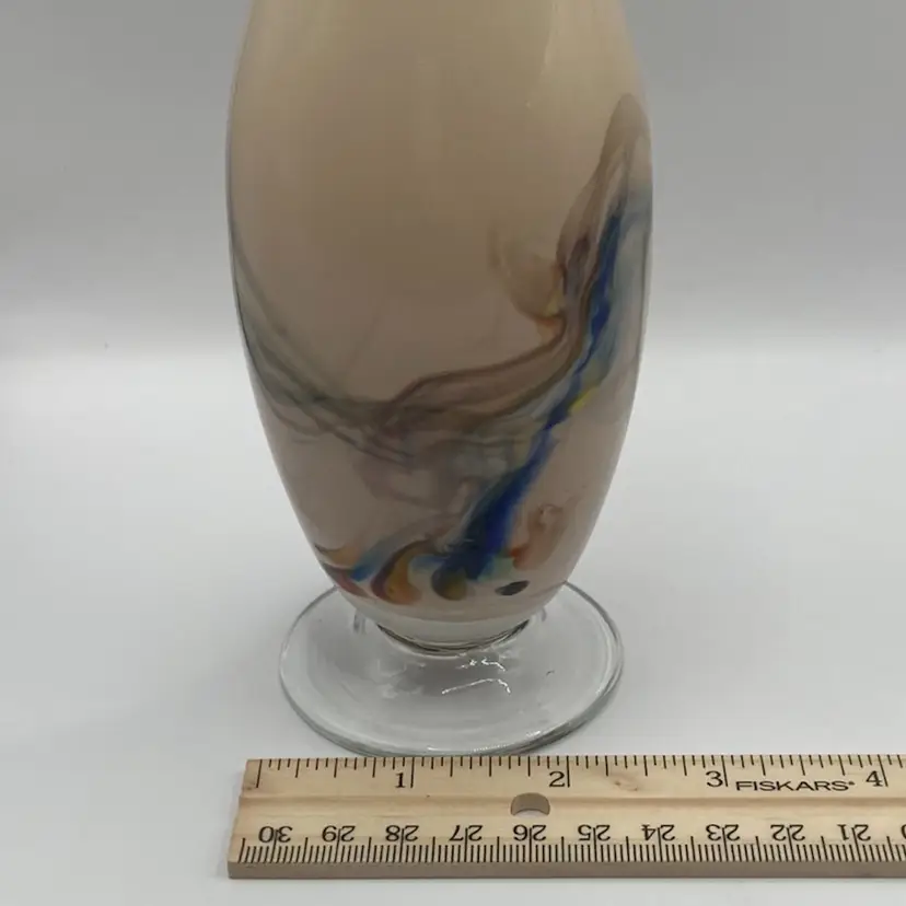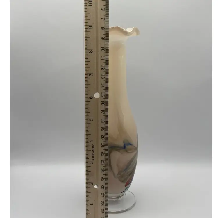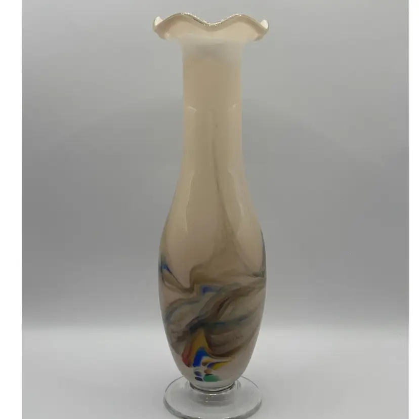 This cute vase has multicolored swirls on a light beige or faint peachy colored base. The ruffled rim makes it just so much morecute.