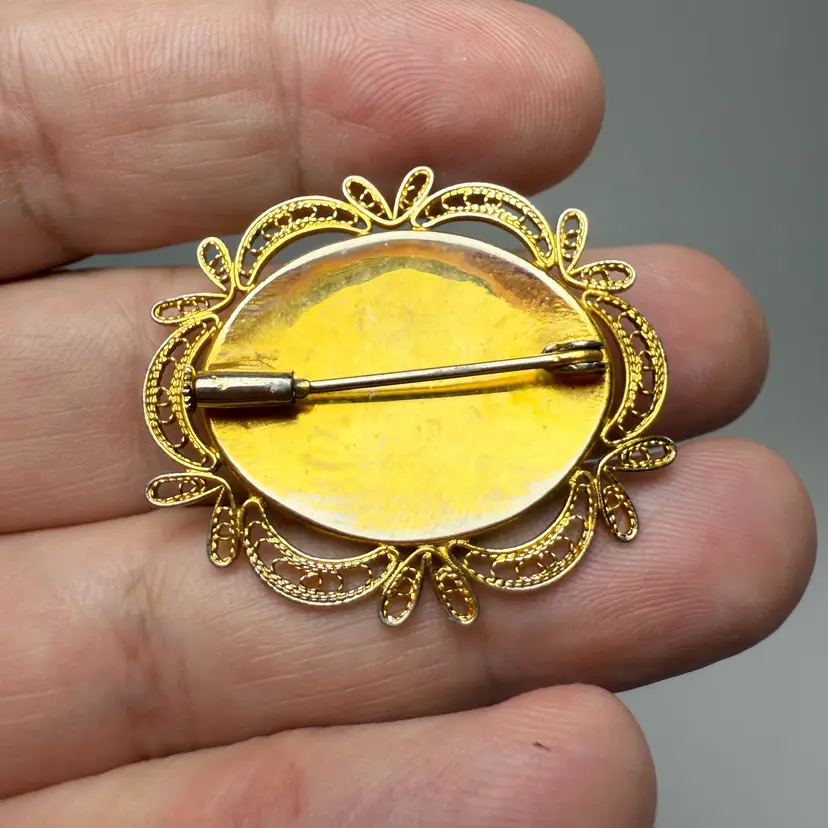 Vintage Damascene Bird Floral Brooch Pin Gold Tone Filigree Oval Trombone Clasp. Great condition. Very light wear. 1.5" across.