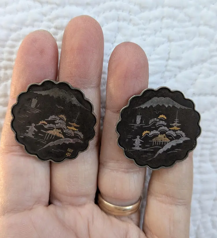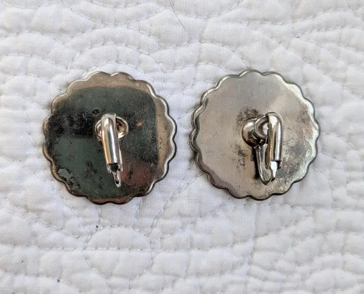 In silver and gold tones and lovely scalloped edge. 1-1/4" across. Clip on. Unmarked