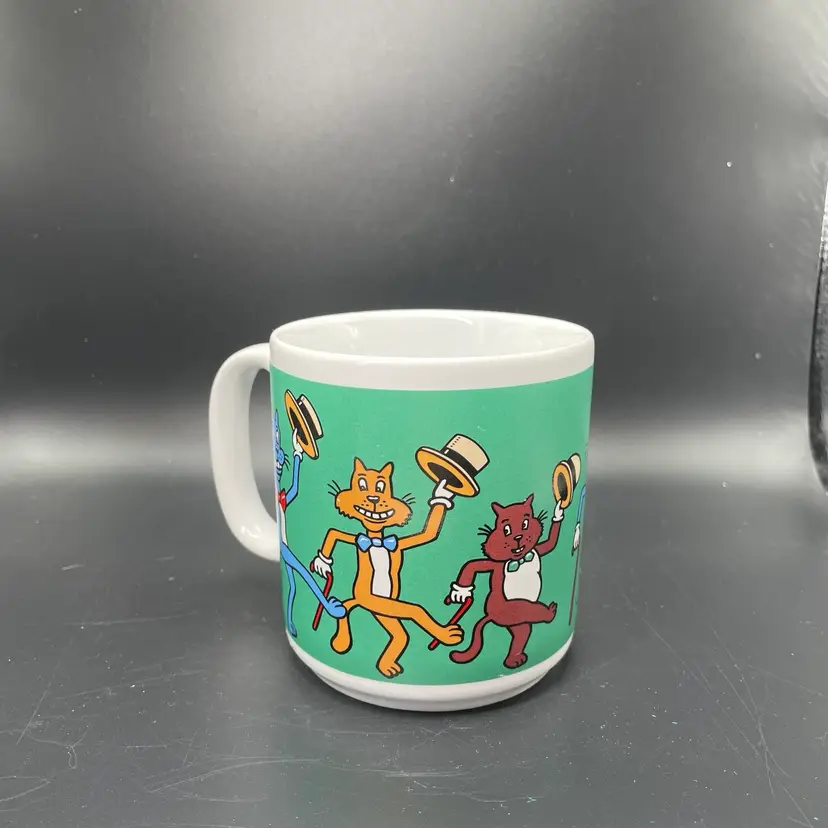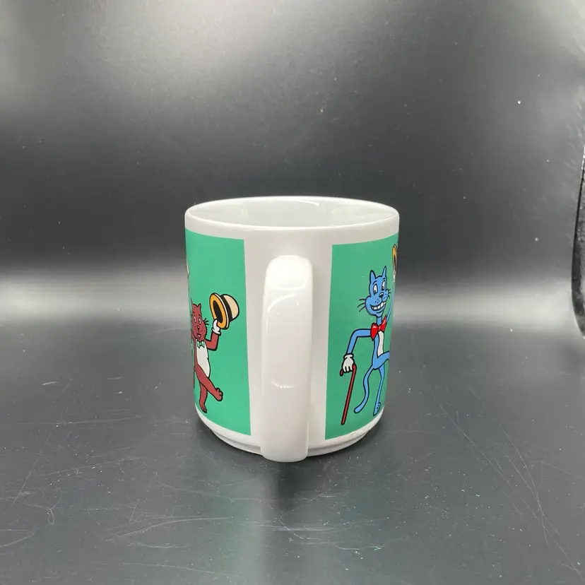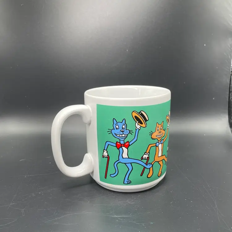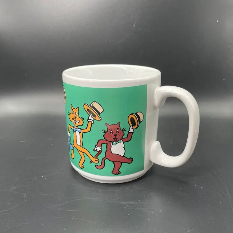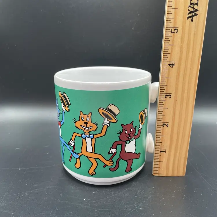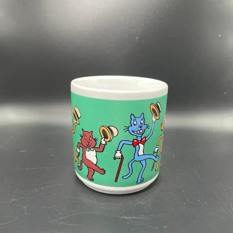 This is a vintage dancing cats coffee mug. It used to meow when picked up, but it no longer works. Made in Thailand. Measures approximately 3.5" tall x 3" across, and holds approximately 12fl oz. No chips or cracks.