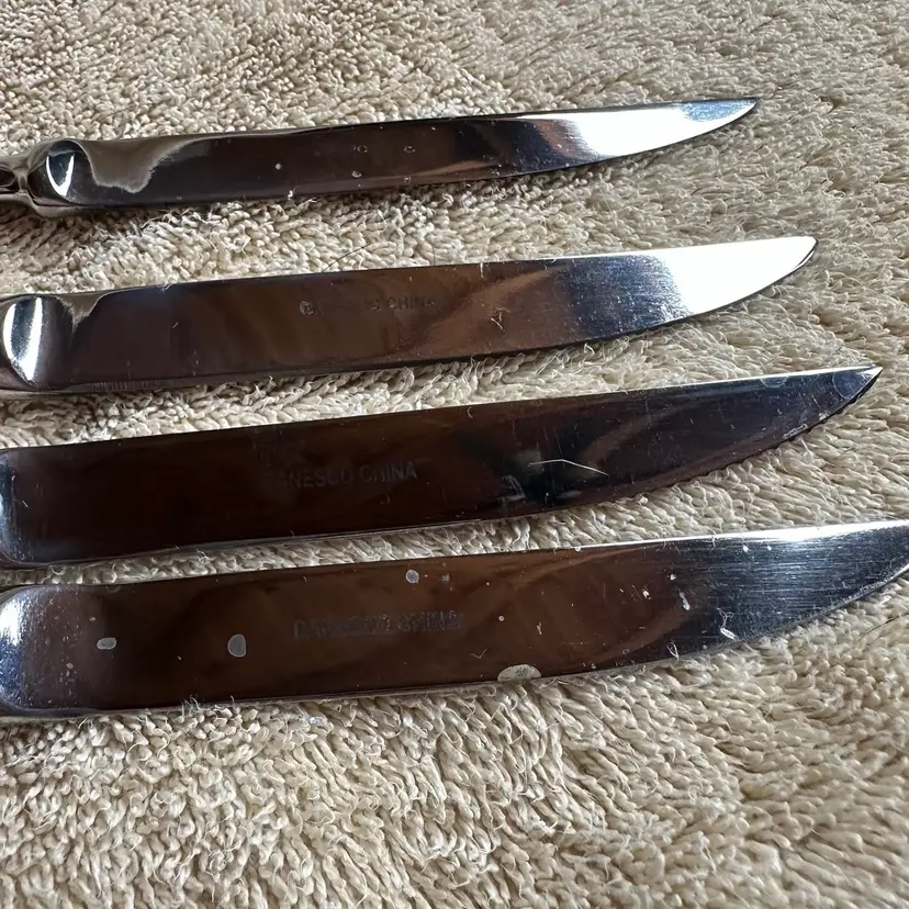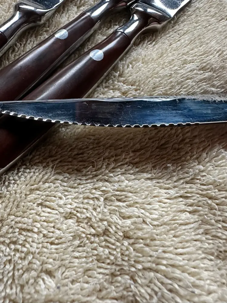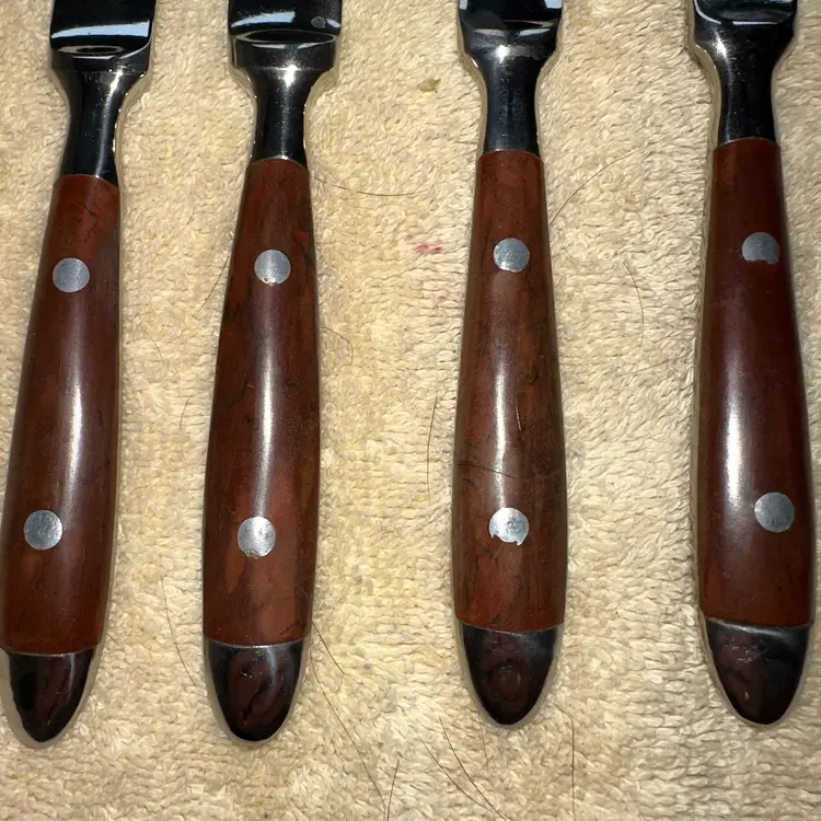 Vintage Danesco Bistro Dinner Knives Stainless Woodgrain Handles Set of 4. Excellent Overall Condition For Age. Blades are in new like condition with very little wear. Serrated edge. Smoke Free Home. #danesco #danescoflatware #dinnerknives #flatware #vintage #retro #mcm