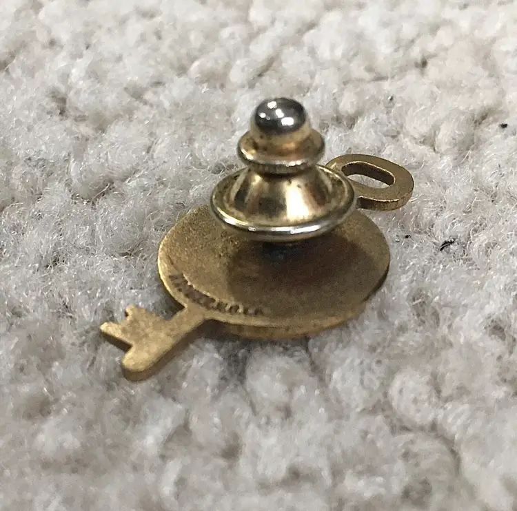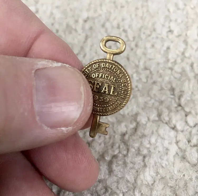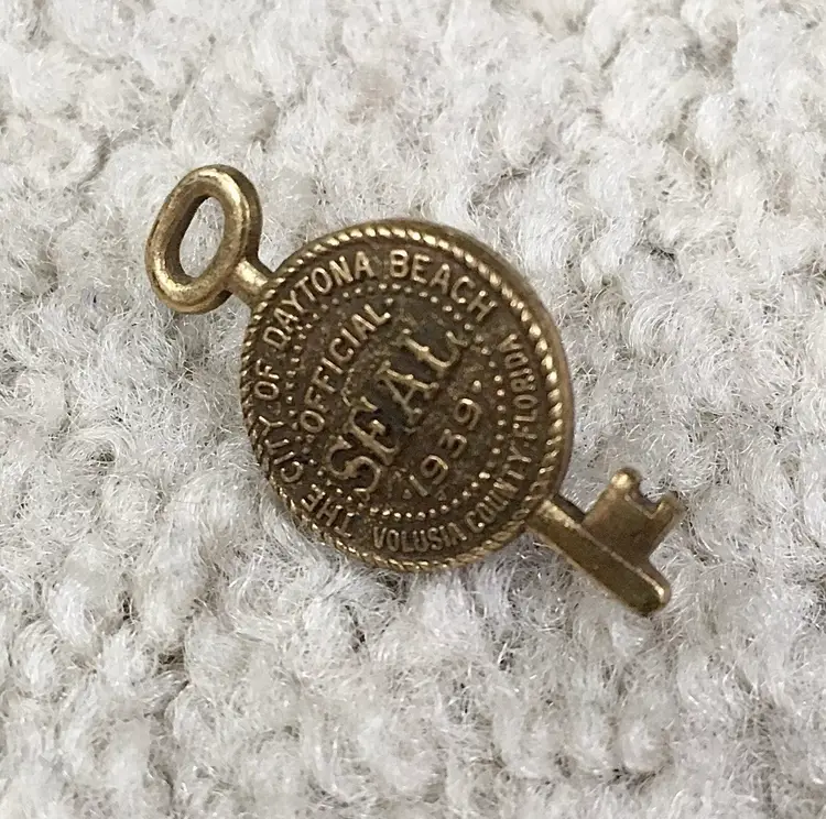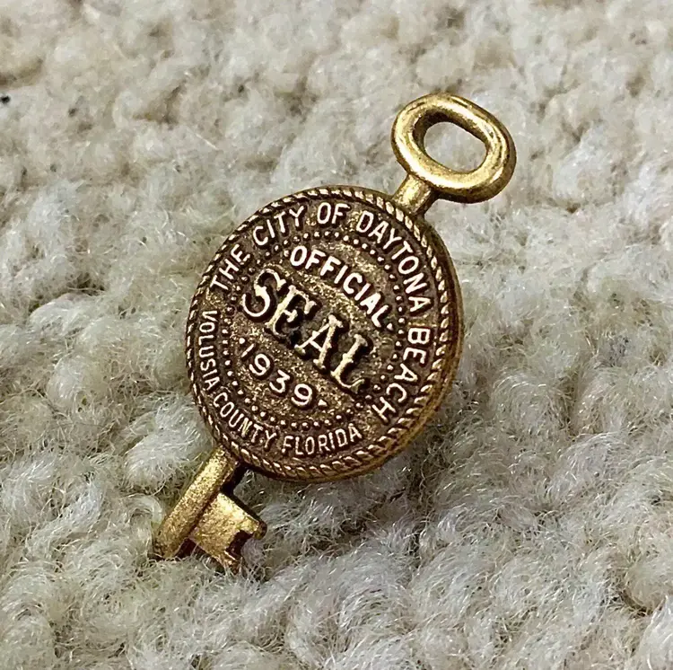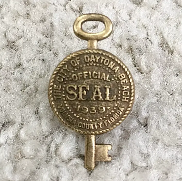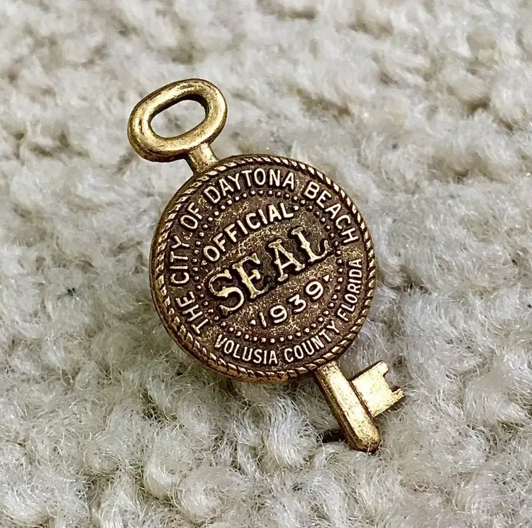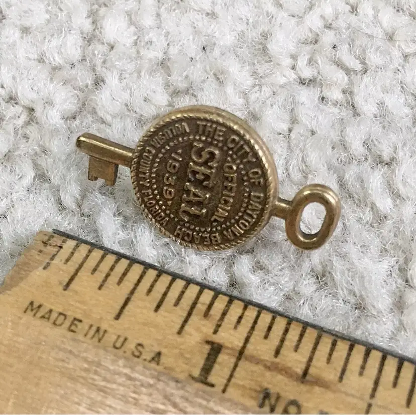 Vintage CITY OF DAYTONA BEACH Volusia County Florida 1939 OFFICIAL SEAL gold tone lapel / hat pin with back made by Leonard Krower & Sons in New Orleans, Louisiana. This item is somewhat rare and have not found another list as available anywhere. Very good condition as shown in the pics. Key measures about 1 1/4” long and round seal 5/8” diameter. See pics for more details.