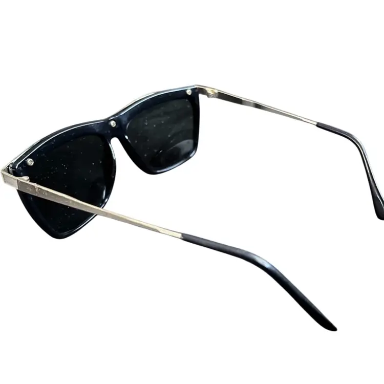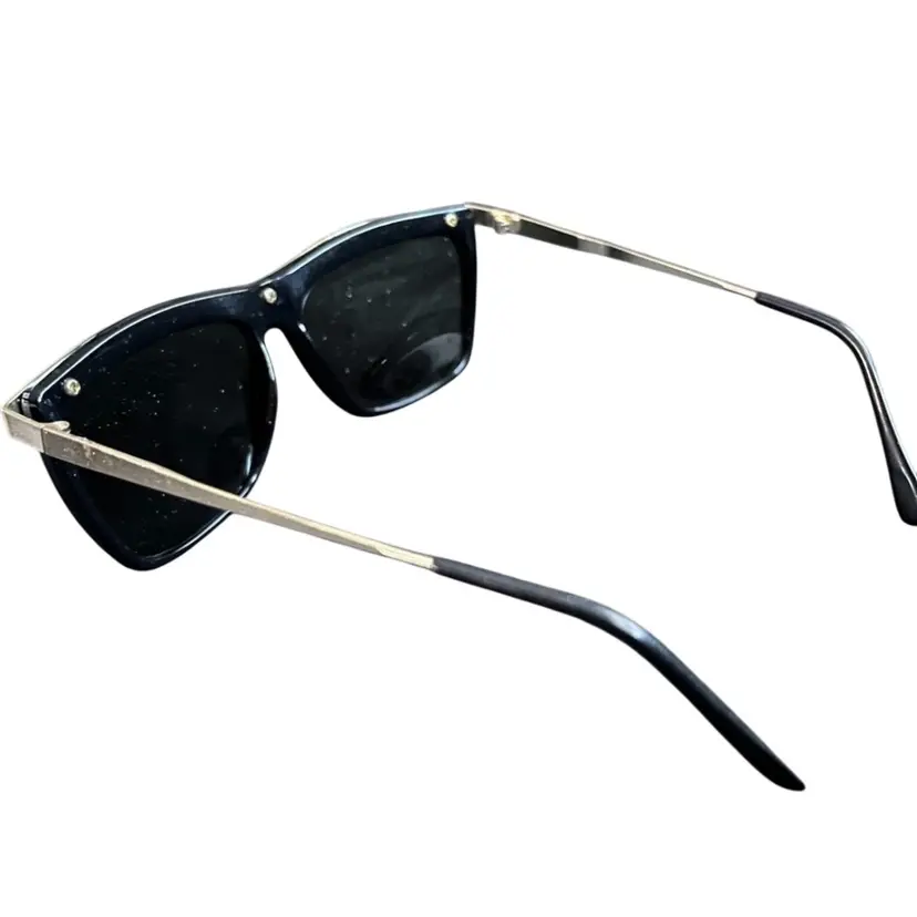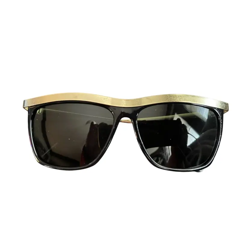 Vintage dead stock black sunglasses with gold tone detail across the top.