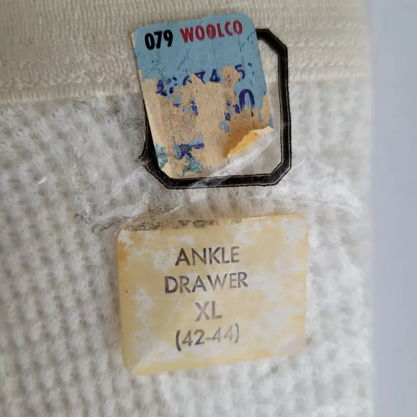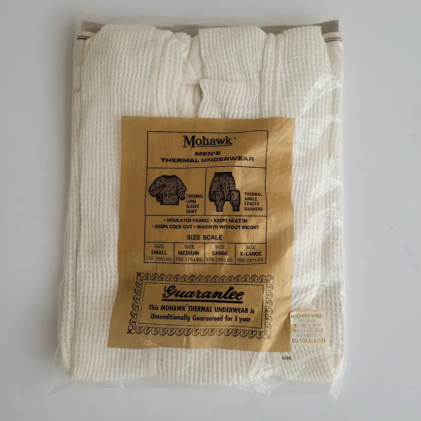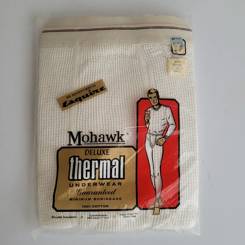 I always love finding vintage items that have never been opened. I am going to pass along some for others to enjoy! This is a deadstock pair of ankle drawer cotton long underwear pants for men. Brand is Mohawk. This package has never been opened. Package says deluxe thermal underwear. 100% Cotton. Has part of the original store tag which says Wilco. Package says these are XL (42-44).
