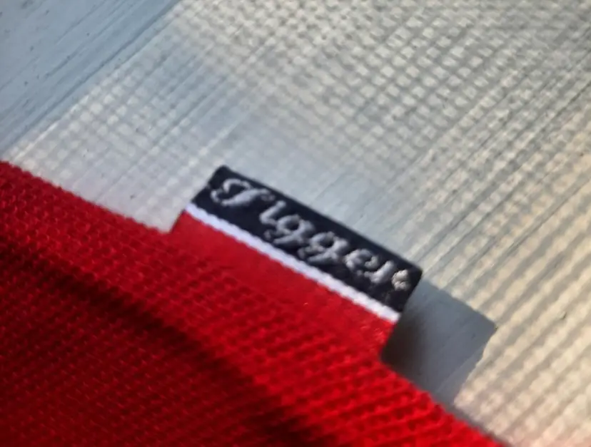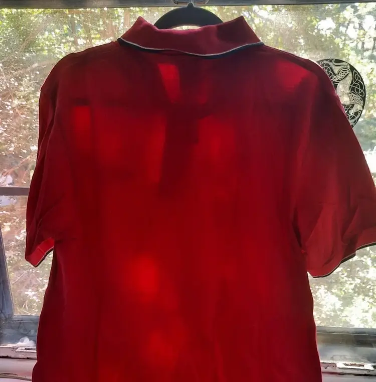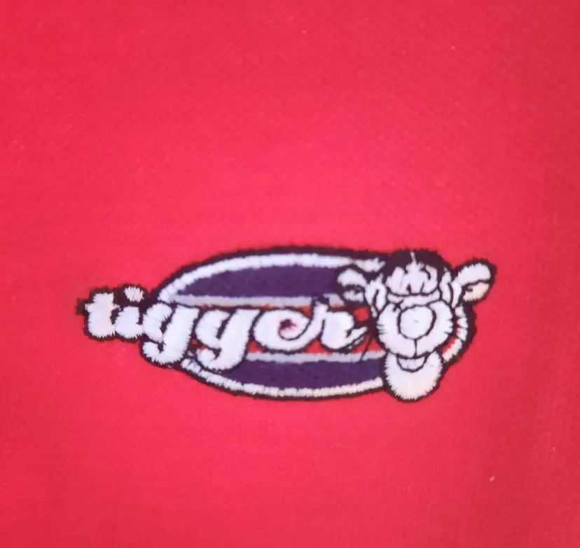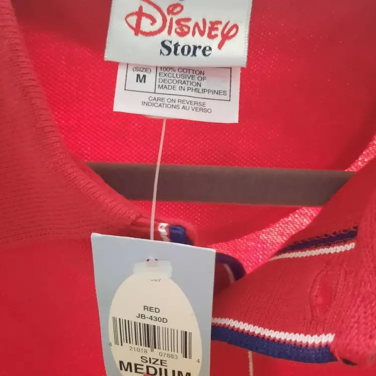 Red 100% cotton deadstock polo shirt embroidered with Tigger on the front upper left. This vintage (1990s) polo shirt is from the official Disney Store and still has the original tags. Collar and shirt piping are blue and white, plus there's an additional little Tigger tag on the bottom. There is nothing on the back. Size unisex medium.