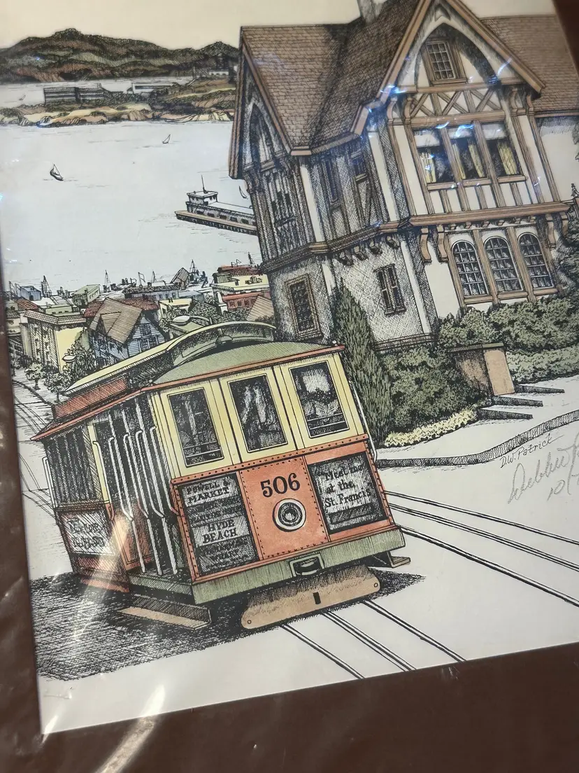 The product is a signed print of San Francisco Trolley Car from 1984 by artist Debbie Patrick. The print is matted with dimensions of 14” x 11” and features a colorful multi-color Americana style design inspired by San Francisco. This unique artwork captures the charm and history of the city, making it a special addition to any art collection or a thoughtful gift for fans of San Francisco or trolley cars.
