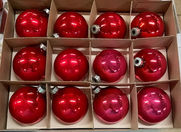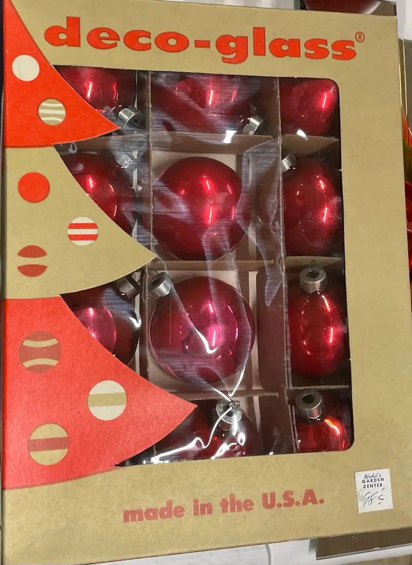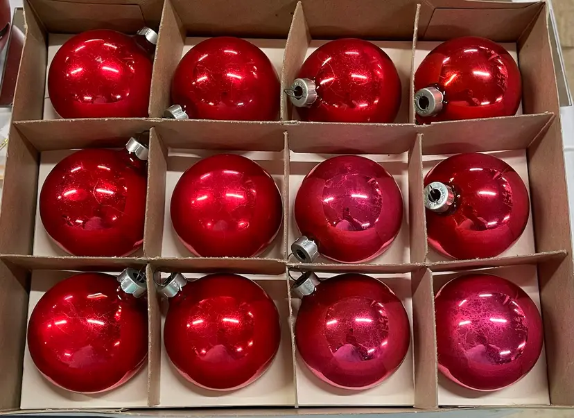 Set of 12 vintage glass ornaments, made in USA. 9 are red while 3 have a pinkish red hue (not sure if they were made this color or if it’s slight color fading?? Nonetheless, the colors are beautifully vibrant ❤️