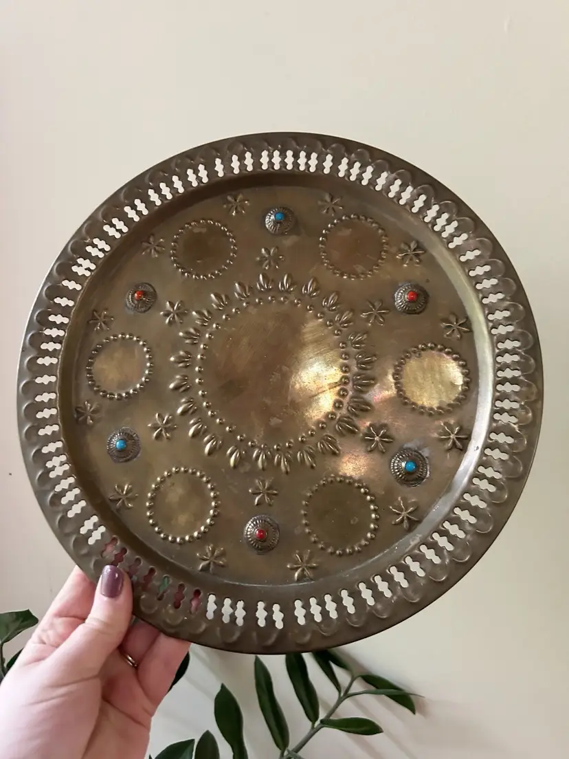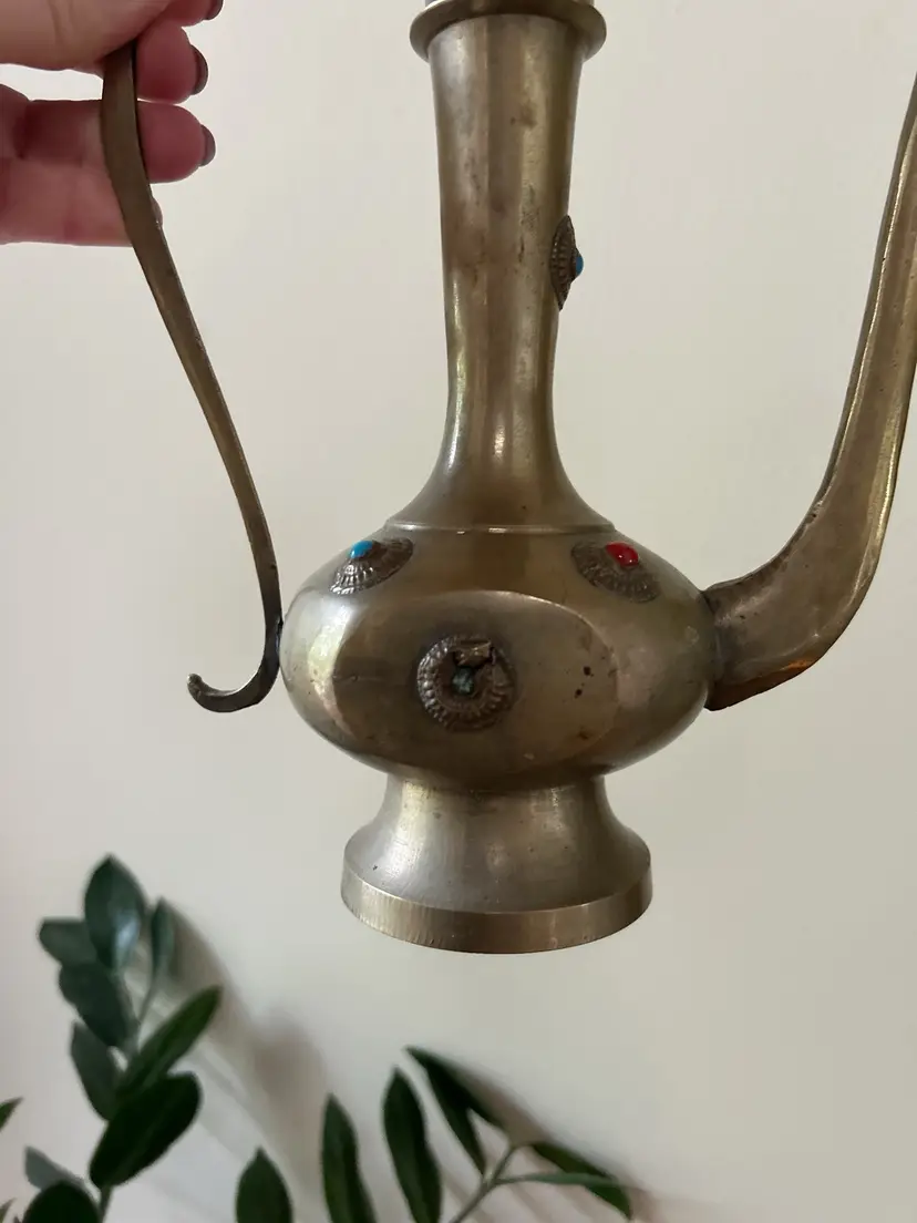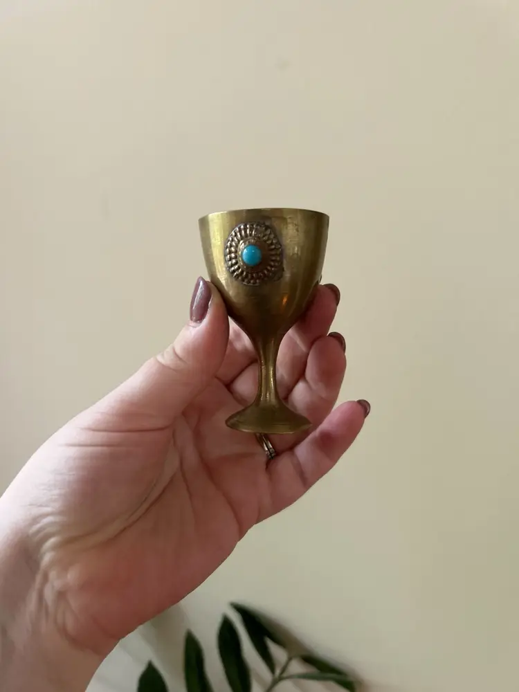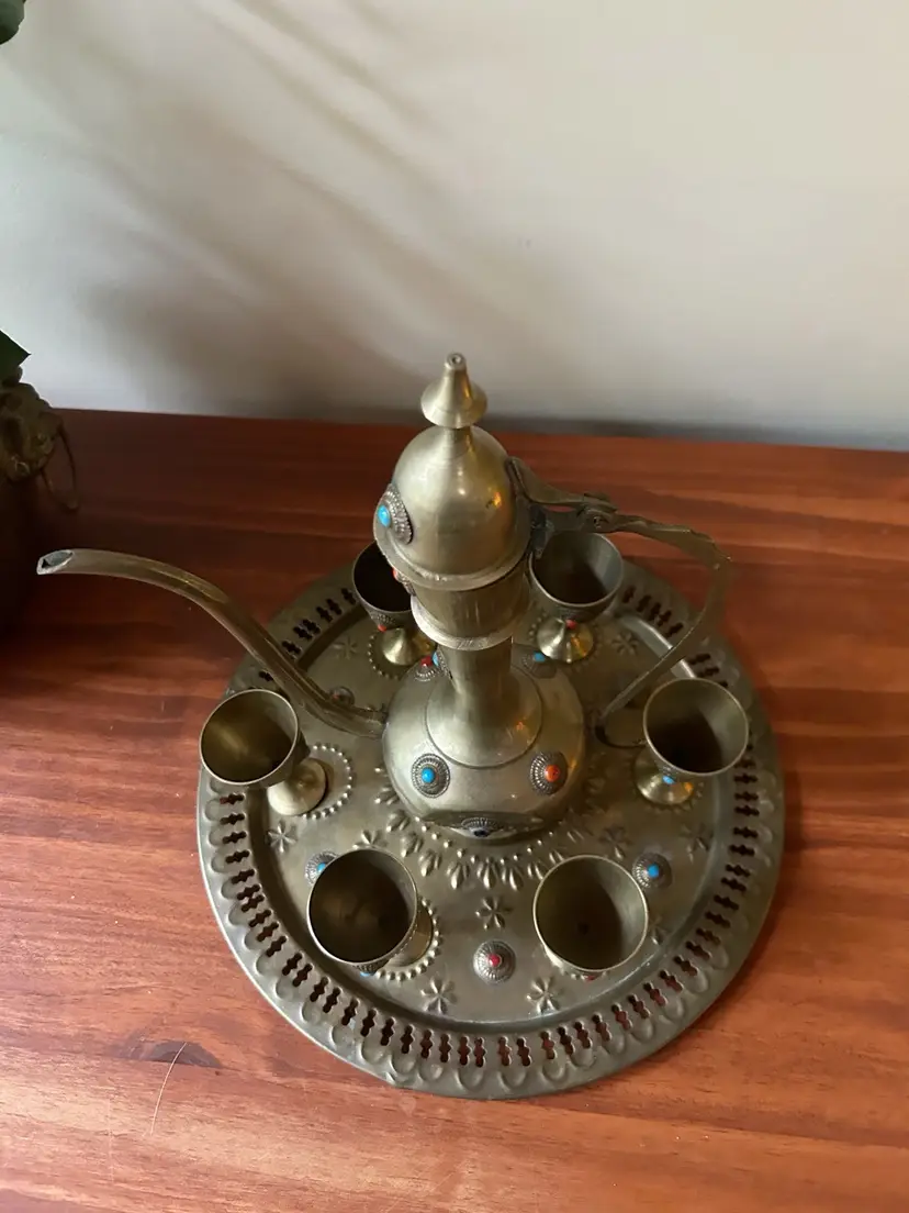 Vintage brass pitcher, goblet and tray set. Pitcher measures 12 inches tall, goblets measures 3 inches tall and tray measures 11.5 inches in diameter.
