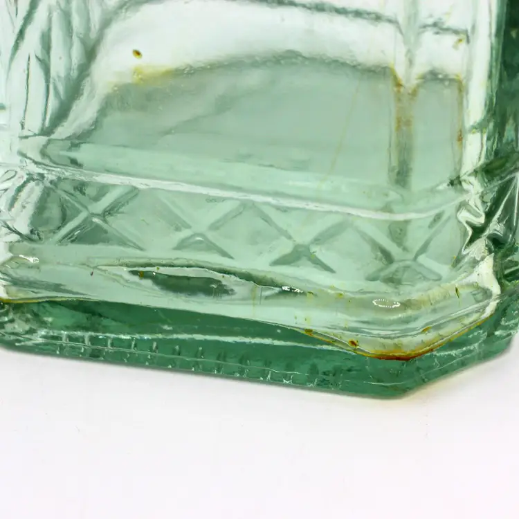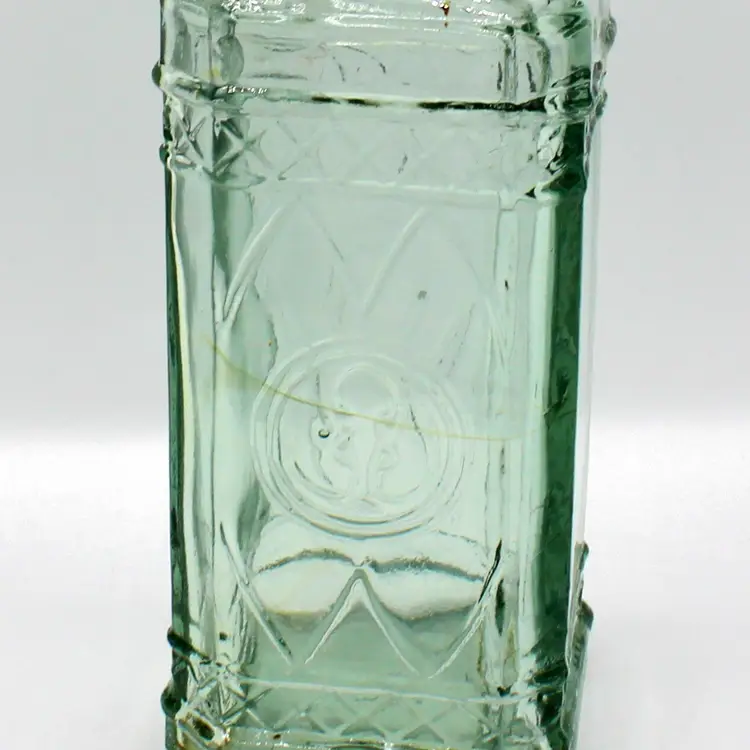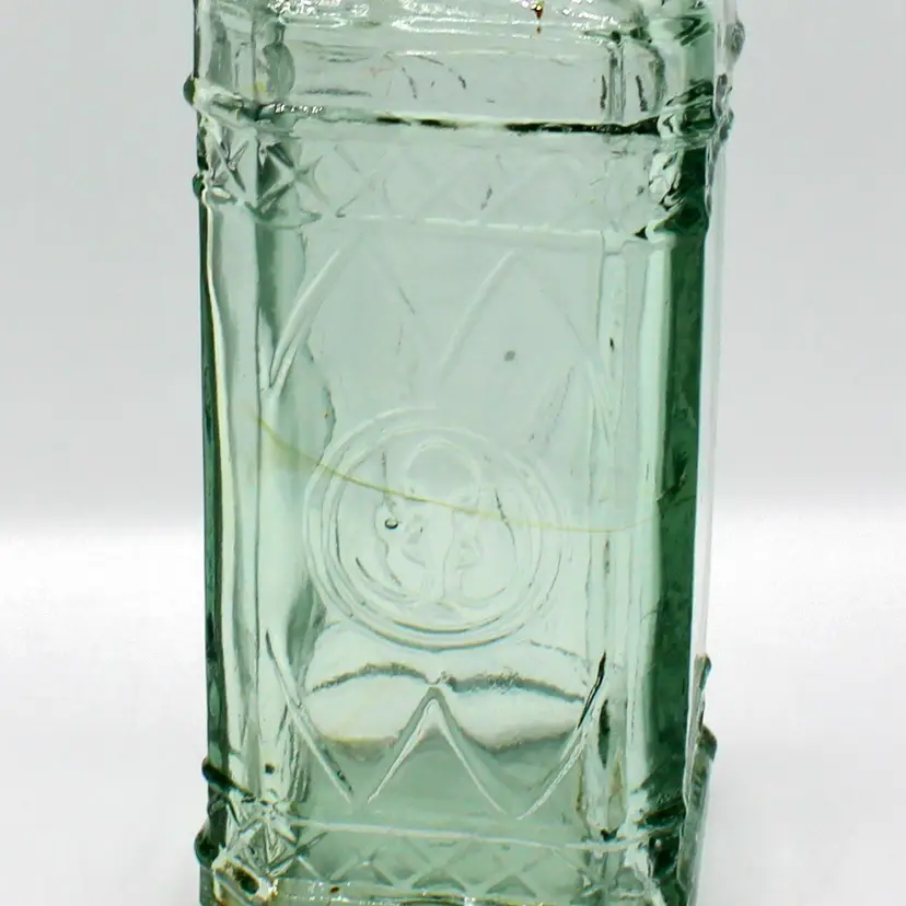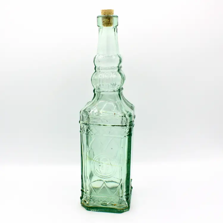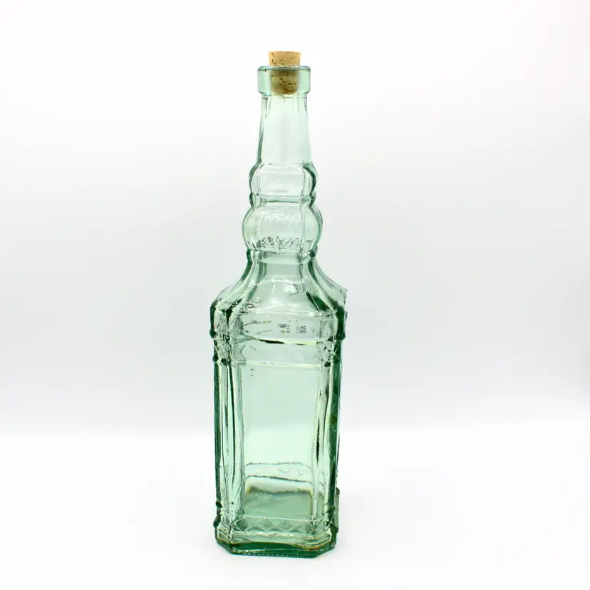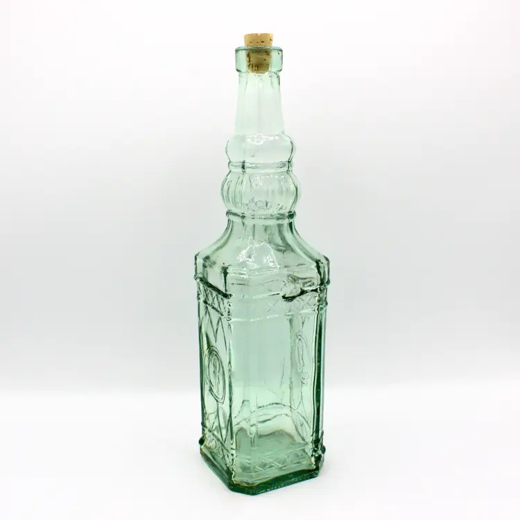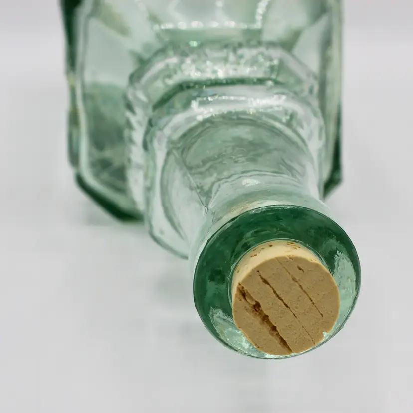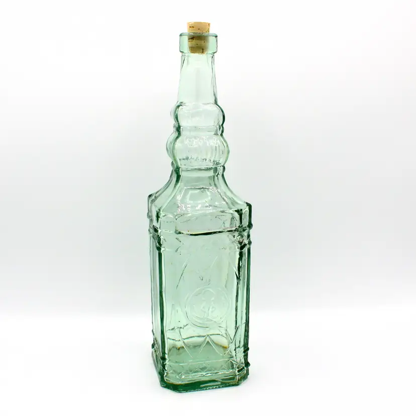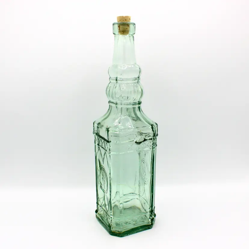 Marked: Made in Spain on the base Aqua green tint with embossed pattern Includes new cork stopper Great for display, repurposing, or Mediterranean-inspired kitchen décor