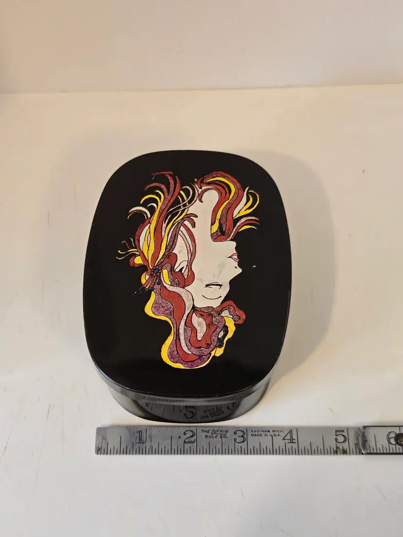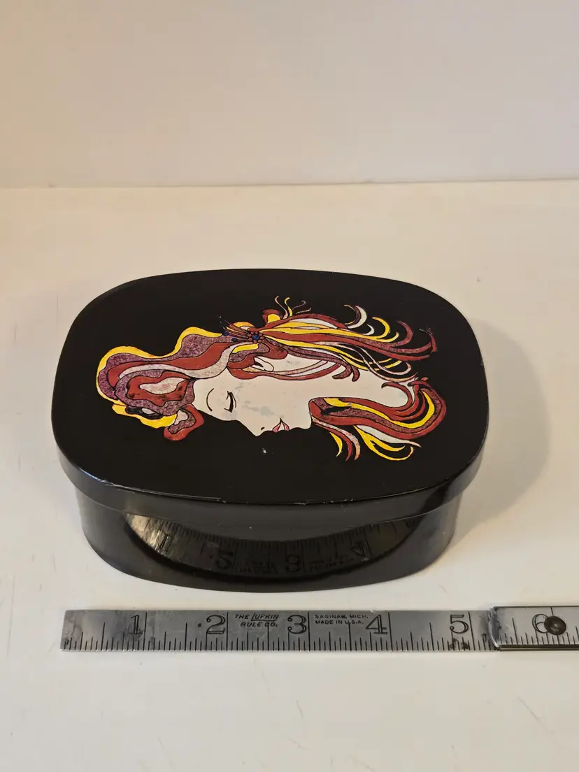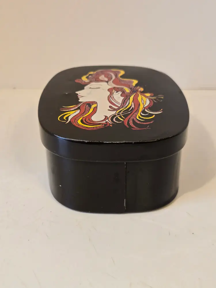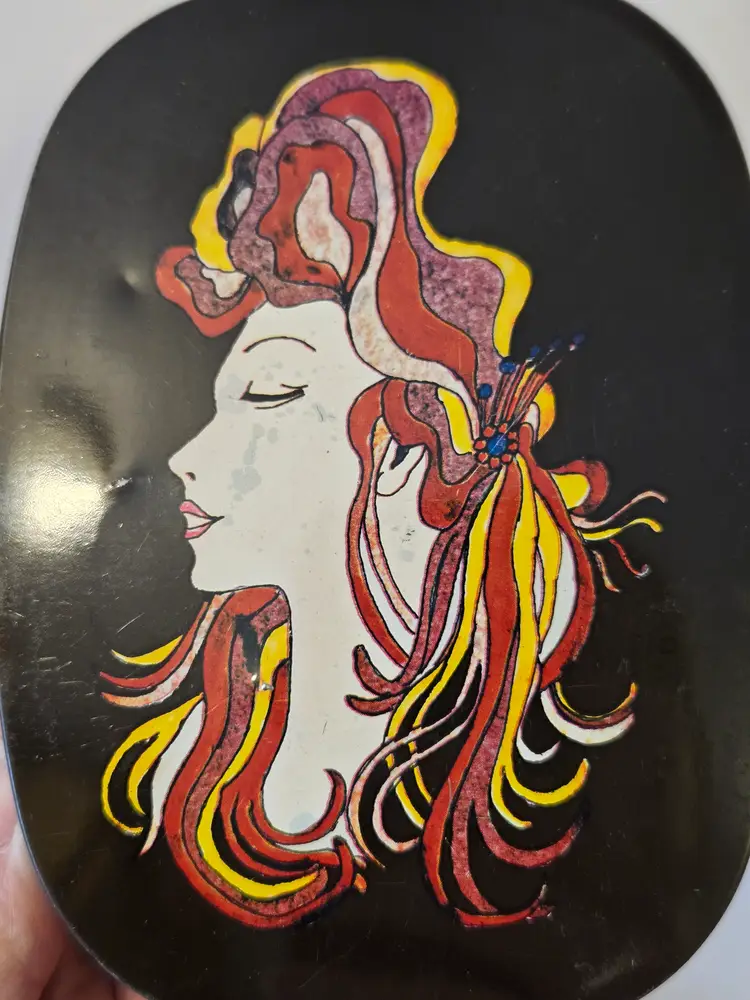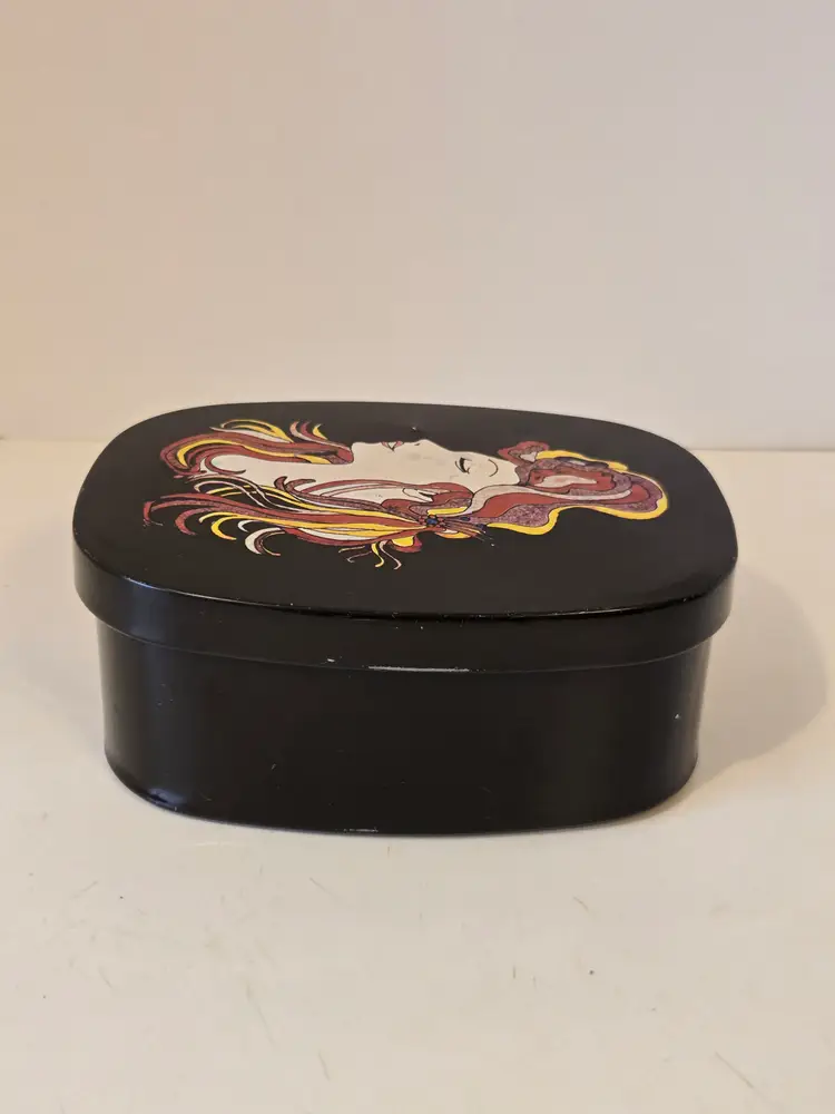 VintageWest Germany Decorative Tin with Art Nouveau Image Of A Stylized Woman in Reds and Yellow