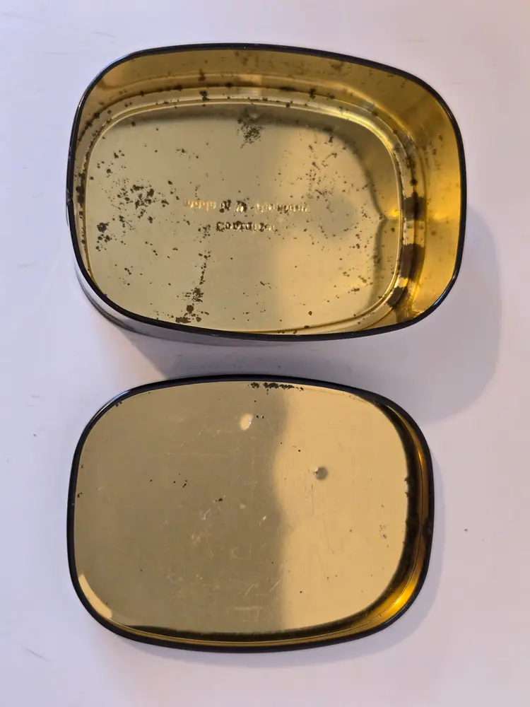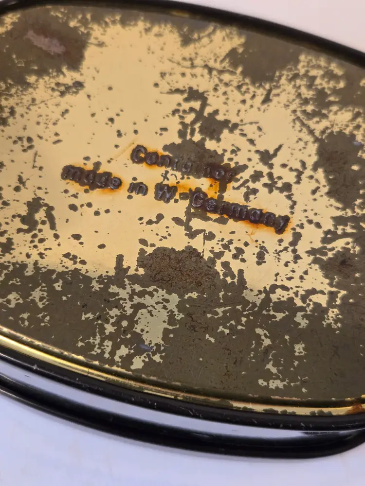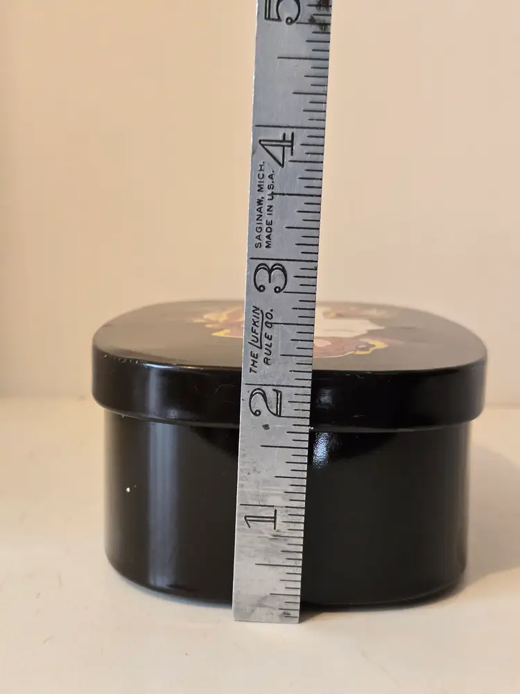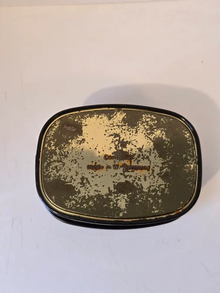 This decorative tin measures approximately 5.5×4×2.25 inches and is in good used condition. This tin has signs of wear and age, please see all photos. The tin was made in West Germany.