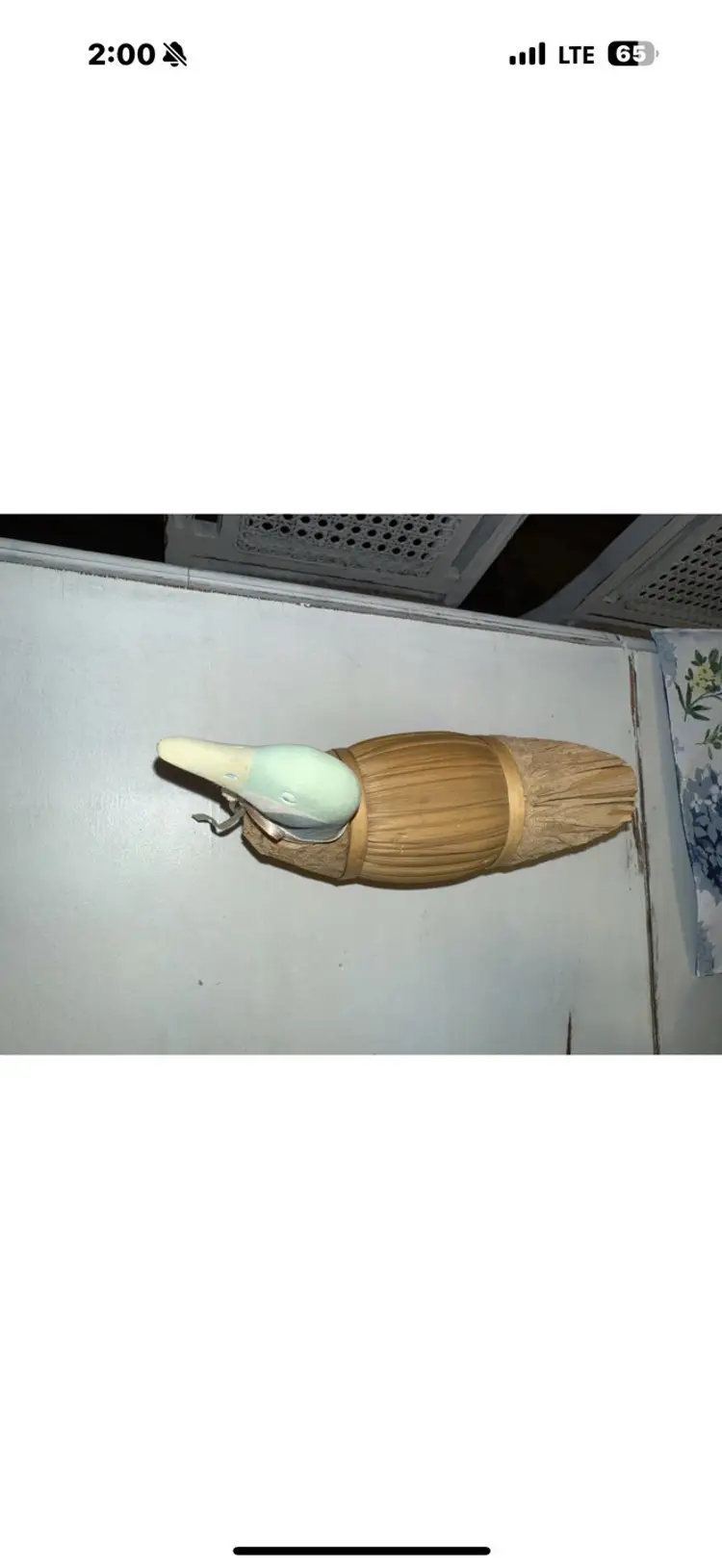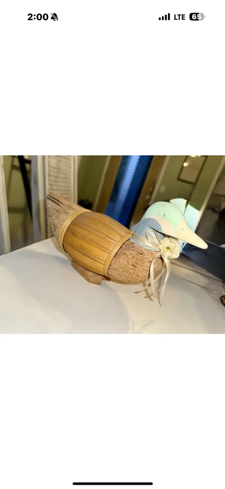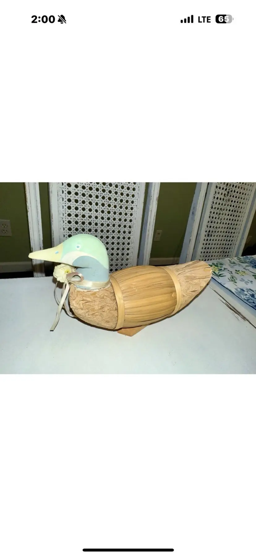 This vintage handcrafted folk art decoy duck figurine is made from natural materials such as wood, reed, wicker, and bamboo. It has a blue painted head. The intricate design captures the essence of a duck, making it a unique and charming piece for any bird lover or collector. Handmade with attention to detail, this wooden duck figurine is a one-of-a-kind addition to any home decor, blending traditional craftsmanship with a whimsical touch. granny core