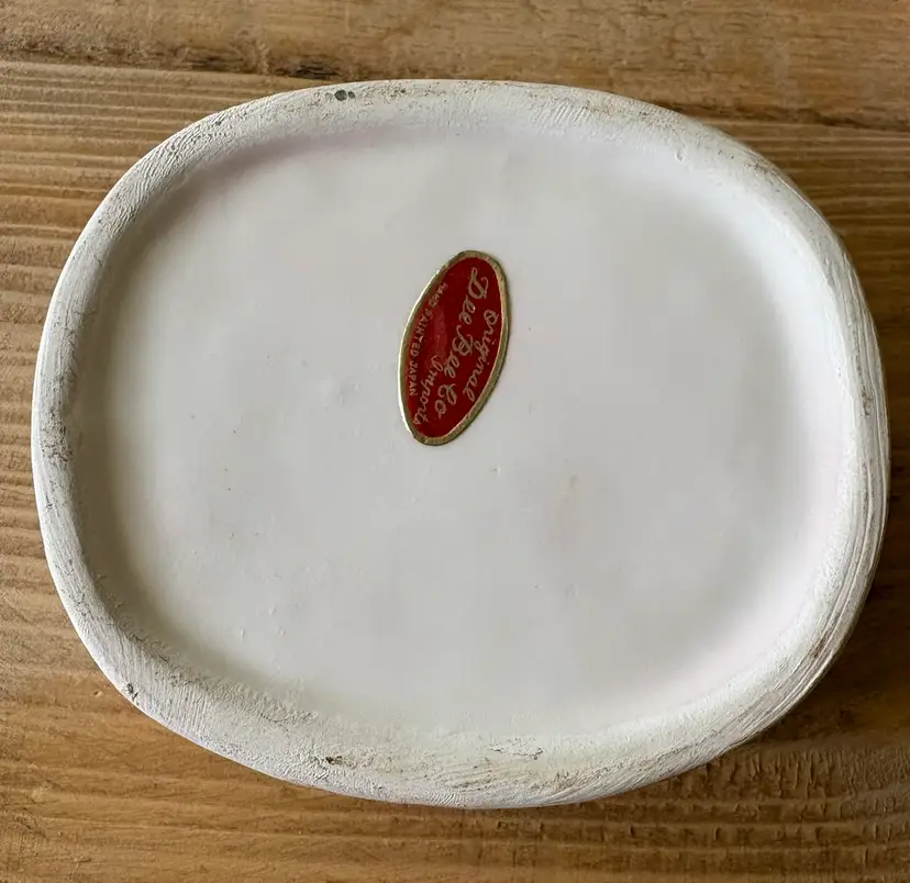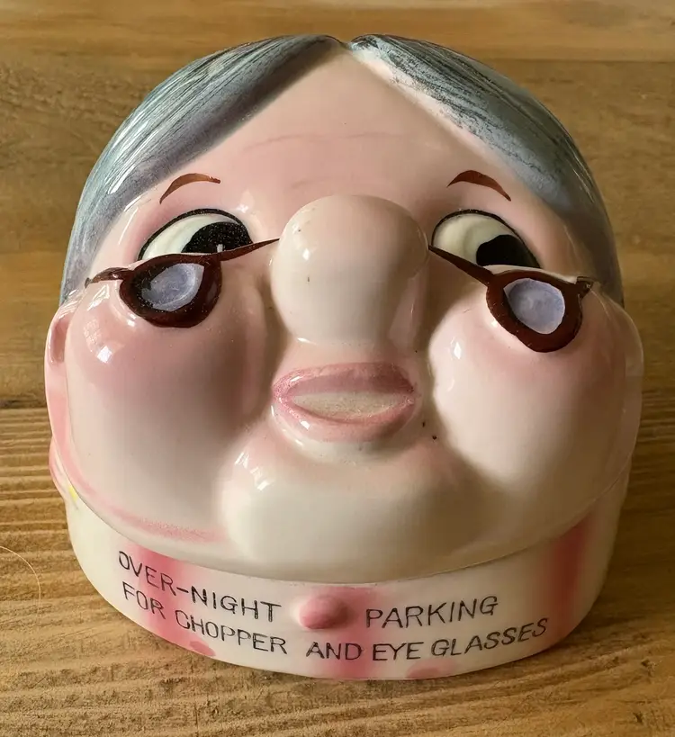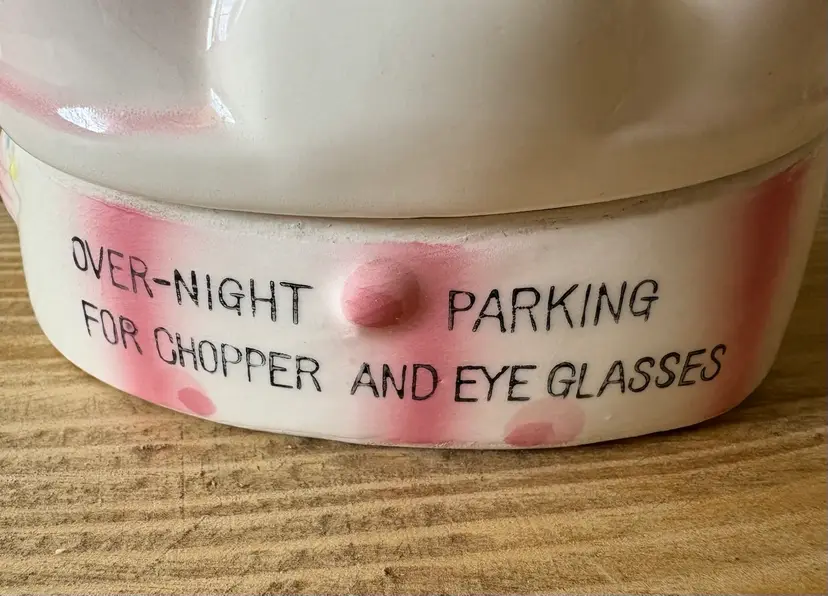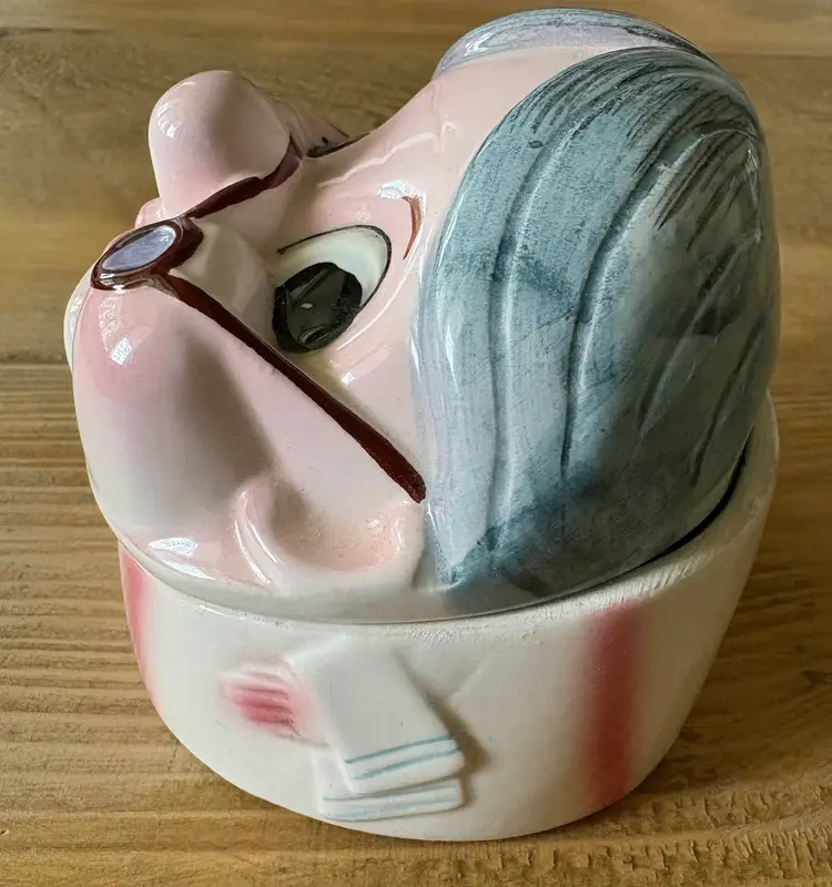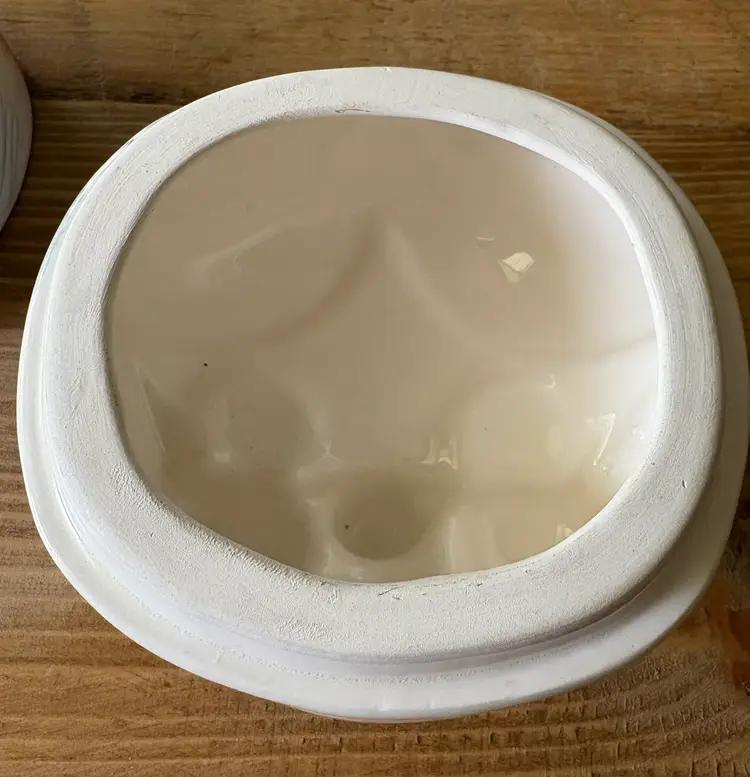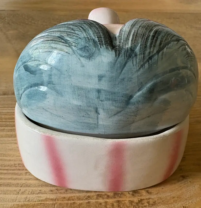 Clean and no cracks. There is one 1/8” shallow nick on the unglazed rim of the bottom piece. Lid sits a bit wonky, sliding forward on the bottom. 4 1/4”W x 3 3/4”D x 3 1/4”H with lid. “Overnight parking for chopper and eye glasses”.