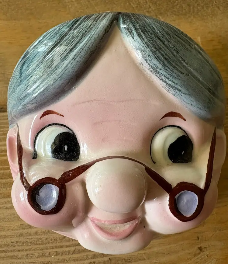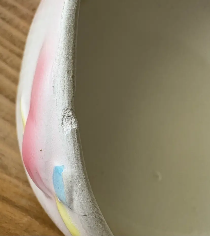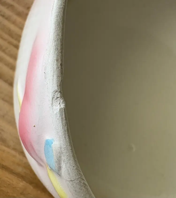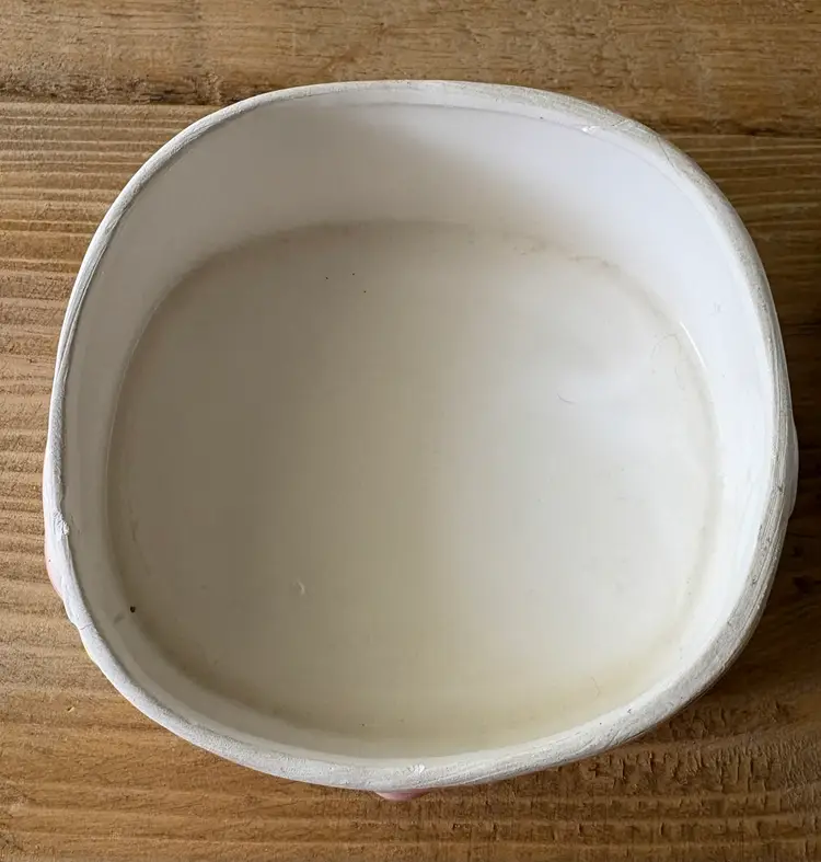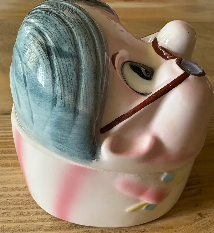 Clean and no cracks. There is one 1/8” shallow nick on the unglazed rim of the bottom piece. Lid sits a bit wonky, sliding forward on the bottom. 4 1/4”W x 3 3/4”D x 3 1/4”H with lid. “Overnight parking for chopper and eye glasses”.