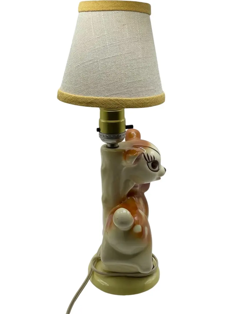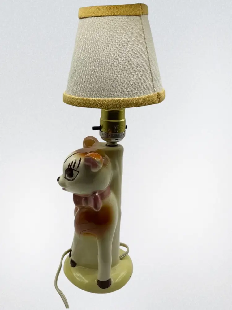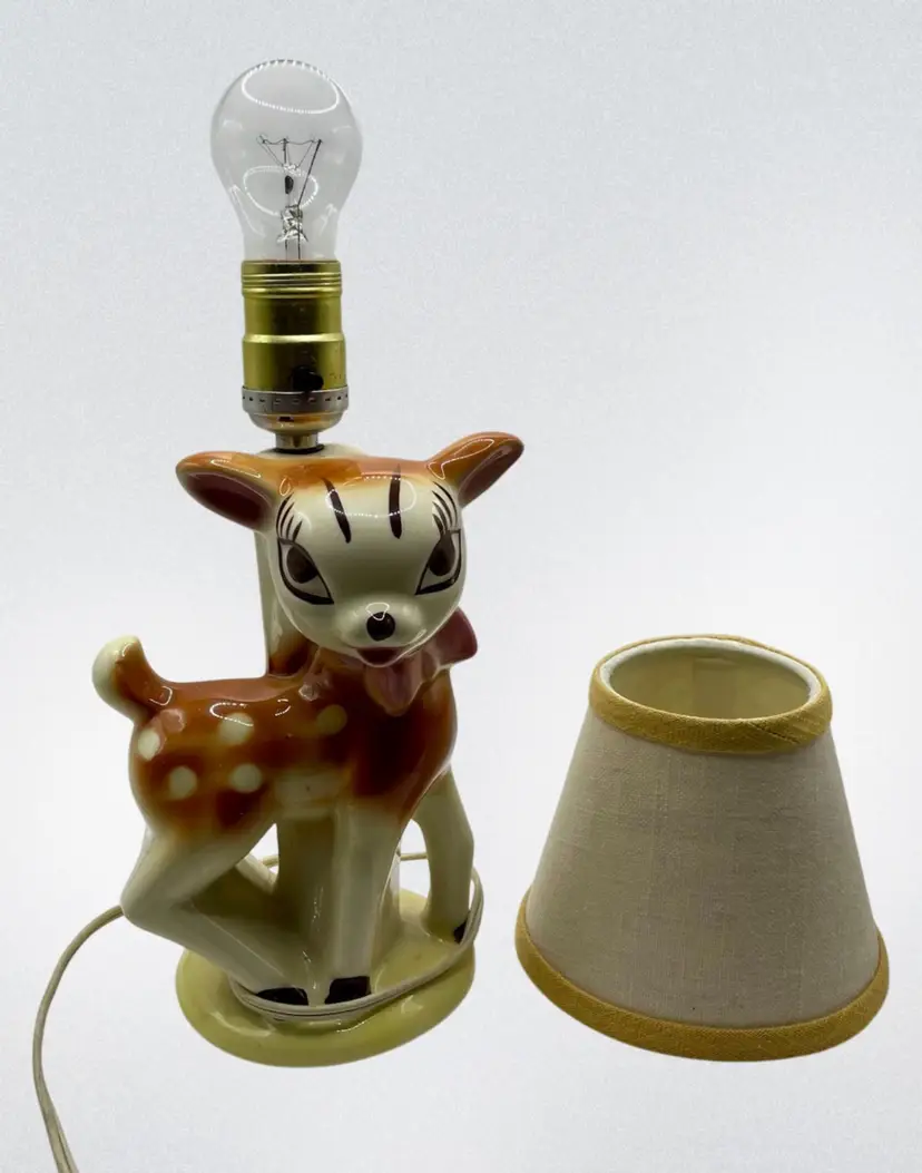 This VTG Deer Lamp is a charming mid-century piece perfect for those who love kitschy and novelty items. With a fawn design from the 1950s, this table lamp features a clip-on shade for easy use. Made of ceramic, the lamp exudes a vintage vibe with its glazed finish and classic mid-century kitschy style. Standing at 14.5 inches tall, this lamp is a unique addition to any room, ideal for teens, adults, and even kids who appreciate retro decor.
