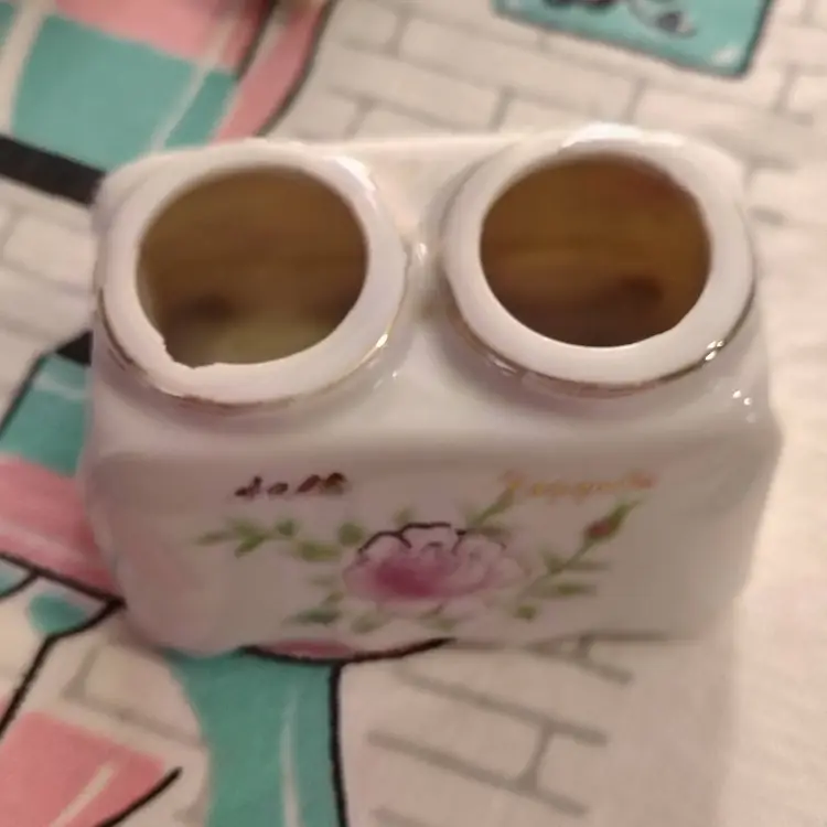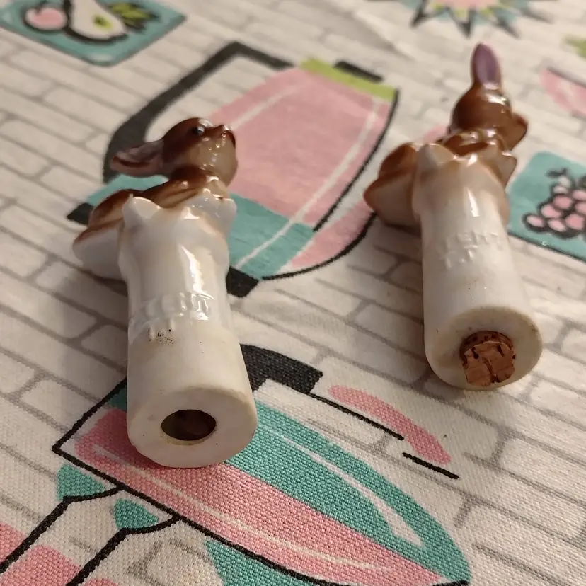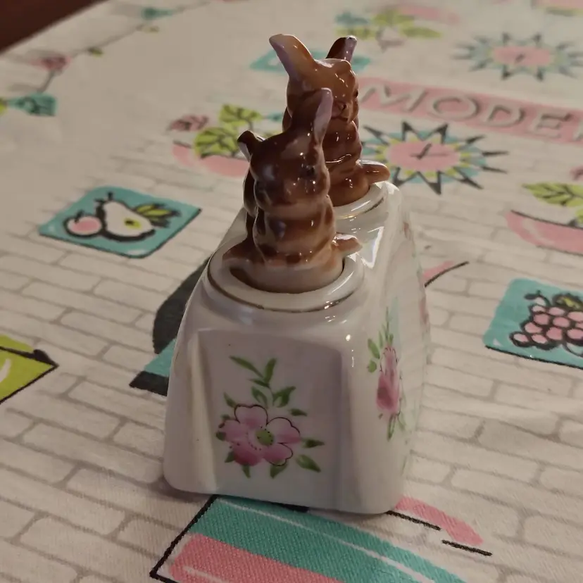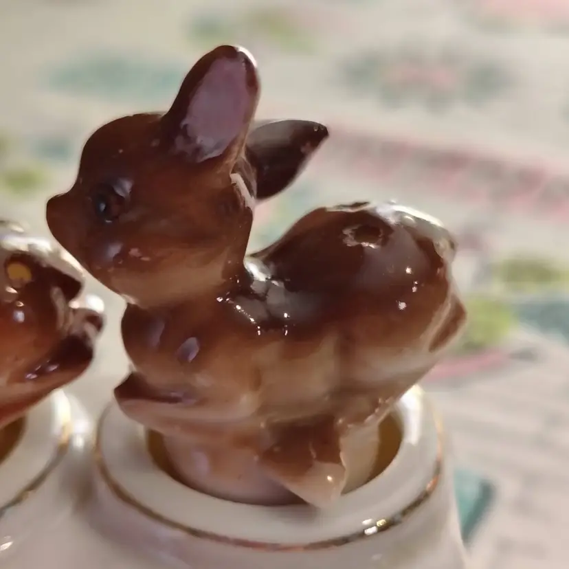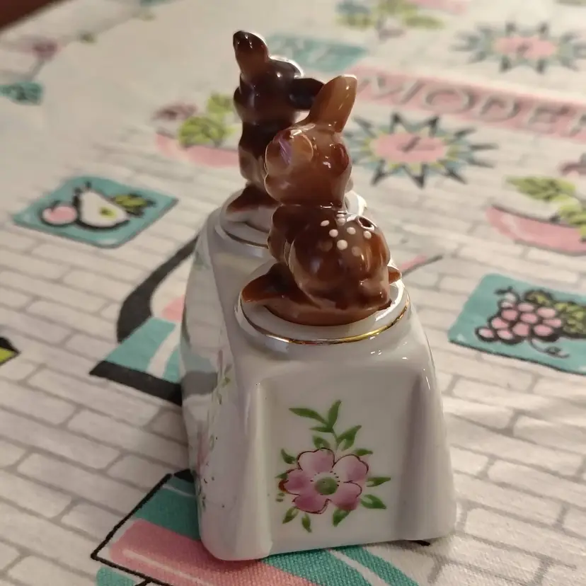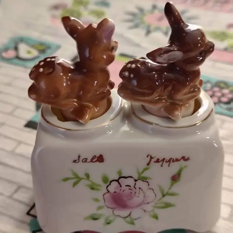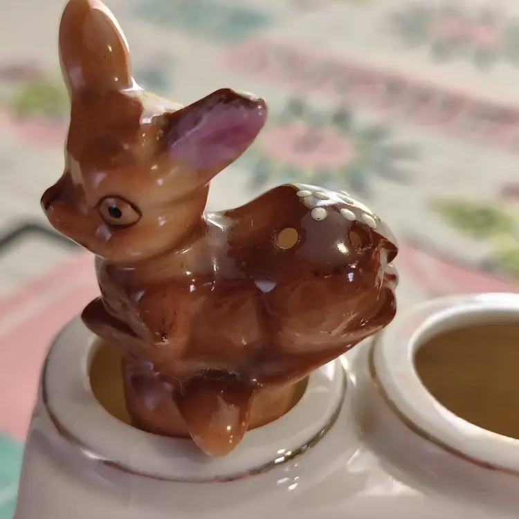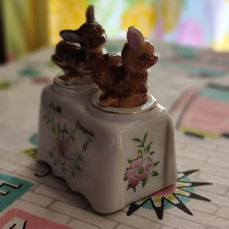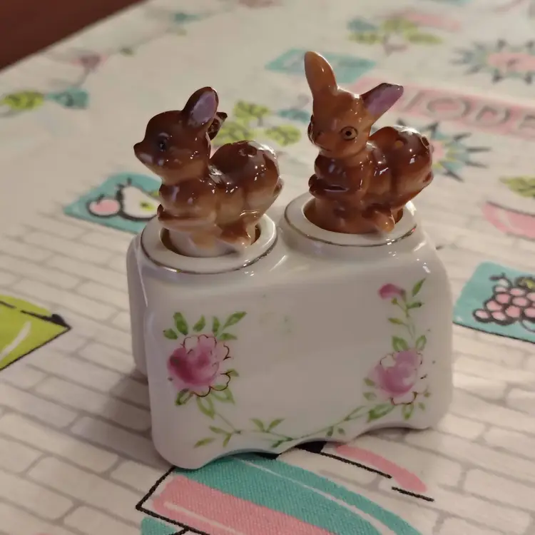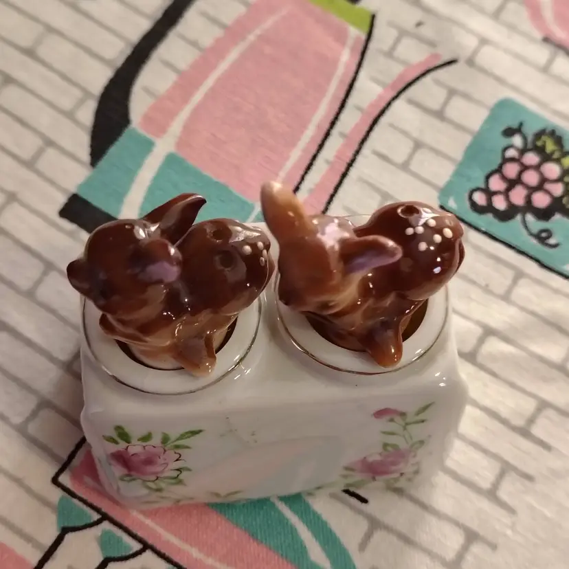 This is a vintage salt and pepper shaker set that rocks when you place it down! Made in Japan during the 1950s, this adorable set features to teeny tiny spotted deer. So darling! The base, or stand, has openings that allow the deer to hang down and swing just a little. The deer have long weighted bases that keep them swinging for a long time... It was hard to keep them still for their photo sessions! Condition: The deer are in Excellent shape, while their base is in Good condition. There are no chips or cracks on the little deer, though they could both use new corks, as they've started to crumble from age. The base has a chip on one of the holes for the shakers. Don't worry, they still sit and rock just fine though! There is also a spiderweb crack on the bottom of the base. It's still entirely functional, and you can't see it unless you turn it over, but it certainly is there! Size: The base measures 3" across, is 2" wide, and sits 1.75" tall. The deer measures 1.5" across, are 1.75" long, and are about 3" tall, including their long bottoms. When the deer are sat in the base and behave themselves, the whole piece measures about 3.5" tall.
