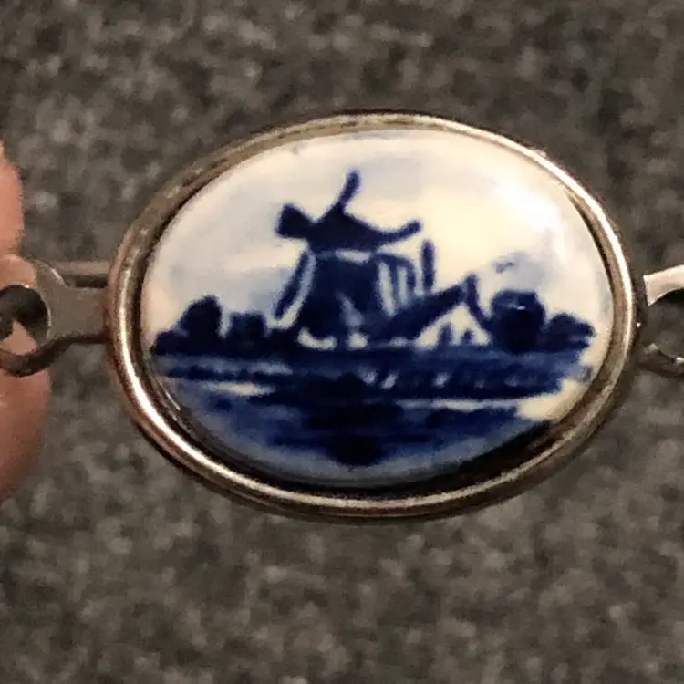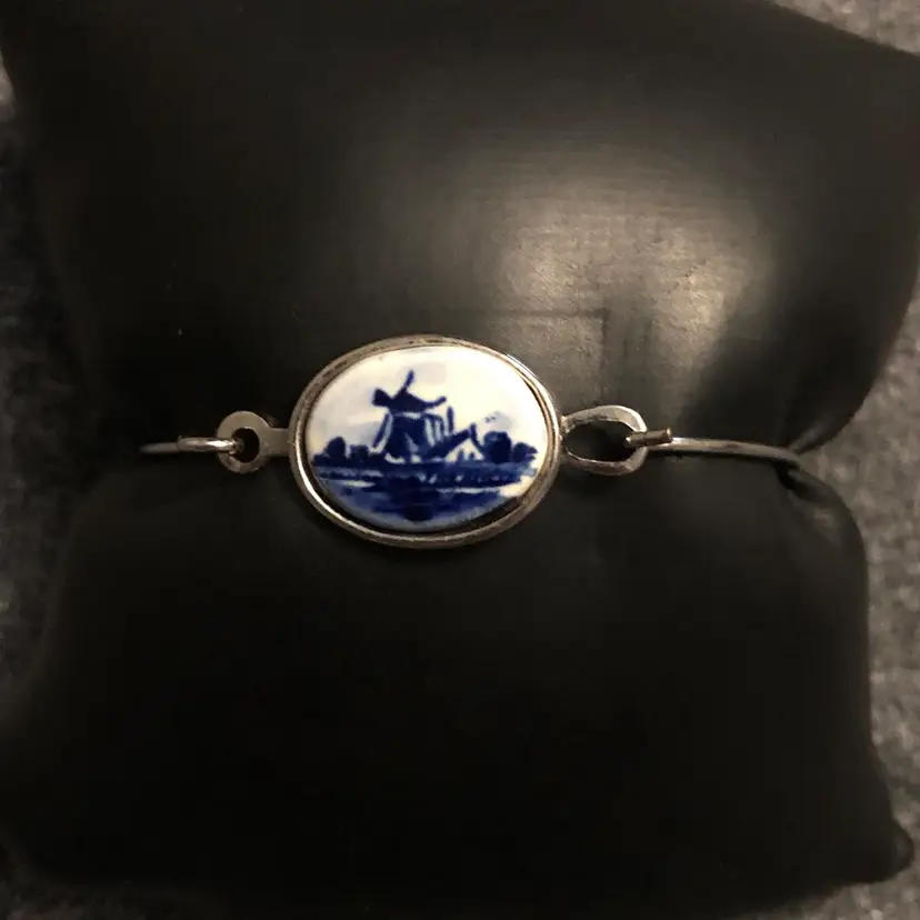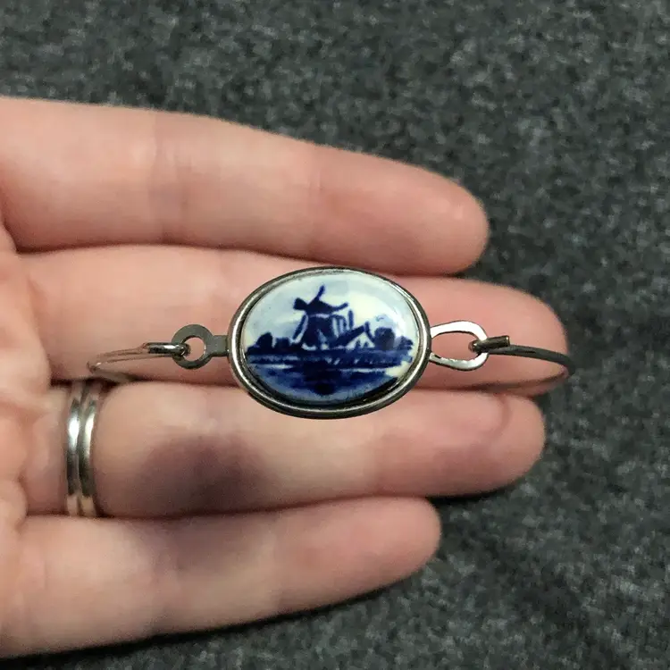 Vintage Delft Silver-Tone Porcelain Painted Windmill Bangle Bracelet