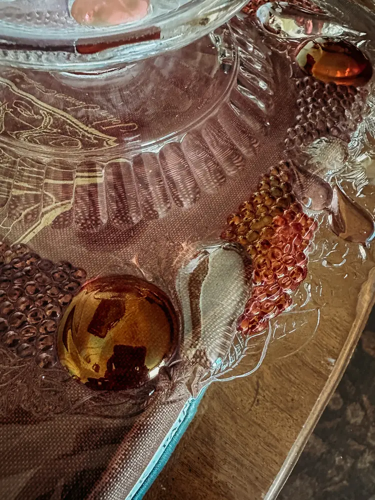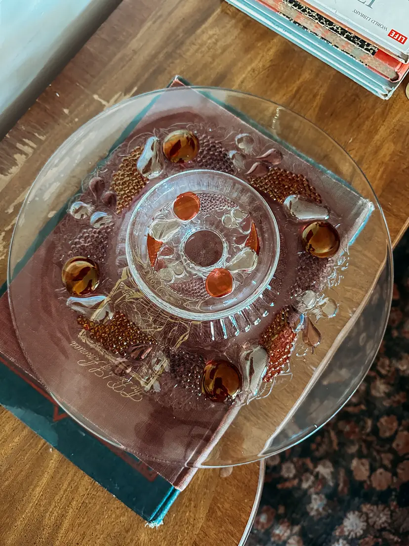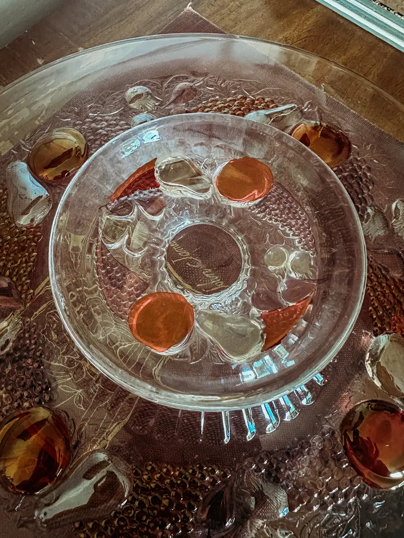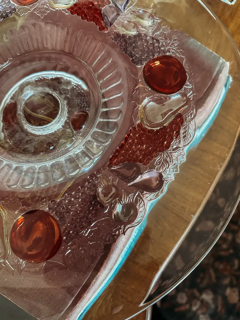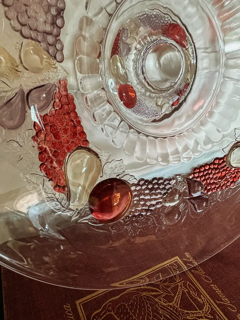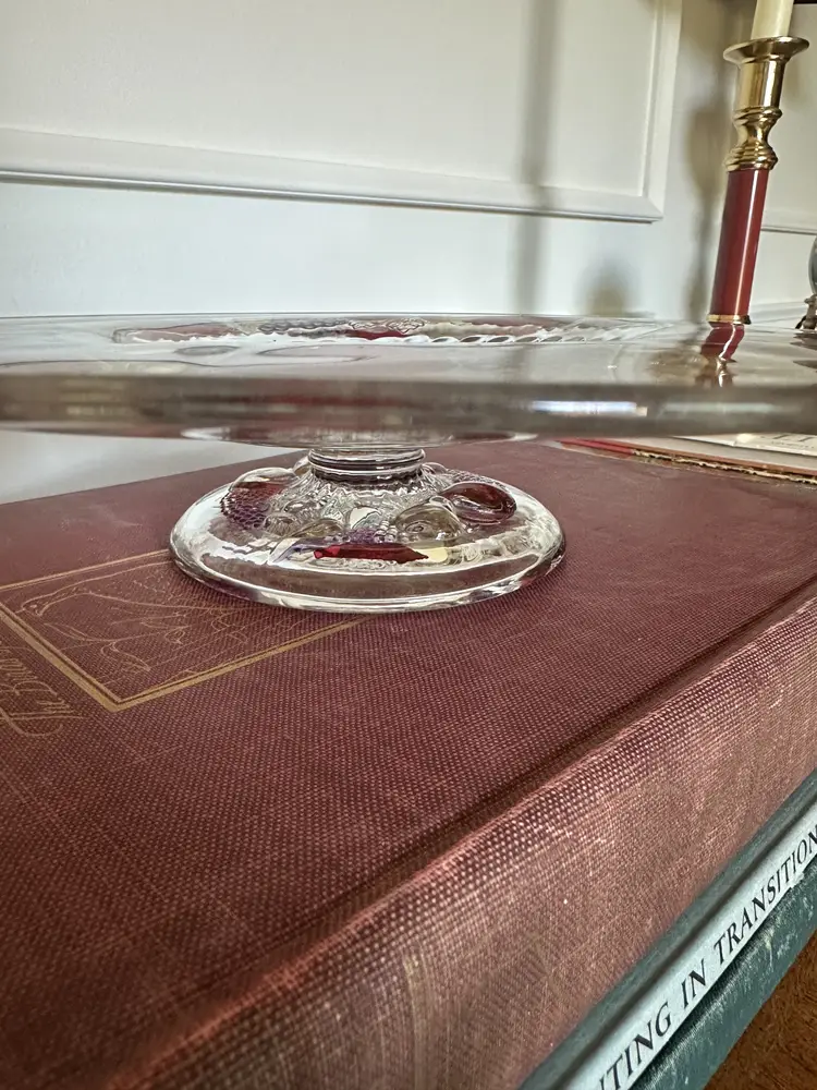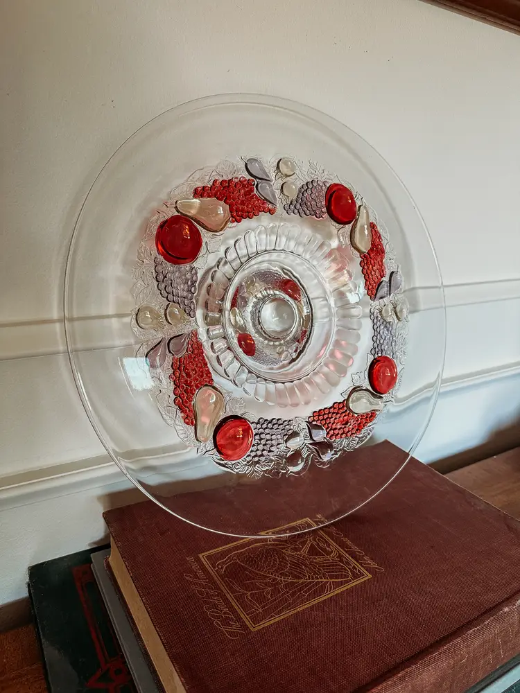Beautiful Vintage Westmoreland flat-edge cake stand in the Della Robbia pattern. This style was manufactured from 1928-1940, so it is a least 83 years old. This is your opportunity to own a true treasure from the past! It's substantial at 14 1/2" in diameter, and sits 2 1/2" tall. There is some wear on a few of the apples - small scratches that wouldn't even show up on camera. This vintage stand currently sells on Replacements.com for $199.95!