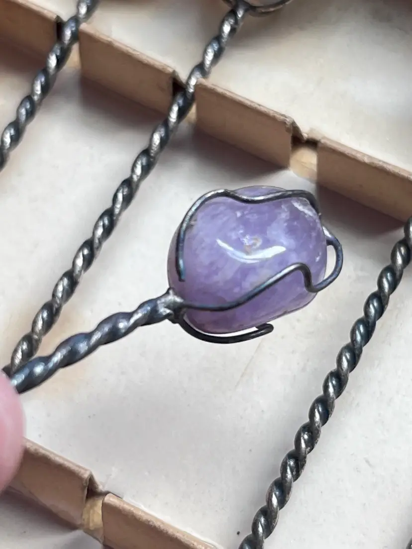 In great condition; the amethysts “cage” has one broken peice and a few stones have small cracks. Tarnished with age