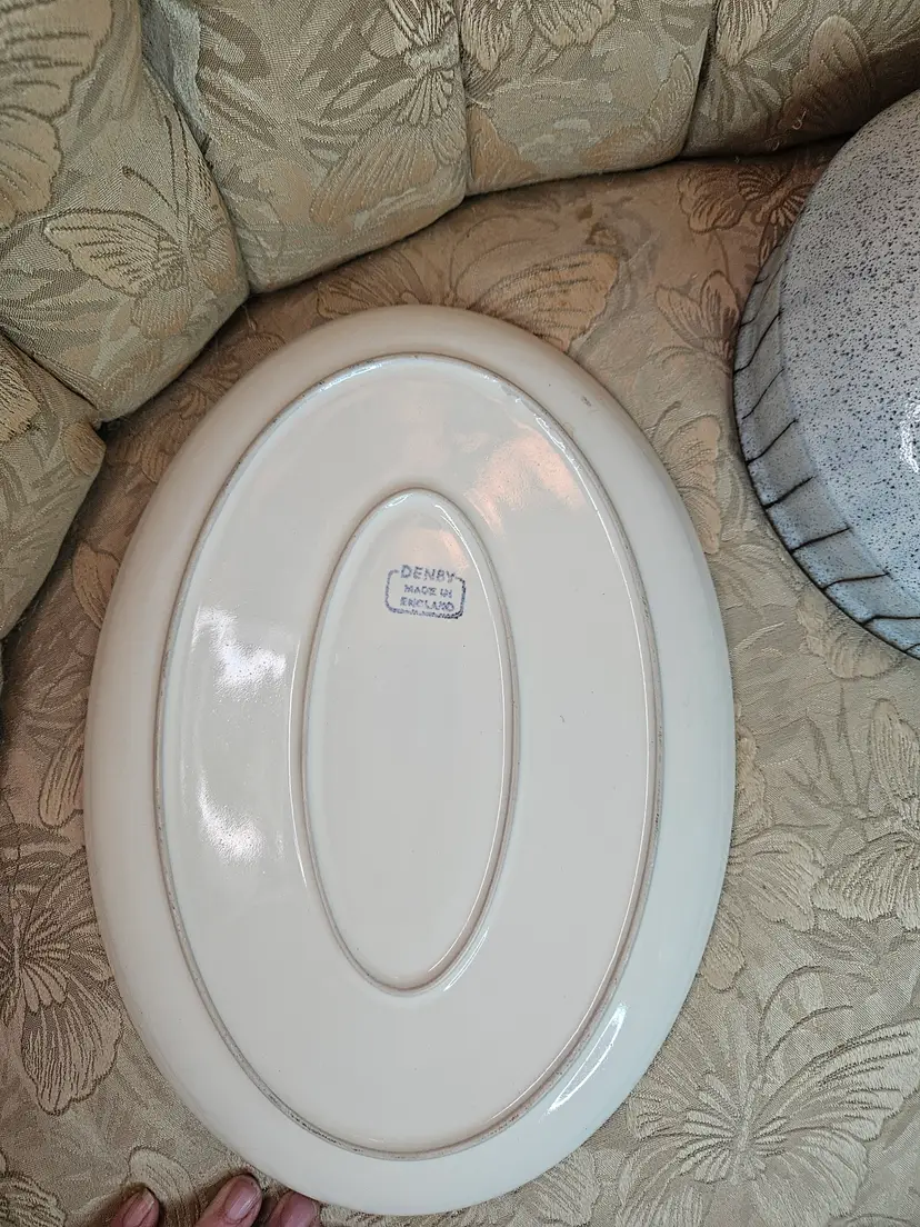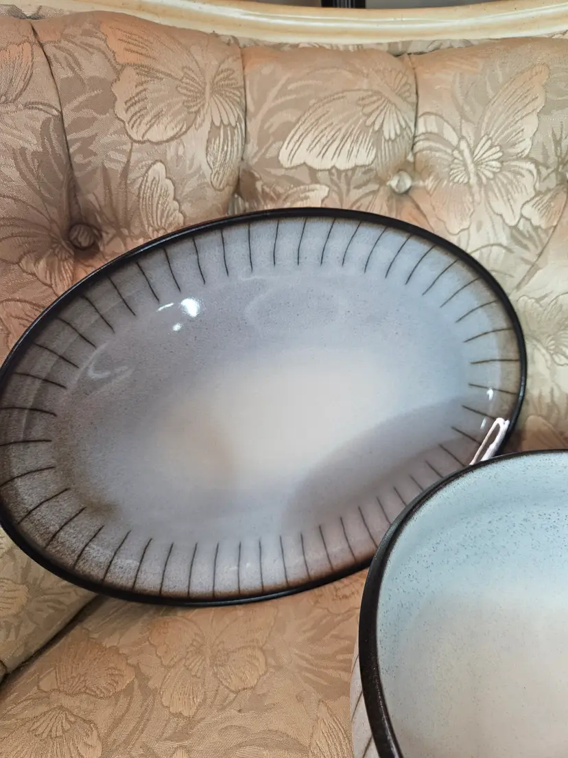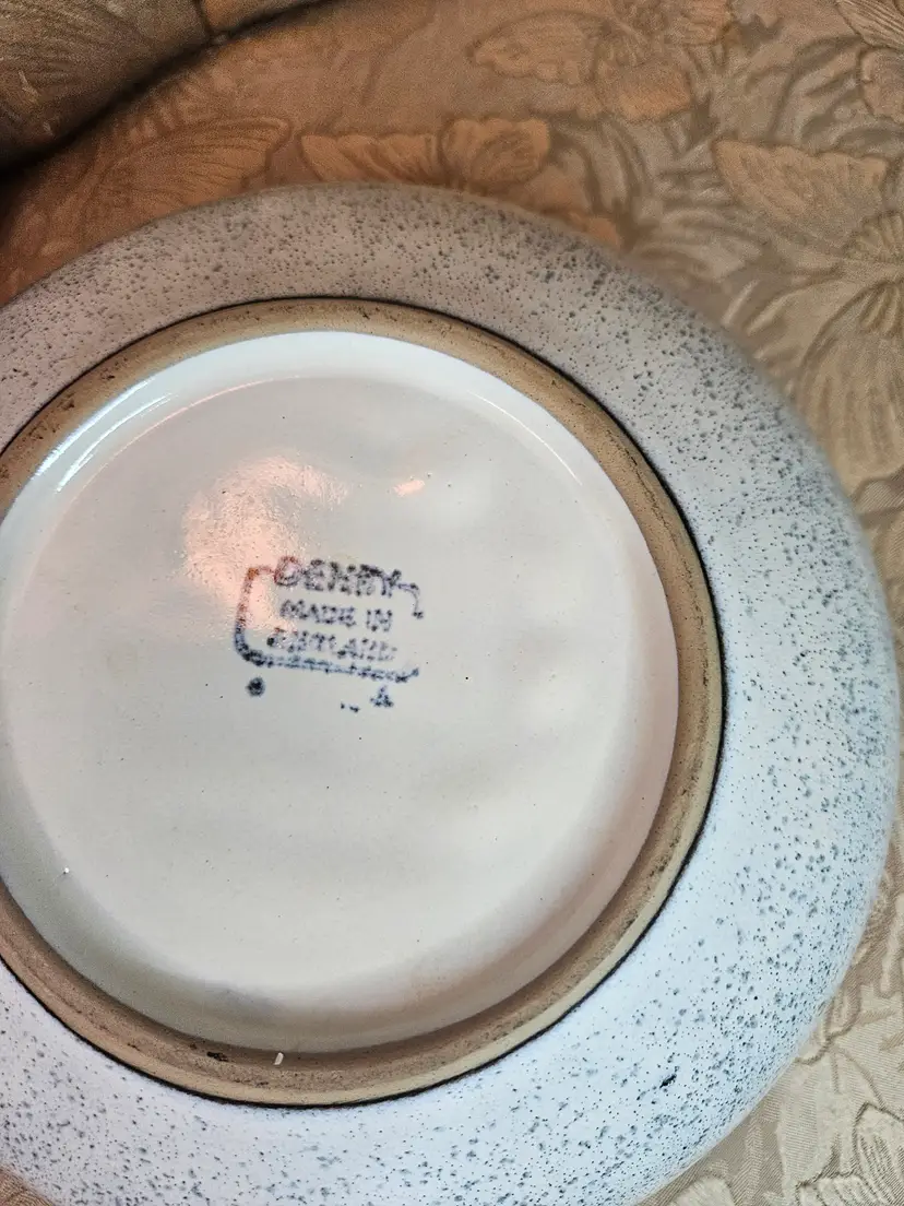 This vintage Denby Studio Bowl and Oval Plate Set is a charming addition to any table setting. Made in England from stoneware, this set includes a bowl and an oval platter, all featuring a classic vintage pattern. The Denby brand is known for its quality craftsmanship, making this set both practical and aesthetically pleasing for serving meals or displaying decor in your home. Made in England adds a touch of authenticity and heritage to this timeless collection.