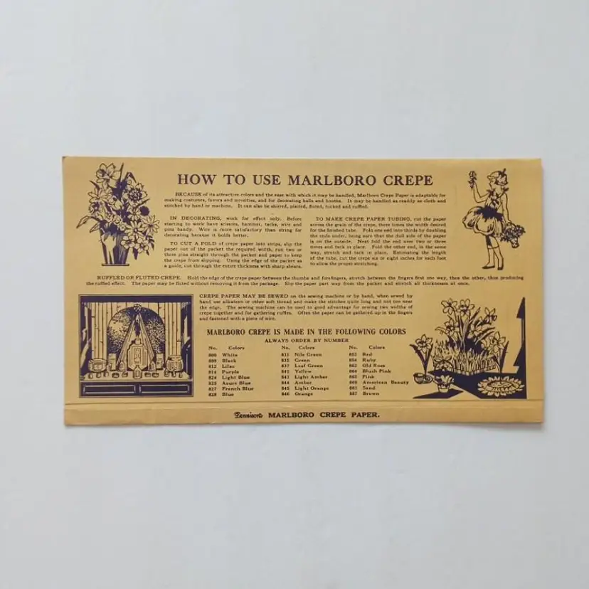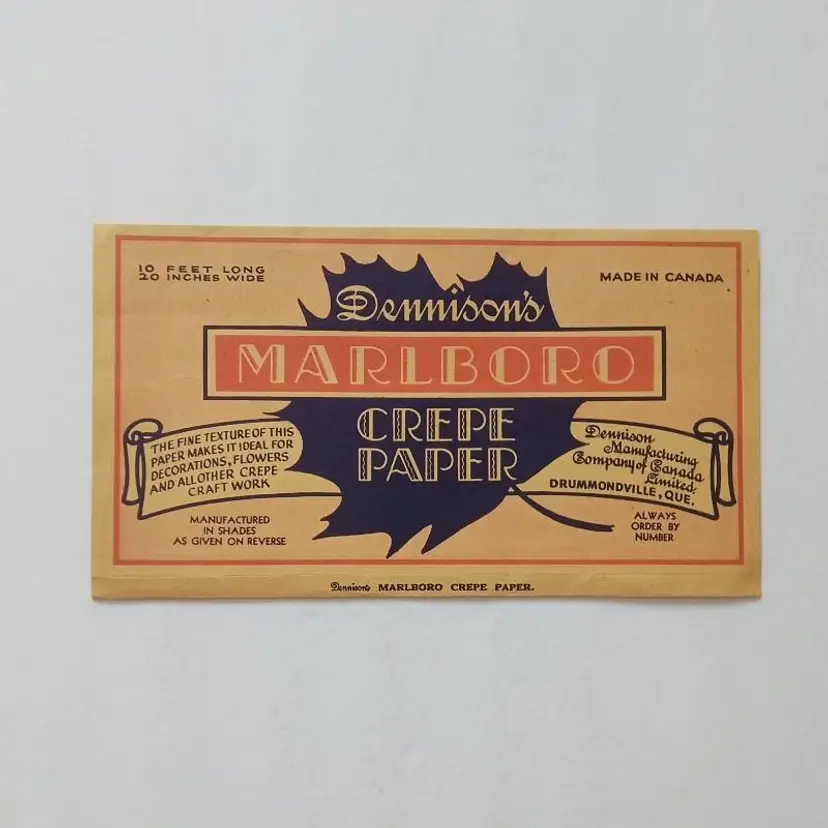 Embrace the charm of yesteryear with this authentic Dennison's Canada Marlboro Crepe Paper Wrapper Package Label, a splendid piece of advertising memorabilia. Originating from Drummondville, Quebec, this vintage label reflects a bygone era of packaging design, showcasing the renowned Dennison Manufacturing Co. of Canada Ltd. brand. Measuring at a convenient 5 x 9 inches, the label's vibrant multi-color scheme captures the eye, making it an ideal display item for collectors and enthusiasts alike. Whether it's to adorn a scrapbook, personalize a wall, or enhance a collection, this Canadian-made gem offers a touch of historical flair.