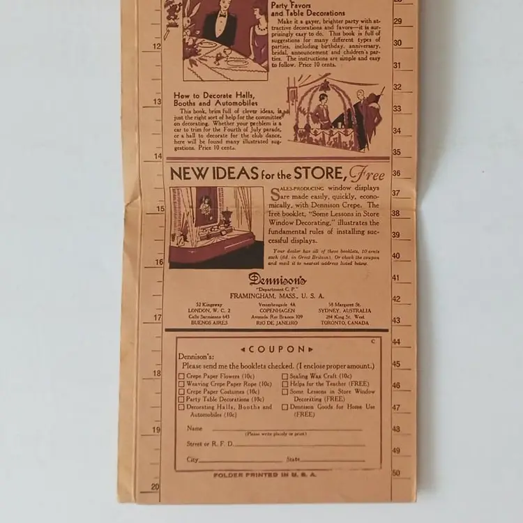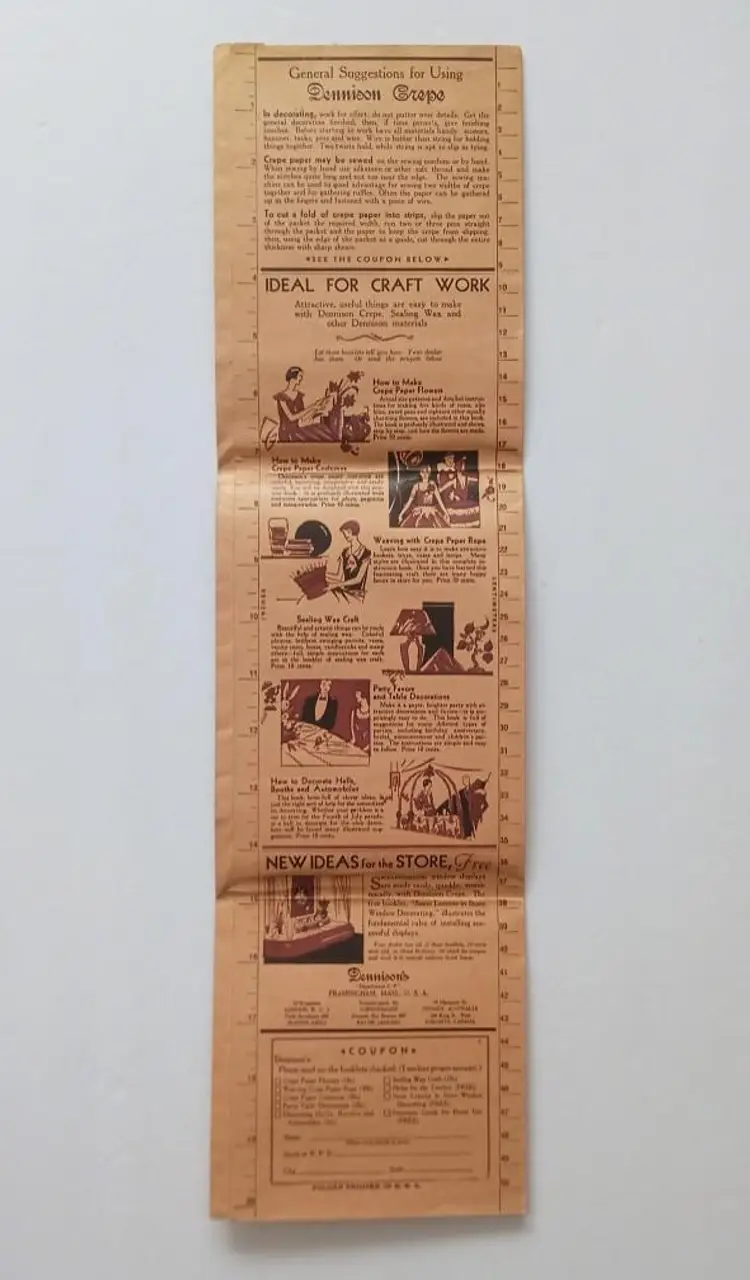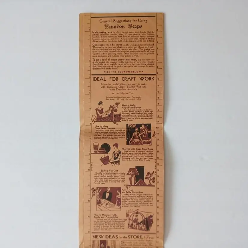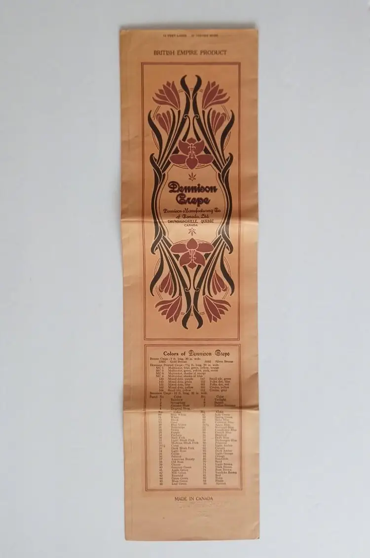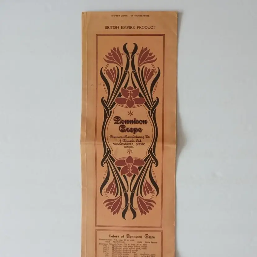 Discover a piece of history with the Vintage Dennison Canada Crepe Wrapper Package Label, a charming relic from the Dennison Manufacturing Co. of Canada Ltd. This multi-colored packaging label measures 5.5 x 20 inches, showcasing the intricate design and vibrant hues that must have caught the eye of customers in the British Empire era. Crafted with care in Drummondville, Quebec, this label not only represents a bygone era of advertising but also serves as a testament to the craftsmanship of the time. Ideal for collectors and enthusiasts of vintage Canadian memorabilia, this unique item offers a glimpse into the past and the everyday life of a previous century.