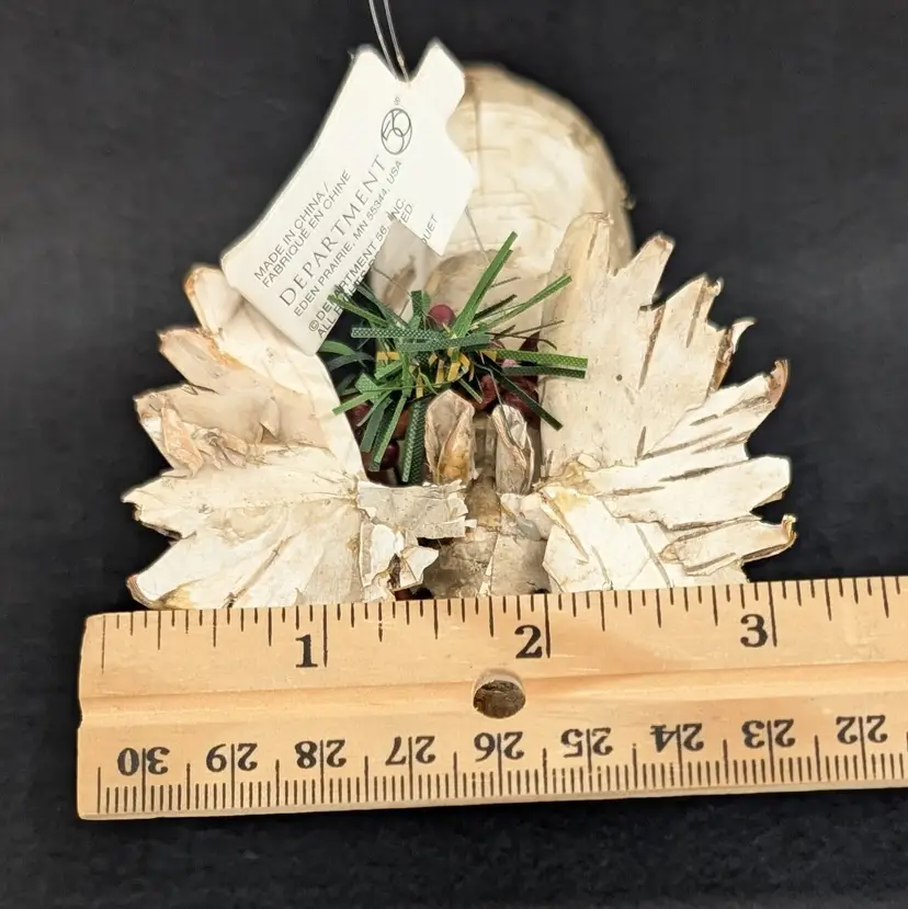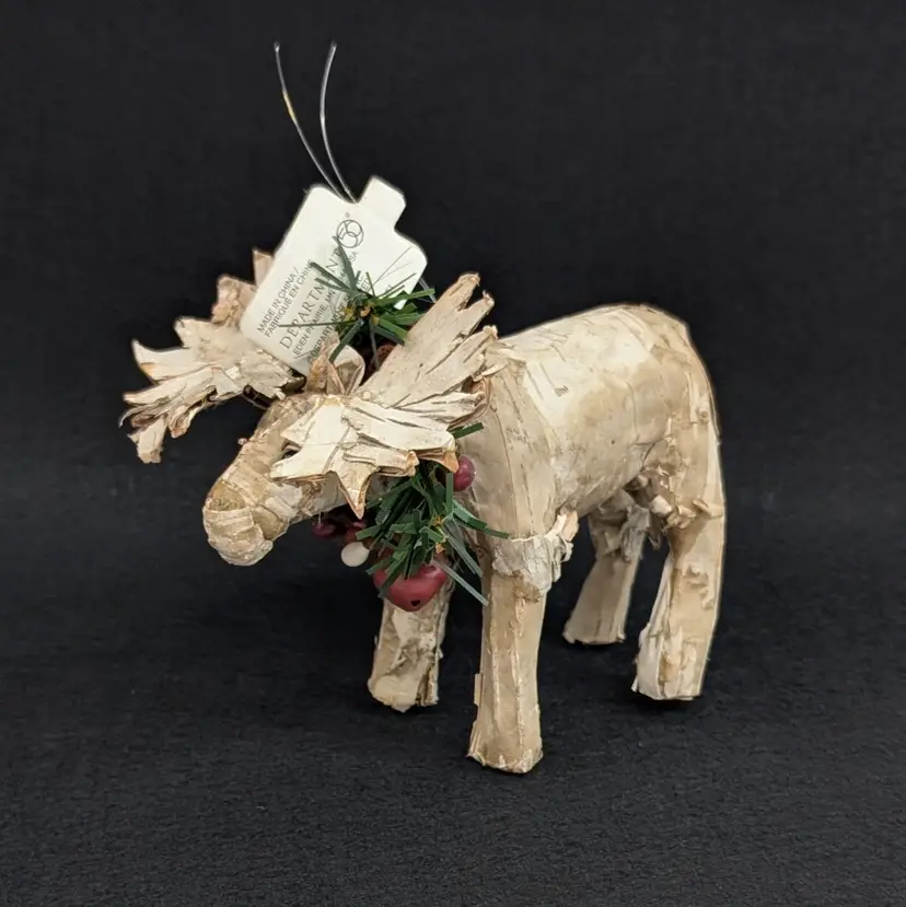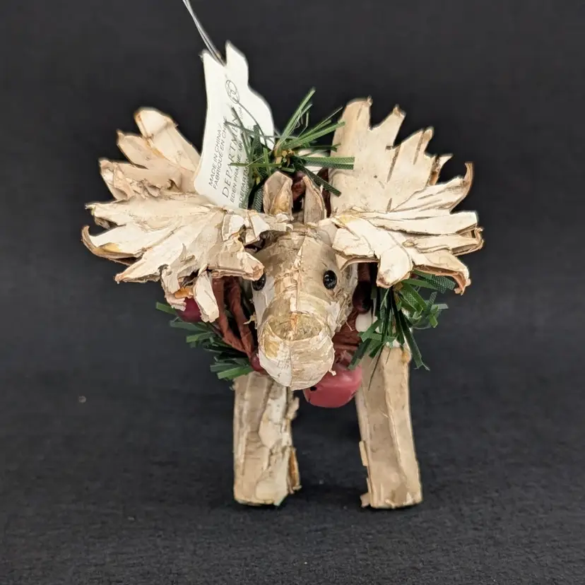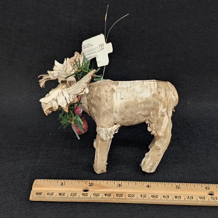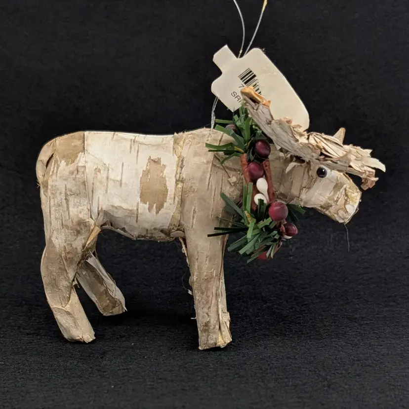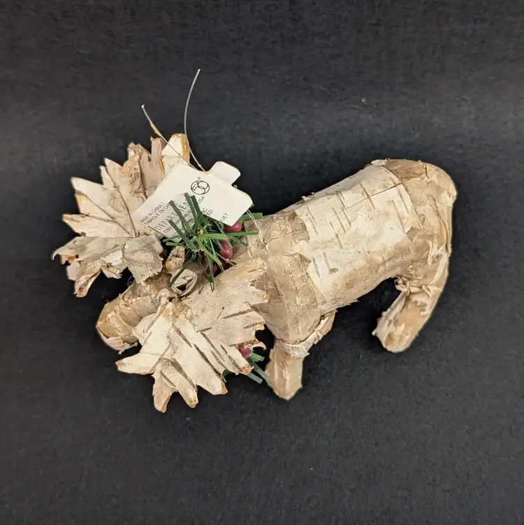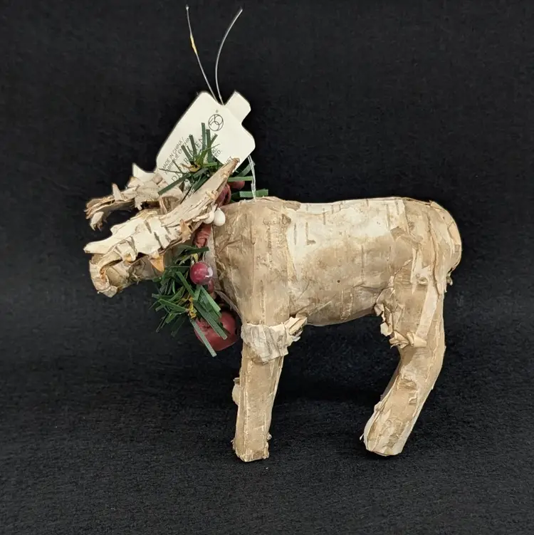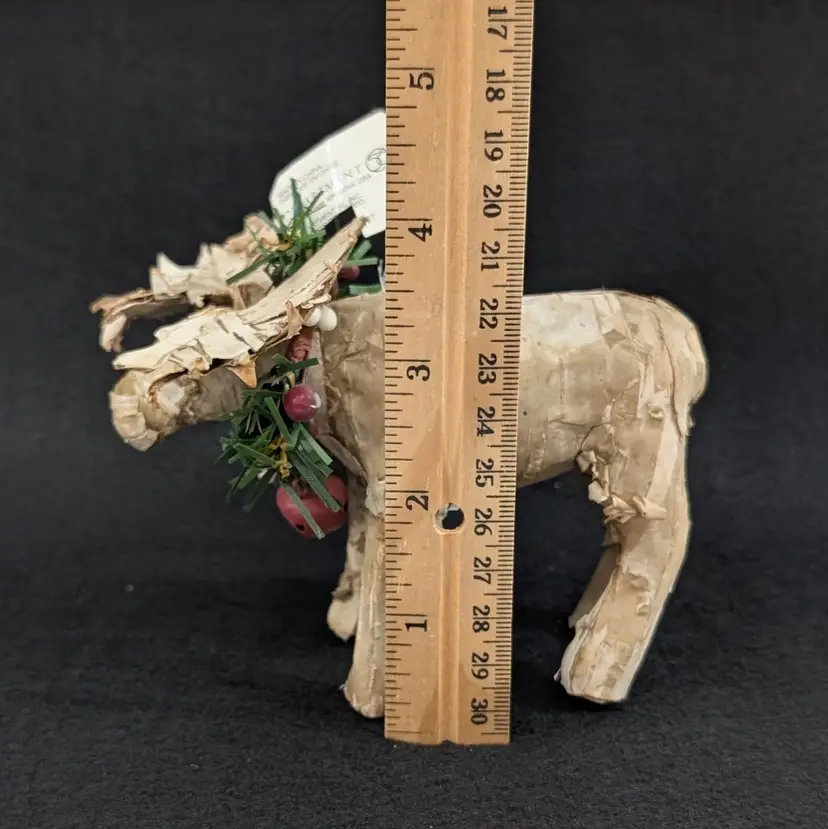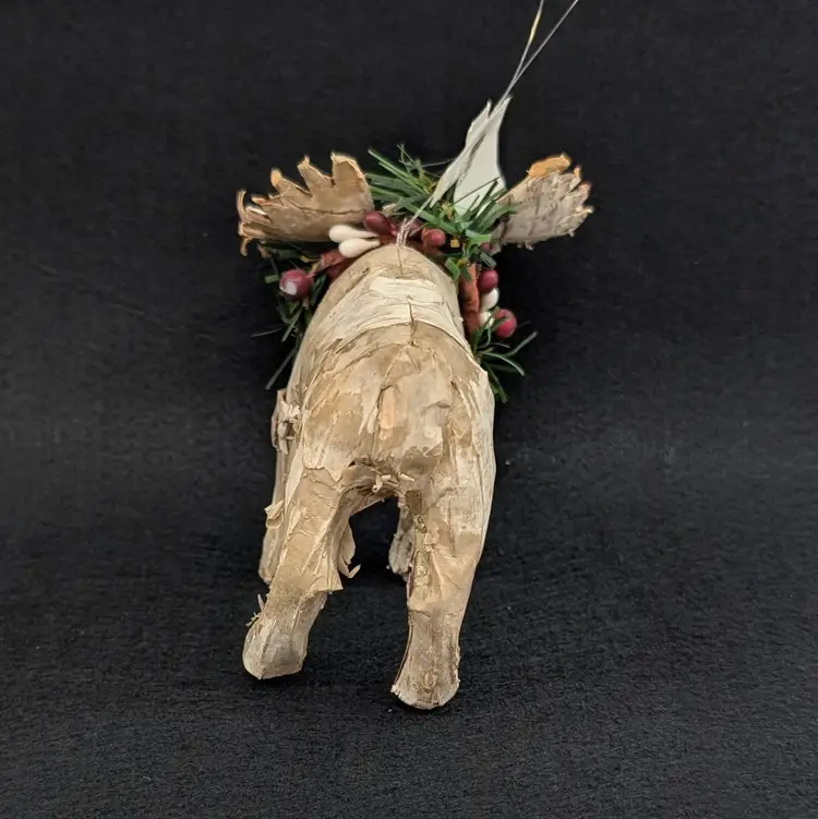 Cute, moose covered in birch bark for a nice rustic finish. He also has a wreath with berries and a bell on his neck. In nice, vintage condition but is a little wobbly as a figurine and there's a little wear to one of the berries. Add a ribbon or hanger to turn into an ornament. Measurements ~ 5 x 3 x 4"