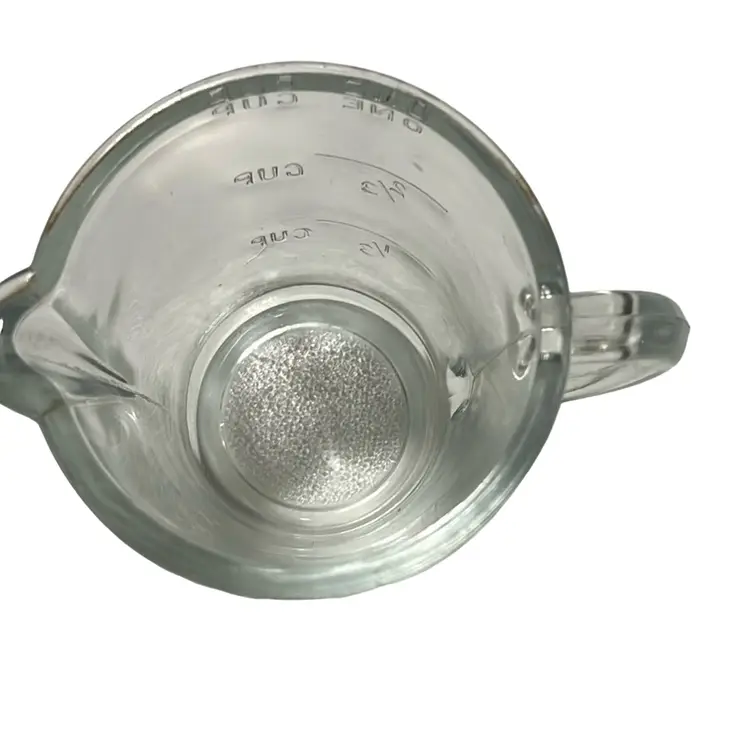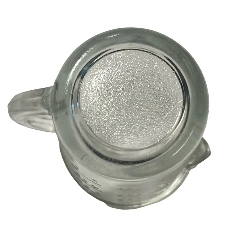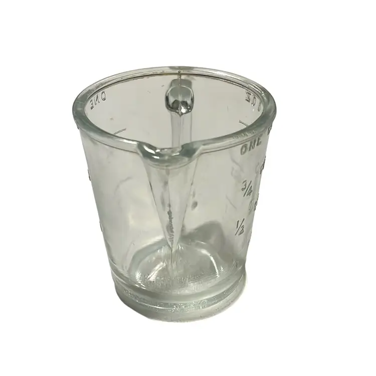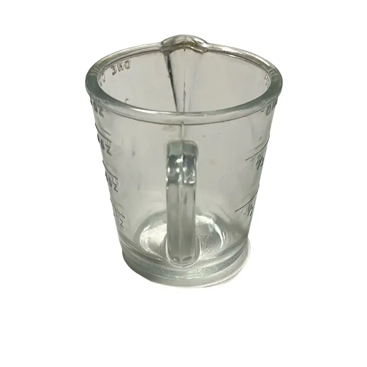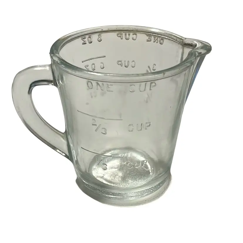 Clear embossed glass, -3/8” tall, one cup capacity. Great condition for age, no chips or cracks. Bottom has orange-peel texture.