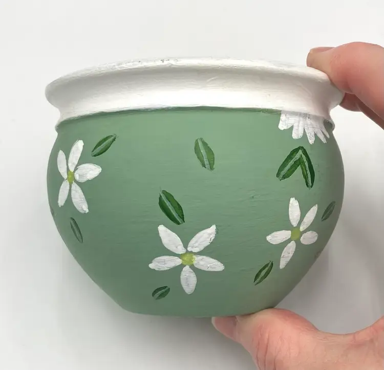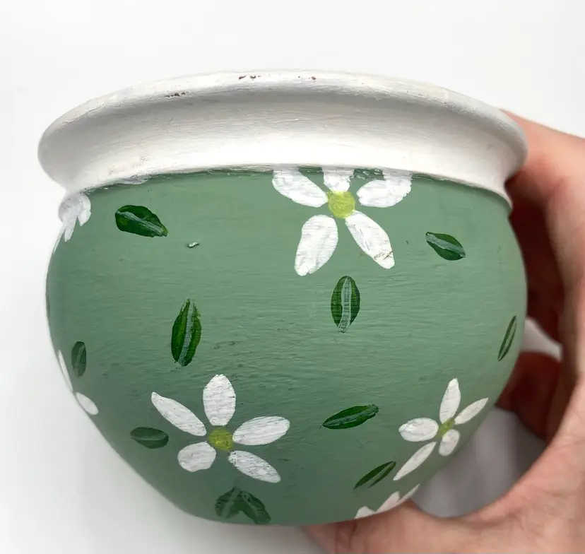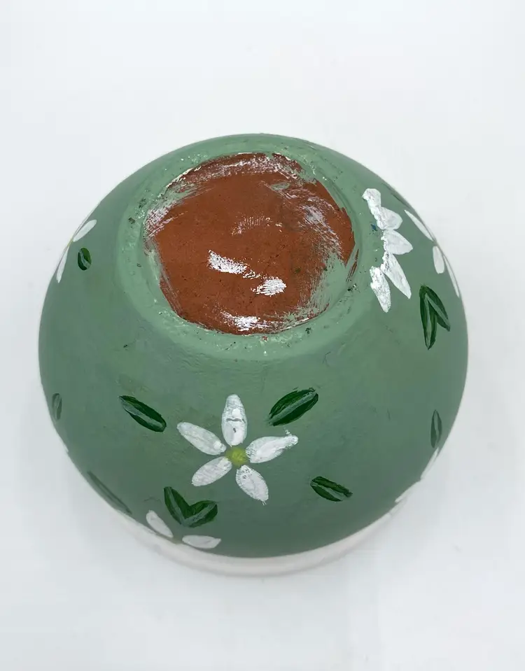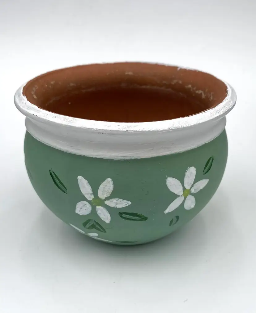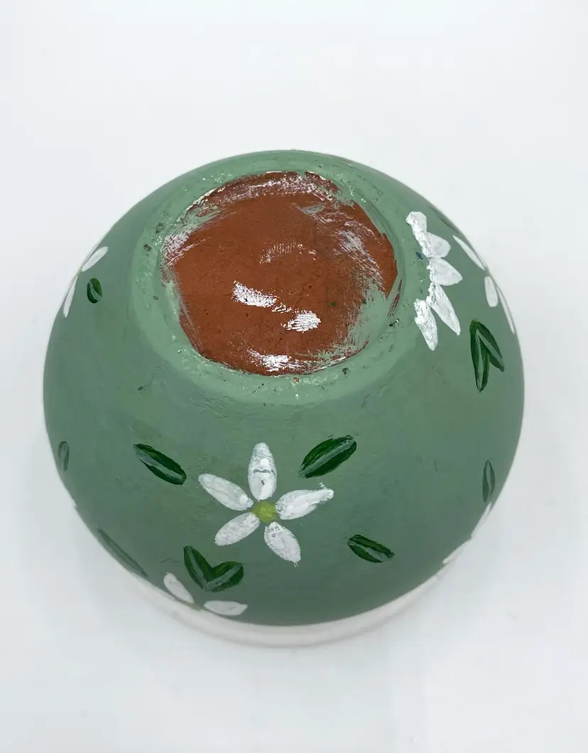 This vintage Deroma Pottery Terra Cotta planter from Italy is hand-painted in a beautiful green color with white and yellow daisies in a matte finish. The small round planter, measuring 4 inches in width and nearly 3 inches in height, is ideal for indoor use.