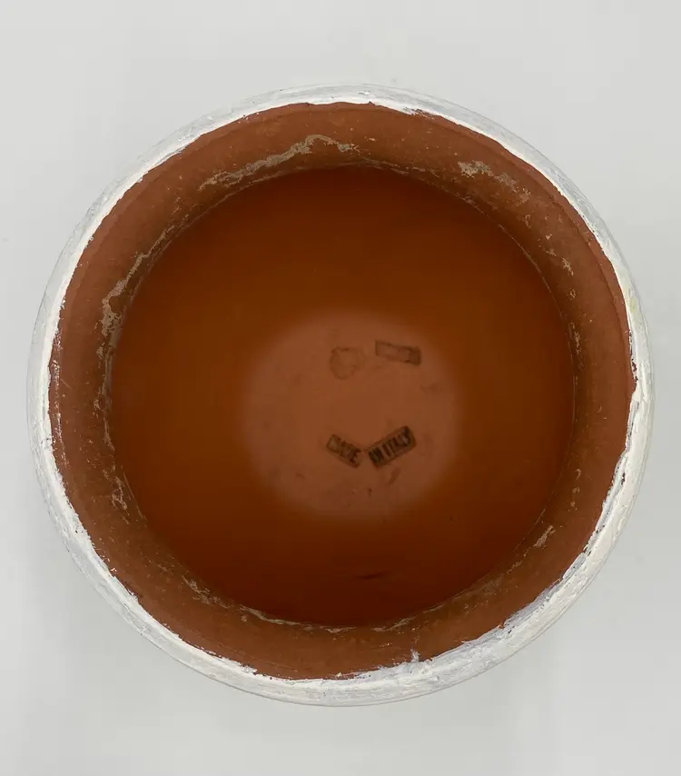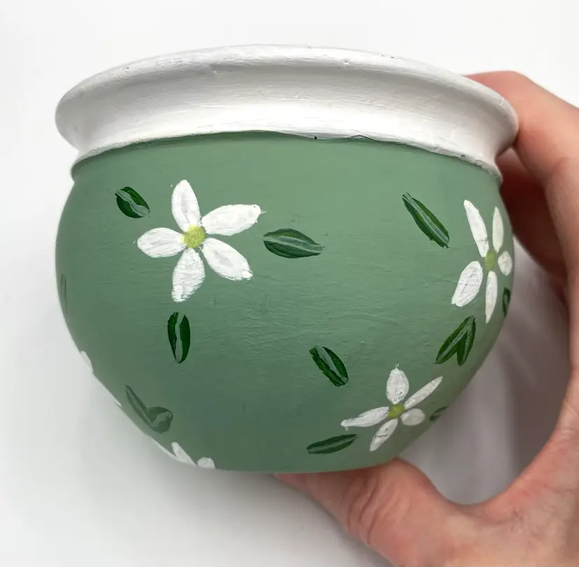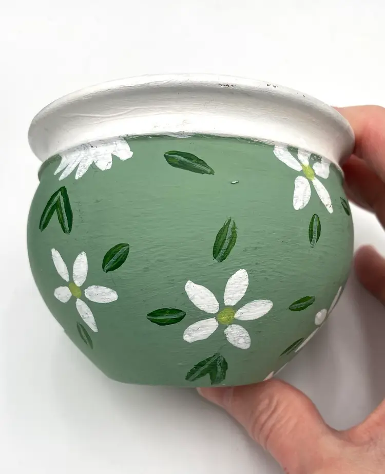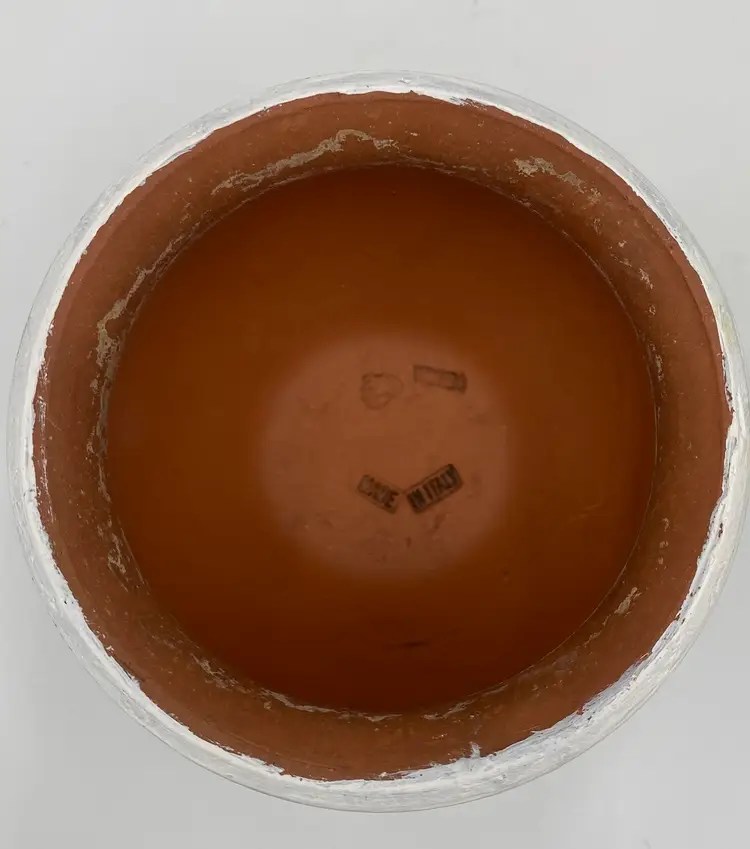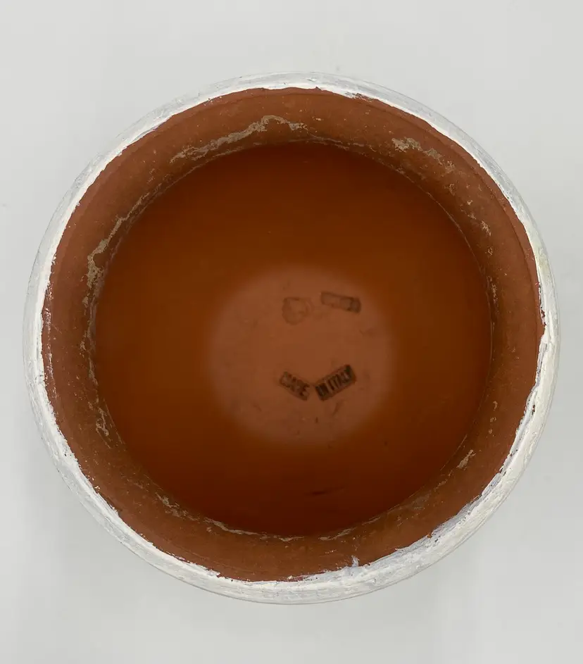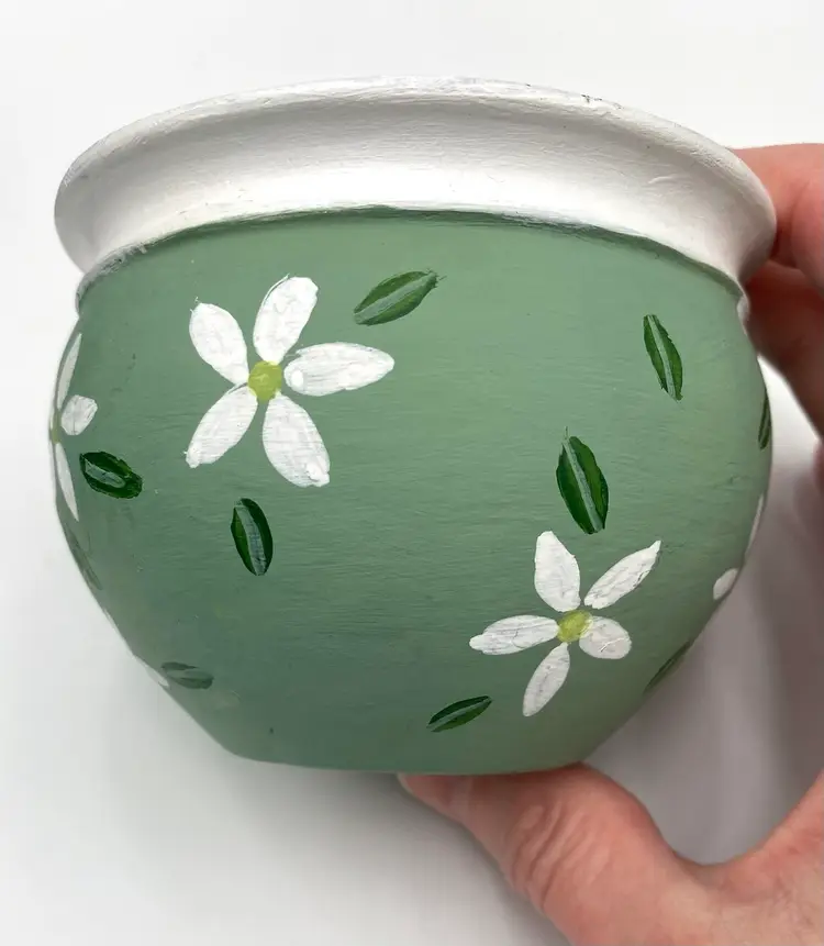 This vintage Deroma Pottery Terra Cotta planter from Italy is hand-painted in a beautiful green color with white and yellow daisies in a matte finish. The small round planter, measuring 4 inches in width and nearly 3 inches in height, is ideal for indoor use.