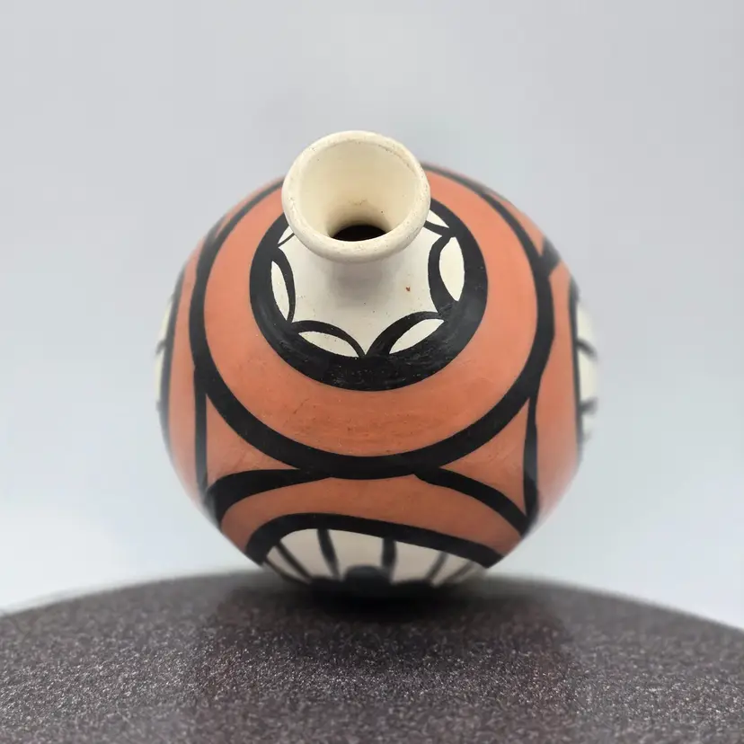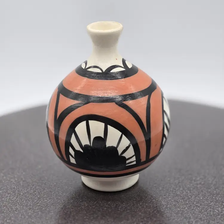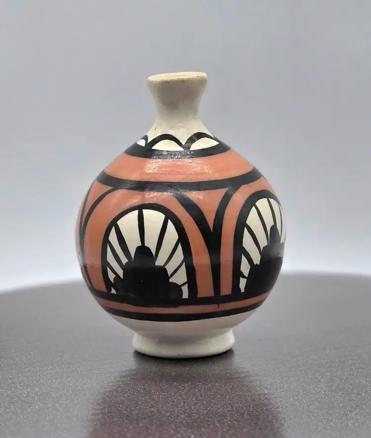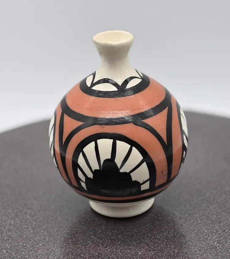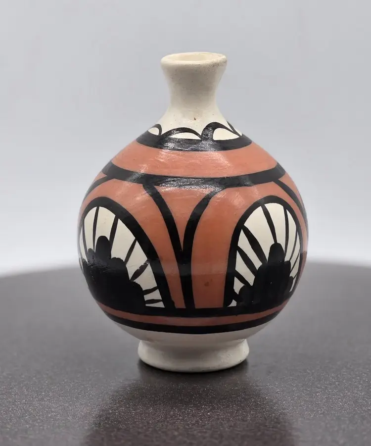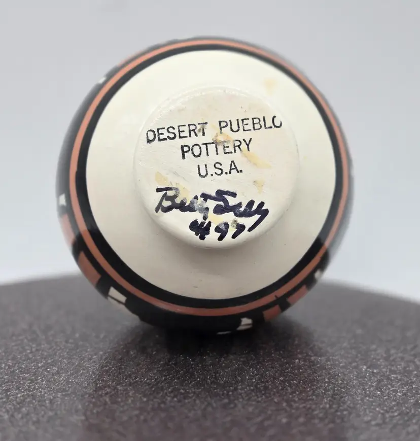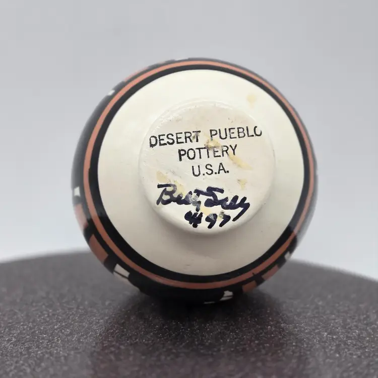 Vintage Desert Pueblo Pottery Signed Betty Selby 4.5” wide x 3.25" tall. Hand Painted. Weed pot style. Signed and Numbered 497. Good vintage condition. No chips, cracks or crazing. Sticker residue on bottom is from original sales sticker. I don’t want to risk washing signature. Please see photos as they are part of the description. I will combine items, where possible, and refund part of second shipping fee. Item will be well packed for shipping.