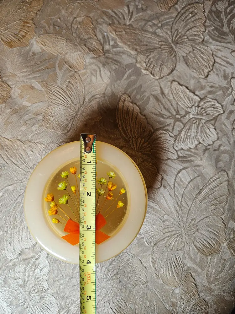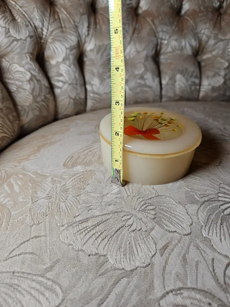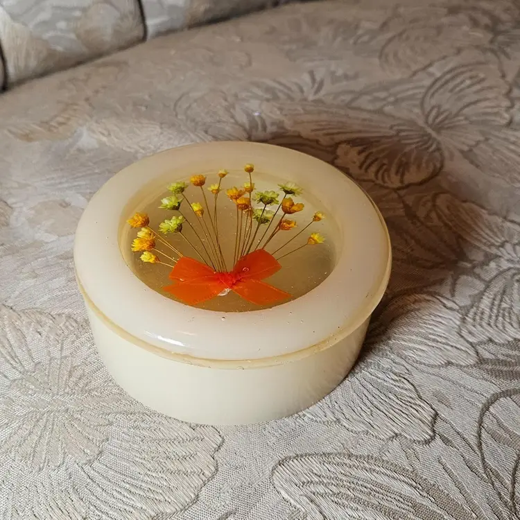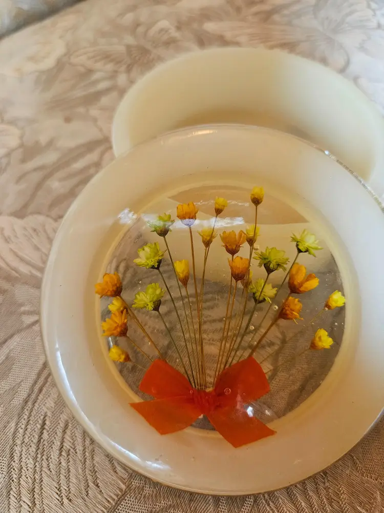 Charming vintage trinket box featuring dried flowers and a bow encased in resin. Perfect for storing small treasures. No chips or cracks.