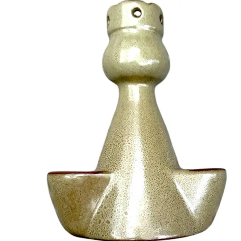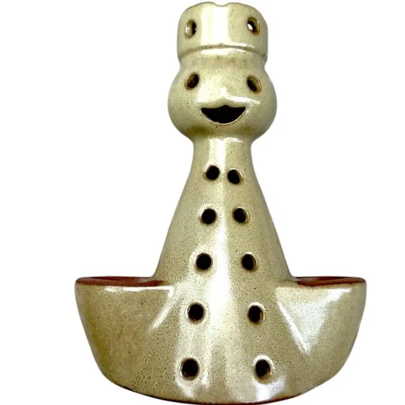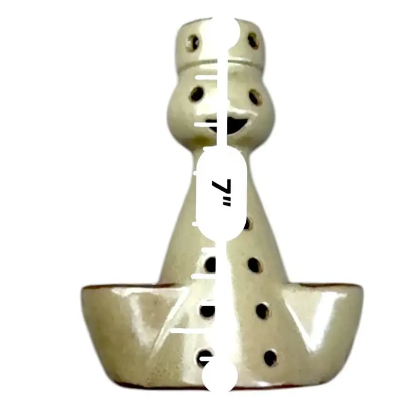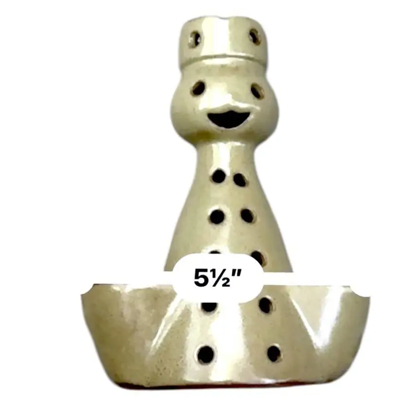 Charming ceramic candle holder designed as a smiling snowman. Perforated design allows light to shine beautifully. Ideal for seasonal or rustic decor.