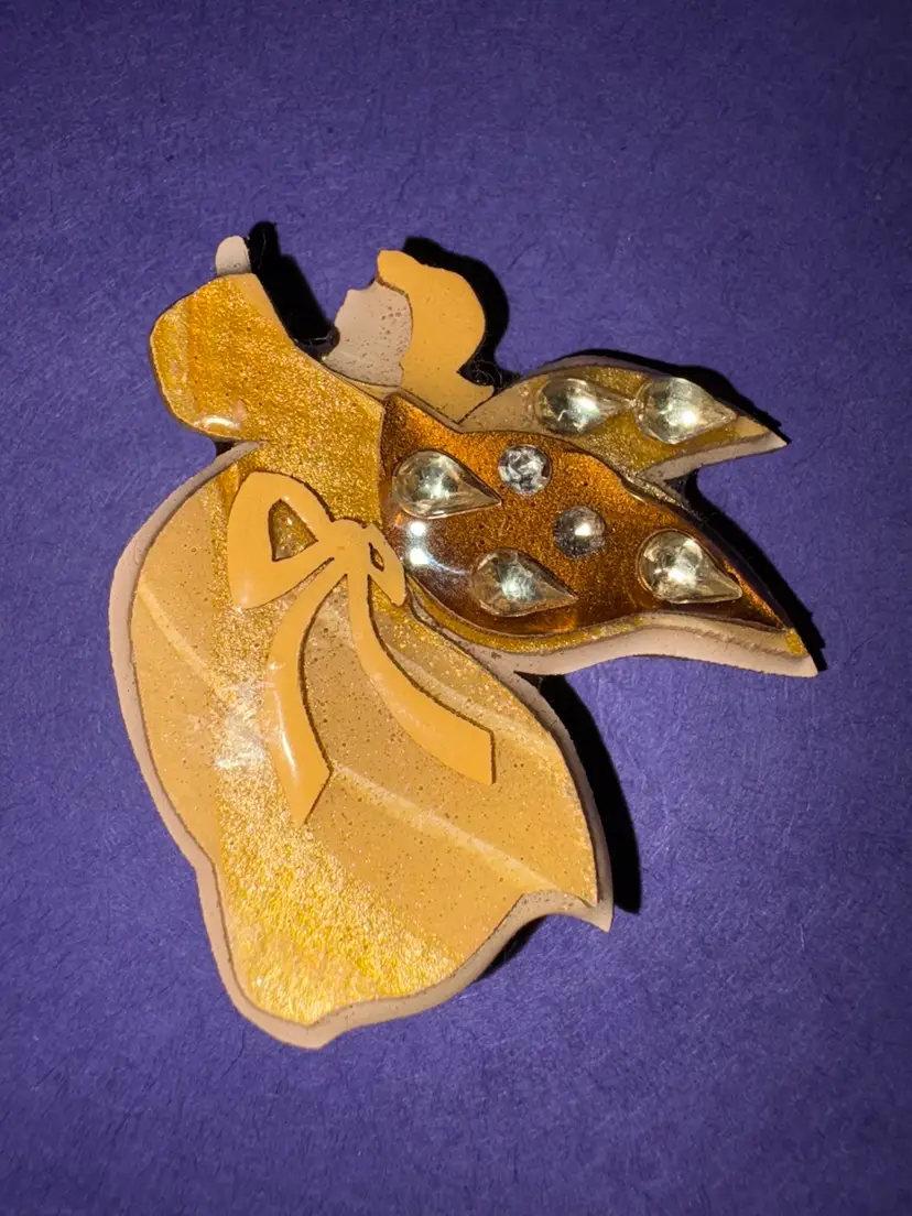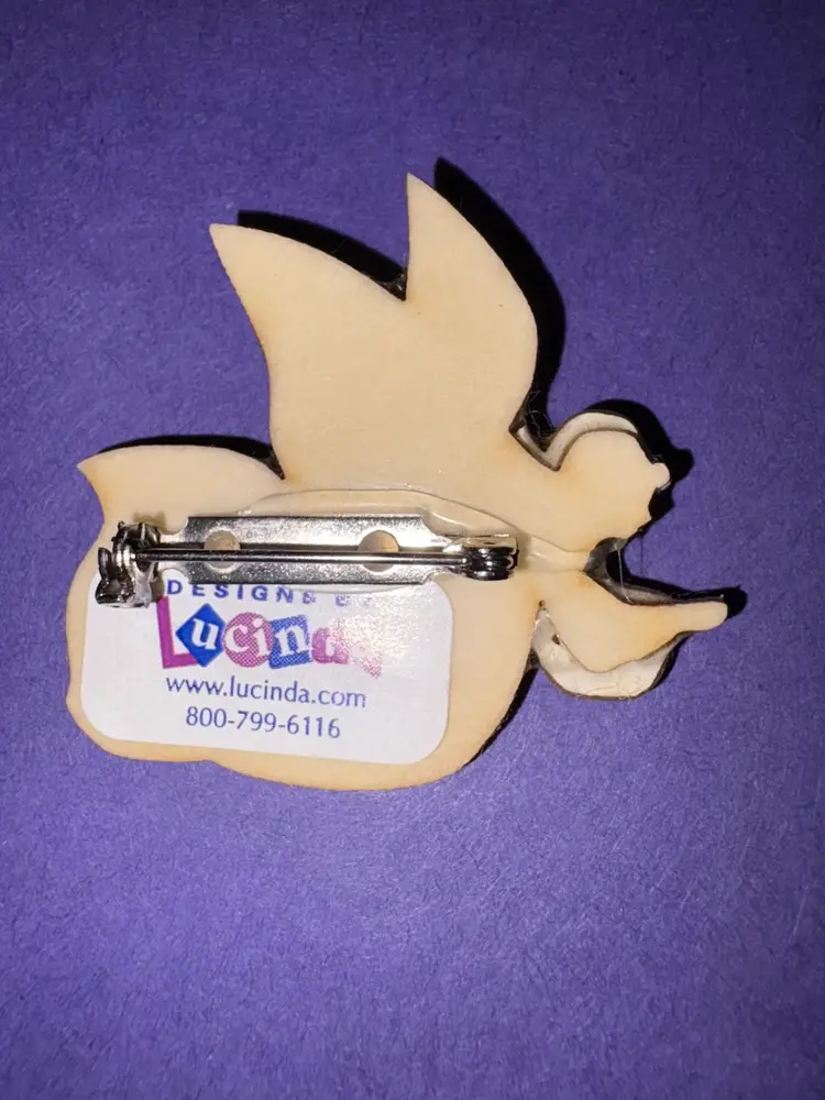 Pin is very detailed and dimensional and is in excellent vintage pre-owned condition. This is a lovely Golden Shimmering Angel with clear rhinestones on her wings. Includes ‘Designs by Lucinda’ sticker on back.