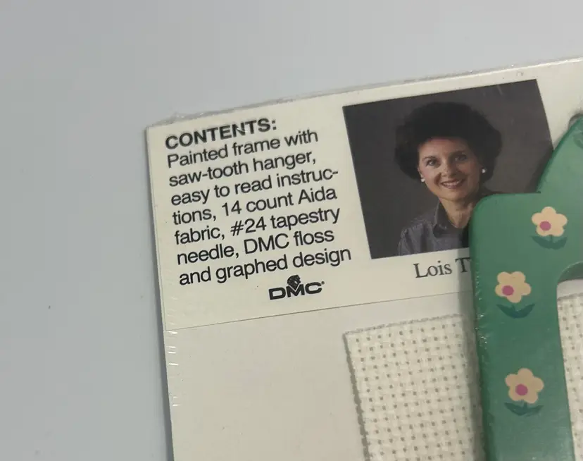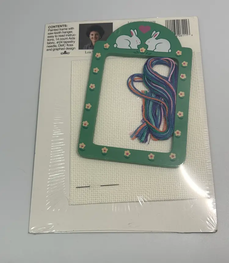 Includes: Painted frame with saw tooth hanger, 14 count aida fabric, #24 tapestry needle, DMC floss, graphed designs, instructions
