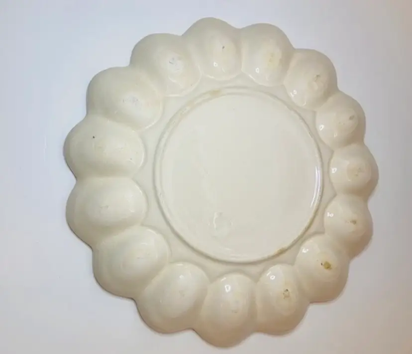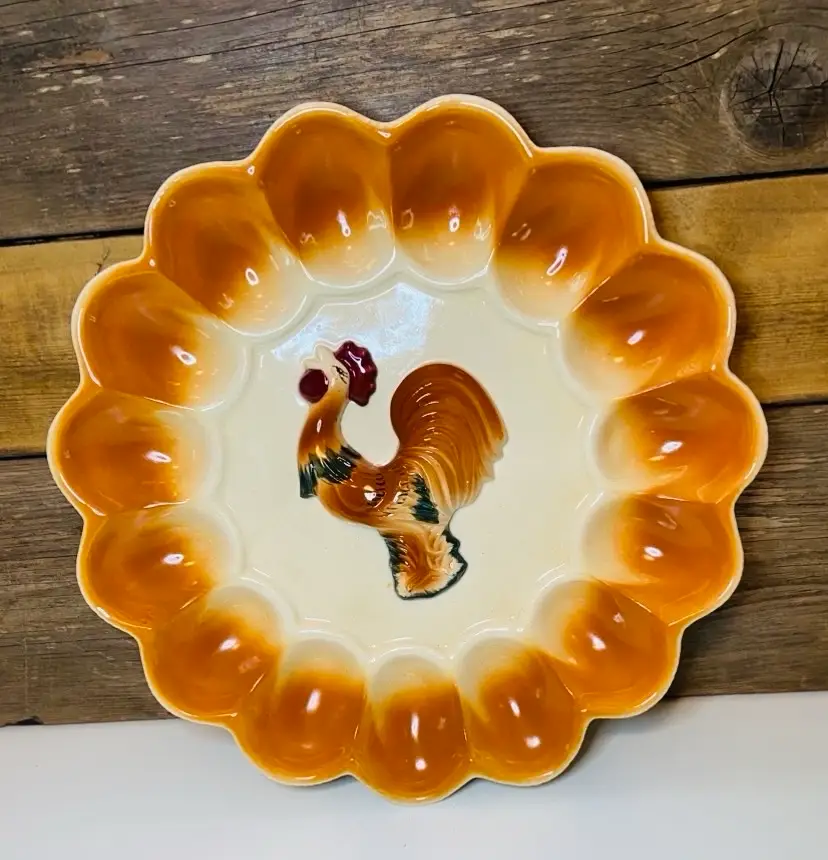 A charming and eye-catching vintage majolica deviled egg serving platter featuring a detailed rooster centerpiece. Crafted in richly glazed ceramic. Holds 15 eggs. In good used condition. No chips or cracks.