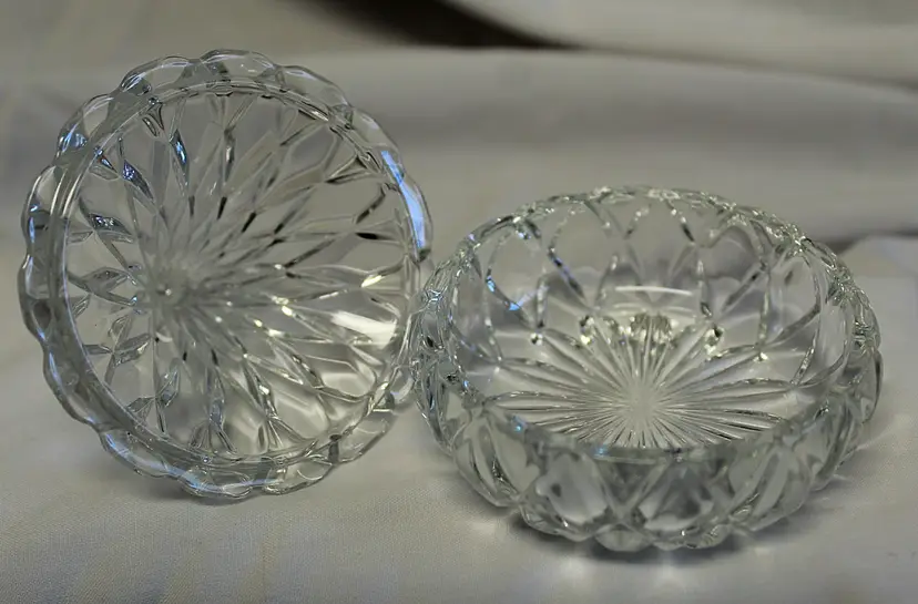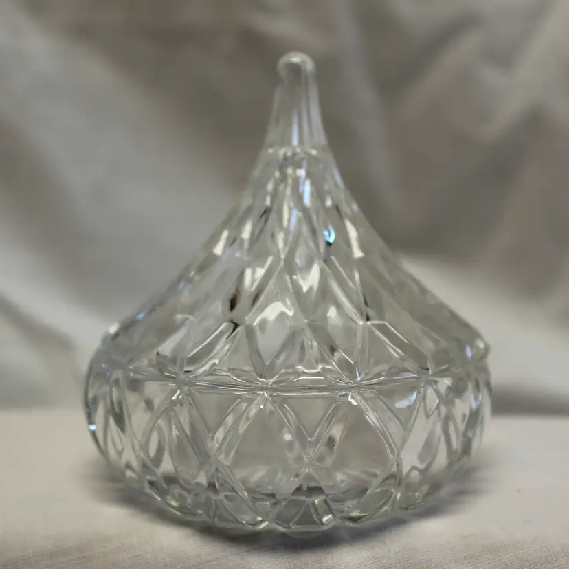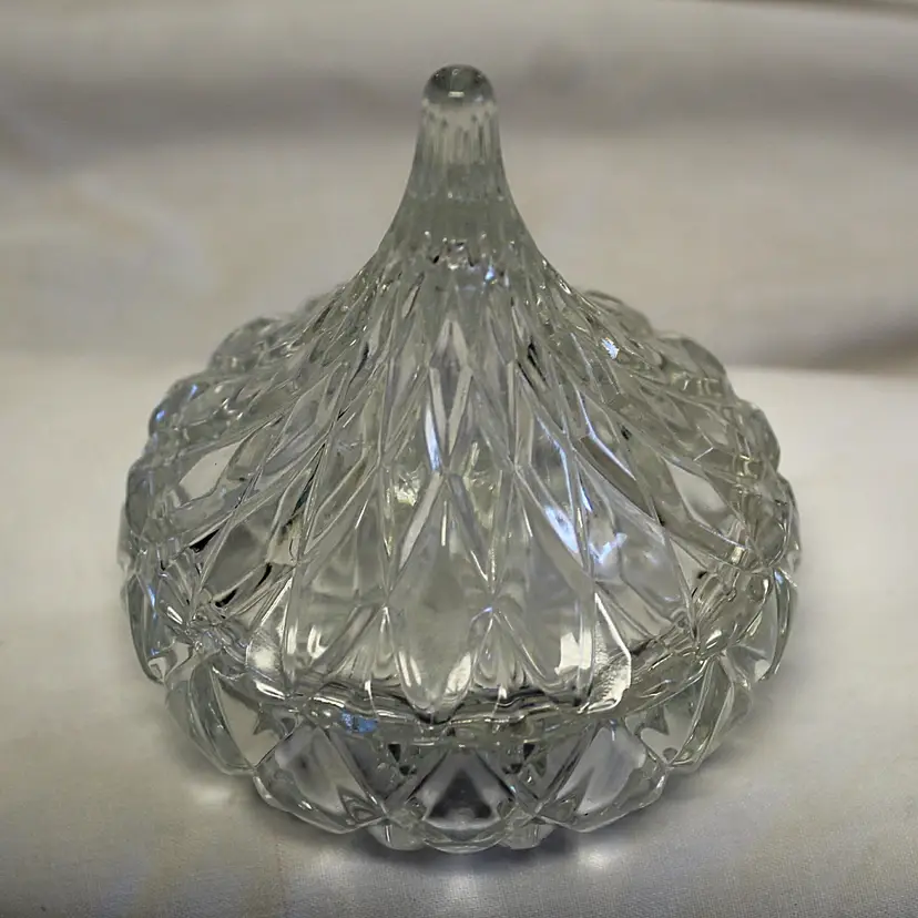 Add a touch of elegance to your home with this vintage diamond-cut glass candy dish. Perfect for storing sweets or small trinkets, this piece features a unique teardrop lid design. A charming addition to any tabletop or display.