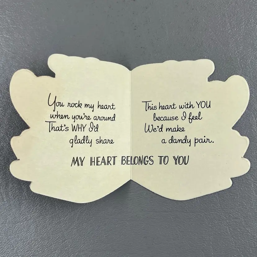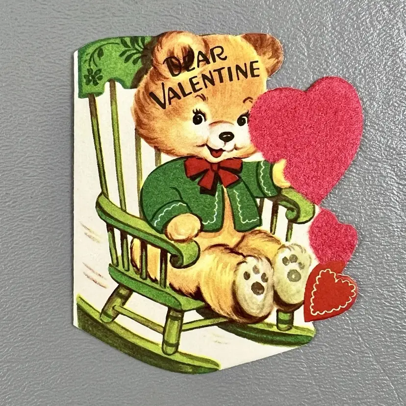 Vintage Die Cut Valentine Card Bear Rocking Chair Hearts Your Rock My Heart 3.25"