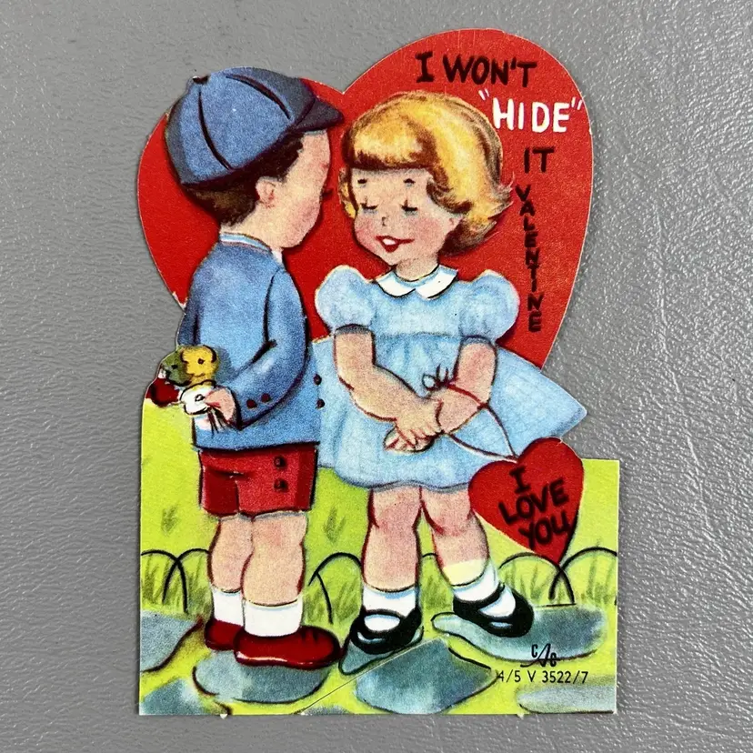 Vintage Die Cut Valentine Card Boy & Girl Heart I Won't Hide It I Love You 3.75"